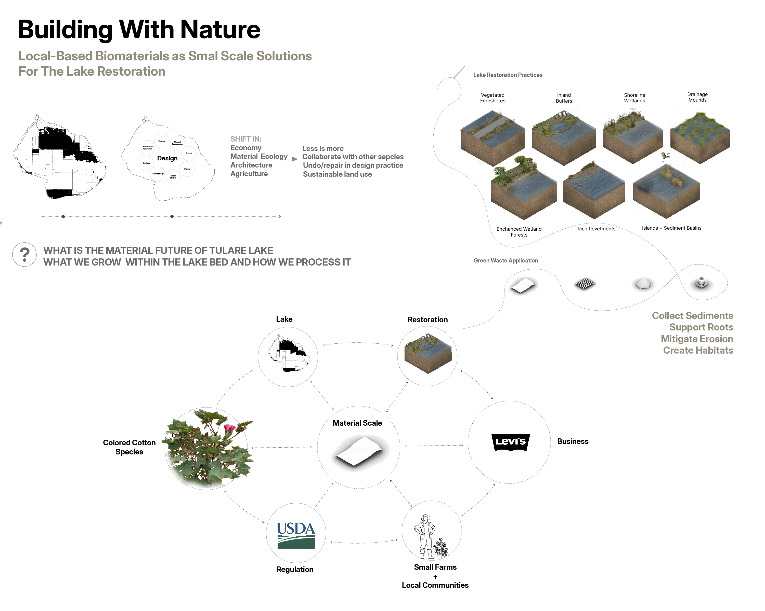 Proposed future scenarios for the lakebed envision a coexistence of water, humans, and other species, viewed from a material design perspective. On the right scale, biocomposites can recombine elements of this complex system.