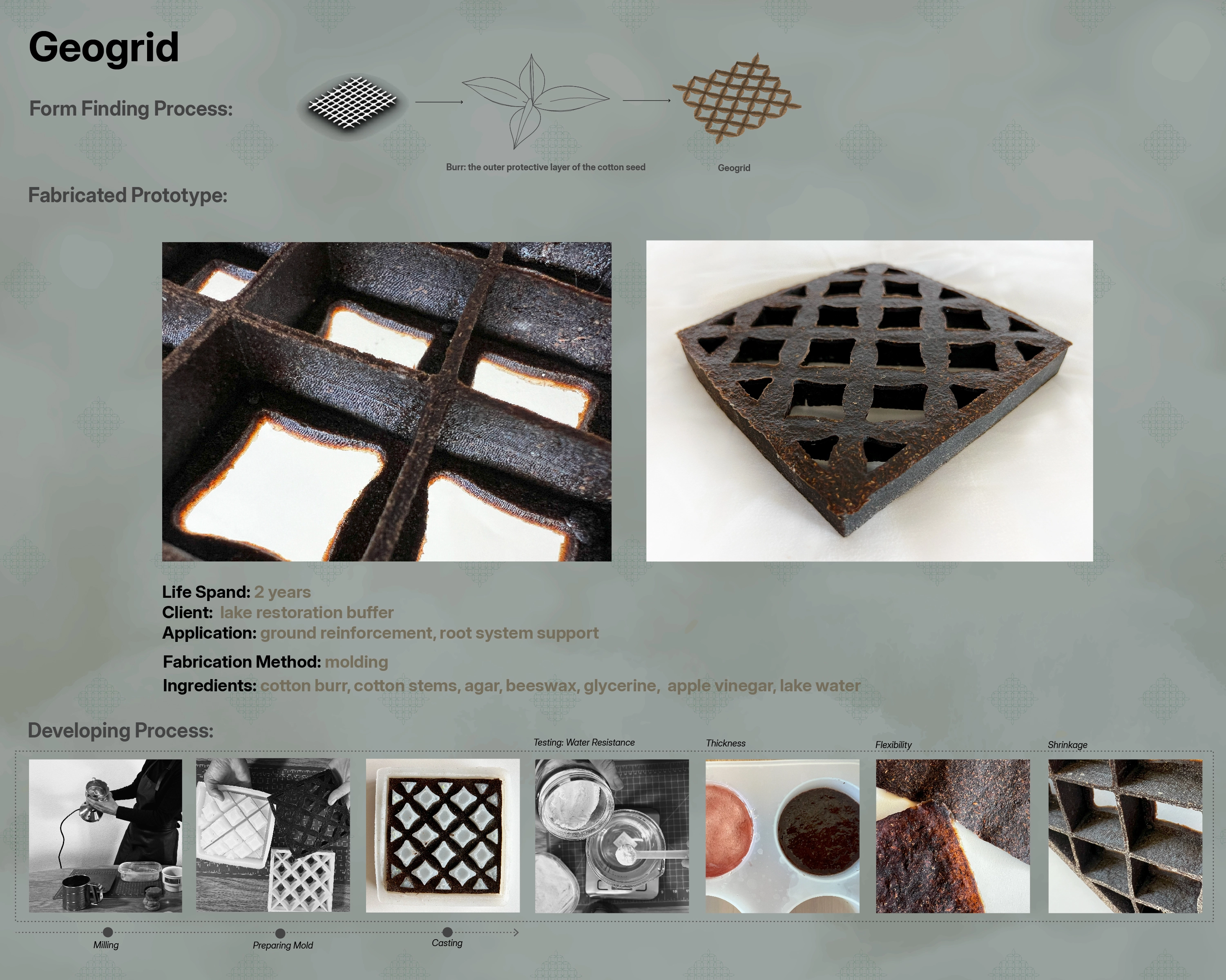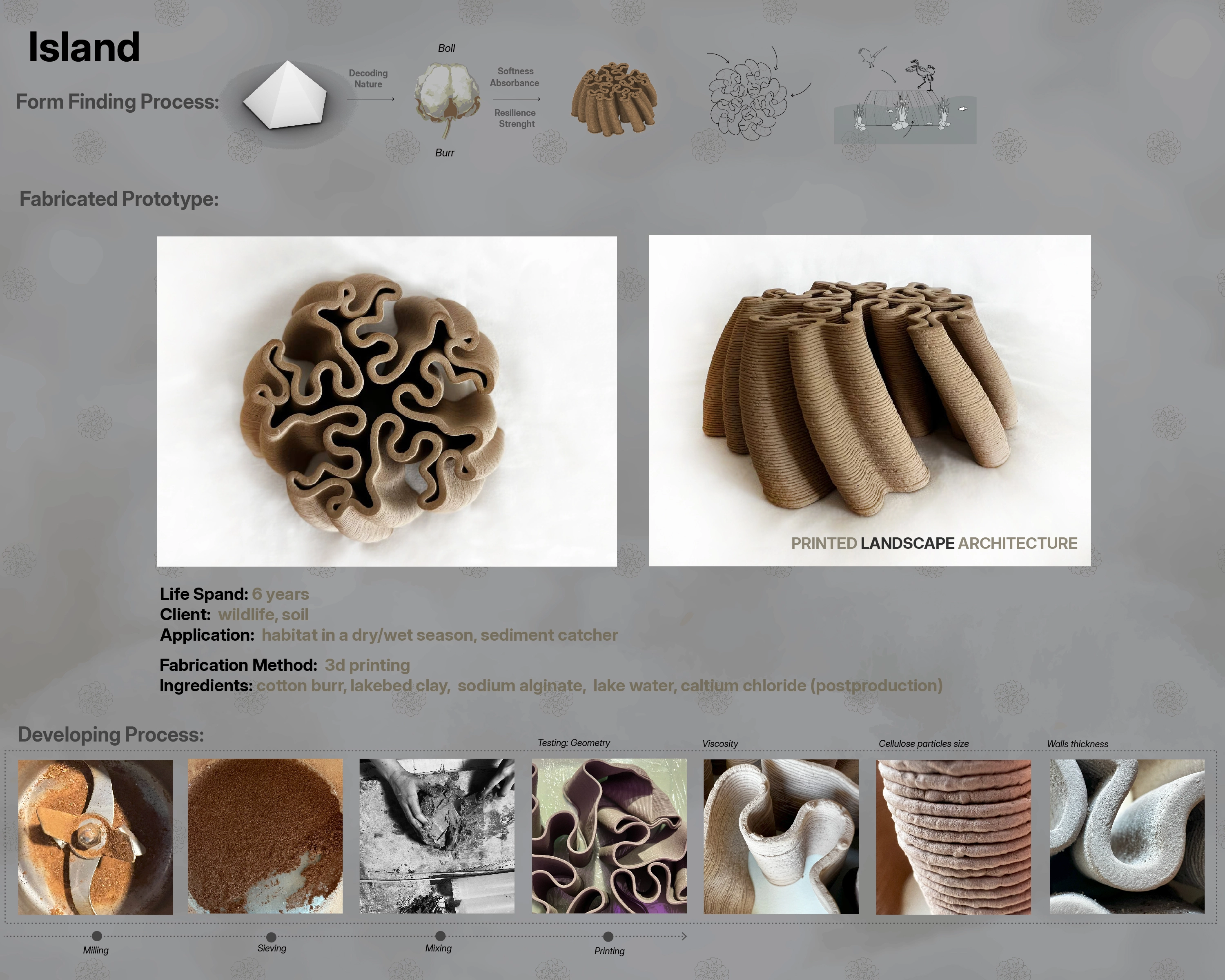 The research involves experimenting with secondary cellulose transformations through recipes and digital and physical fabrication methods, developing and testing new materials. This material-driven design process is connected with lake restoration, proposing small-scale alternative water infrastructure built with nature. A product line was developed to aid lake restoration, based on the physical features of combined aggregates like texture, flexibility, viscosity, and water resistance, showing the variations and flexibility of biomaterials and their potential to replace unsustainable solutions like concrete. These cotton-based products are more responsive to the lake ecology and agricultural needs.