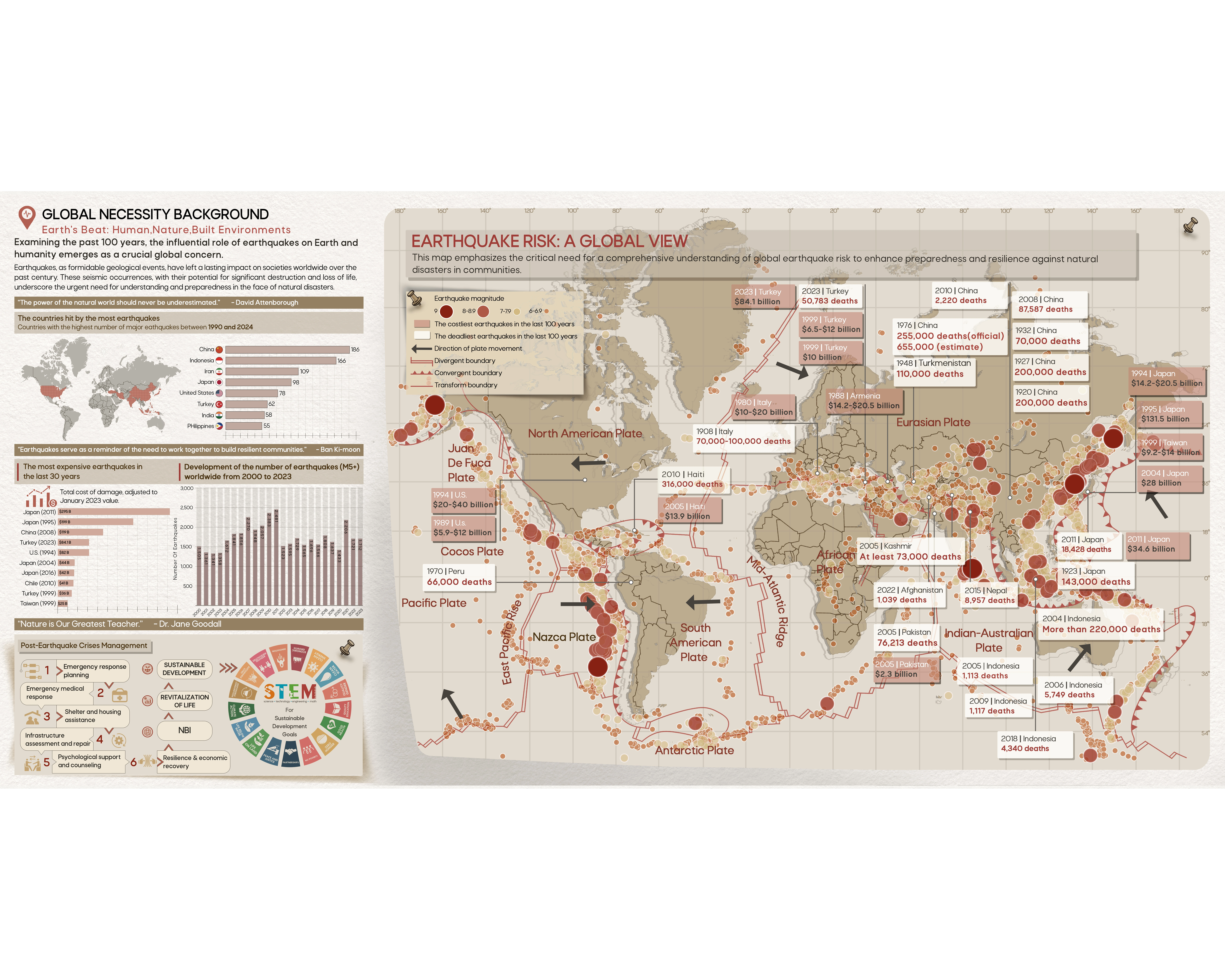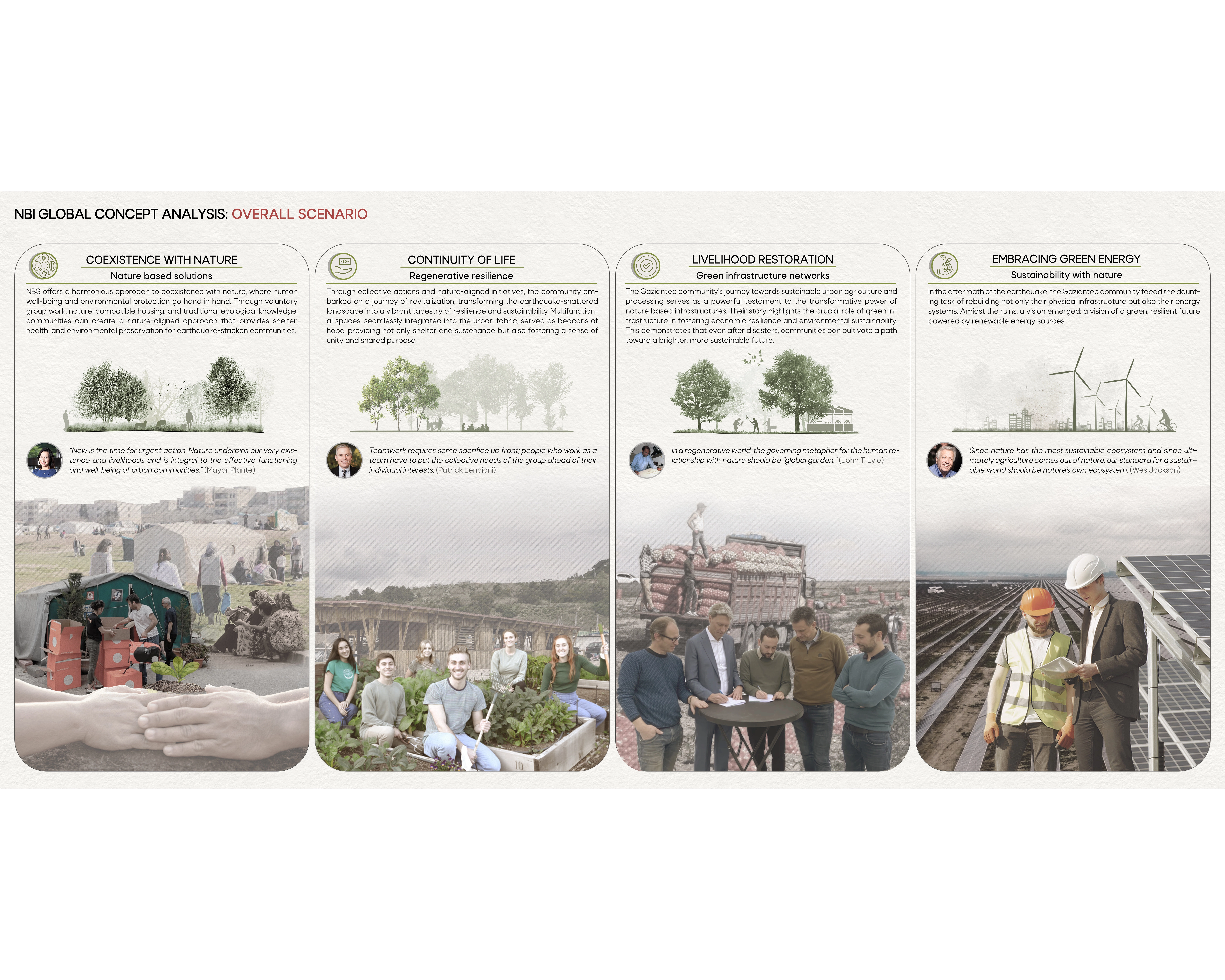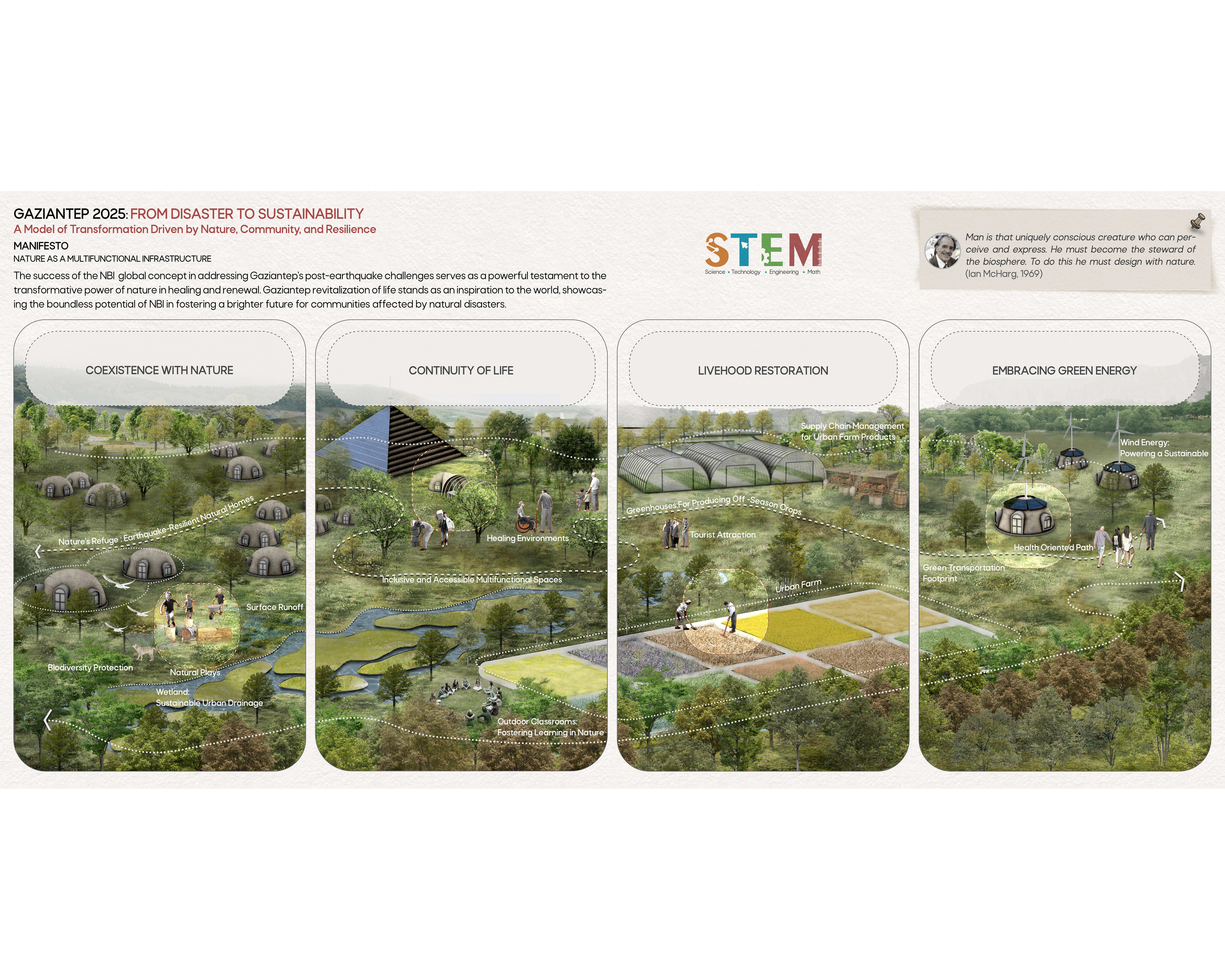 This project encompasses a comprehensive study of nature-based infrastructures (NBI) global concept that leverages the unique opportunities presented by nature to address the city's post-earthquake challenges. We are visually oriented people, with the tools of art and knowledge of natural science, produce creative works that improve people’s lives and the health of our planet [1]. Leveraging nature's ability to provide ecosystem services, the strategy tackles multifaceted challenges like infrastructure damage, environmental degradation, and socioeconomic disruption. Ecological planning encompasses a broad spectrum of natural, biological, and social sciences that are aligned with ecological perspectives [2].By integrating NBI into planning and design, cities can rebuild and emerge more adaptable to future natural disasters.Project Goals