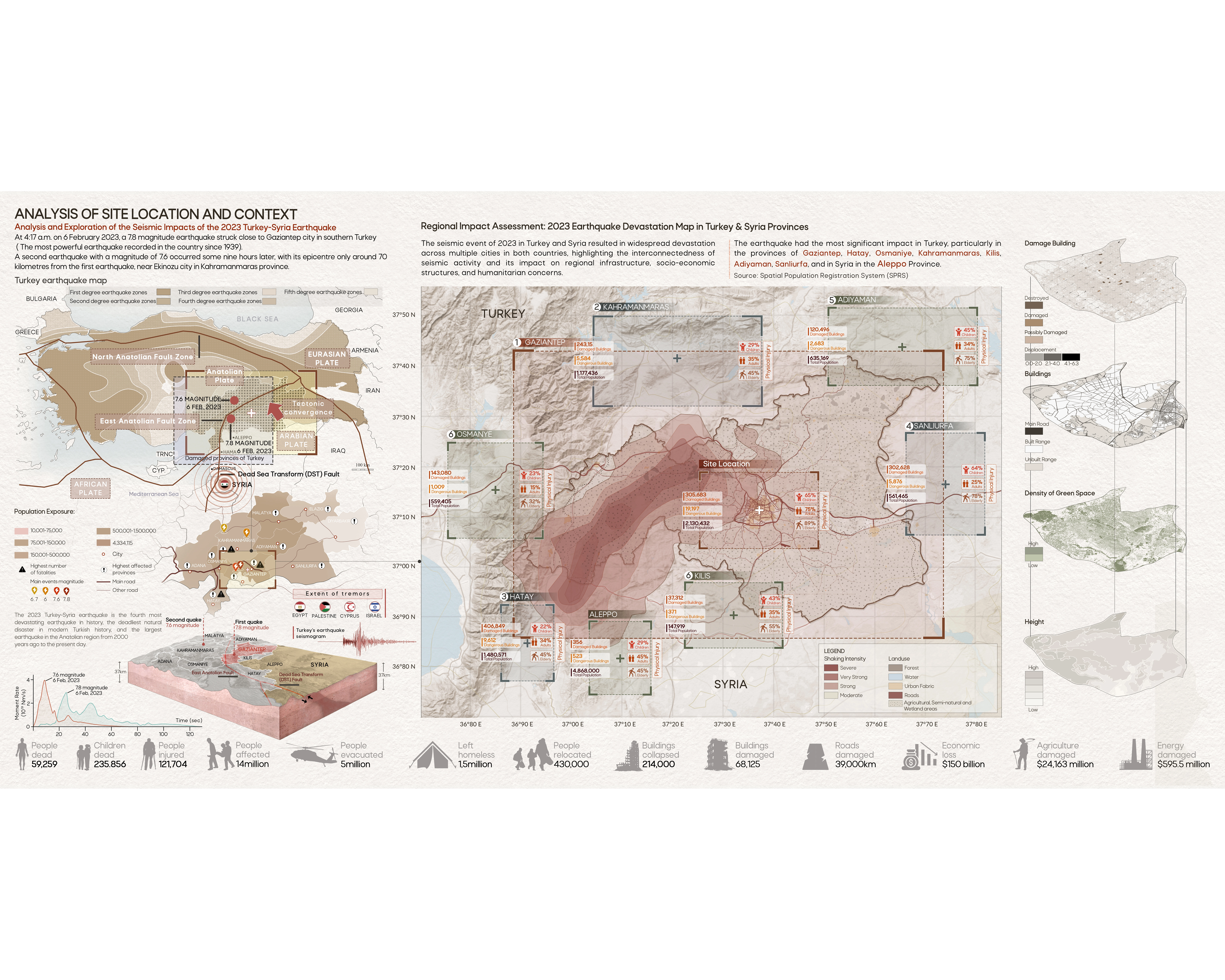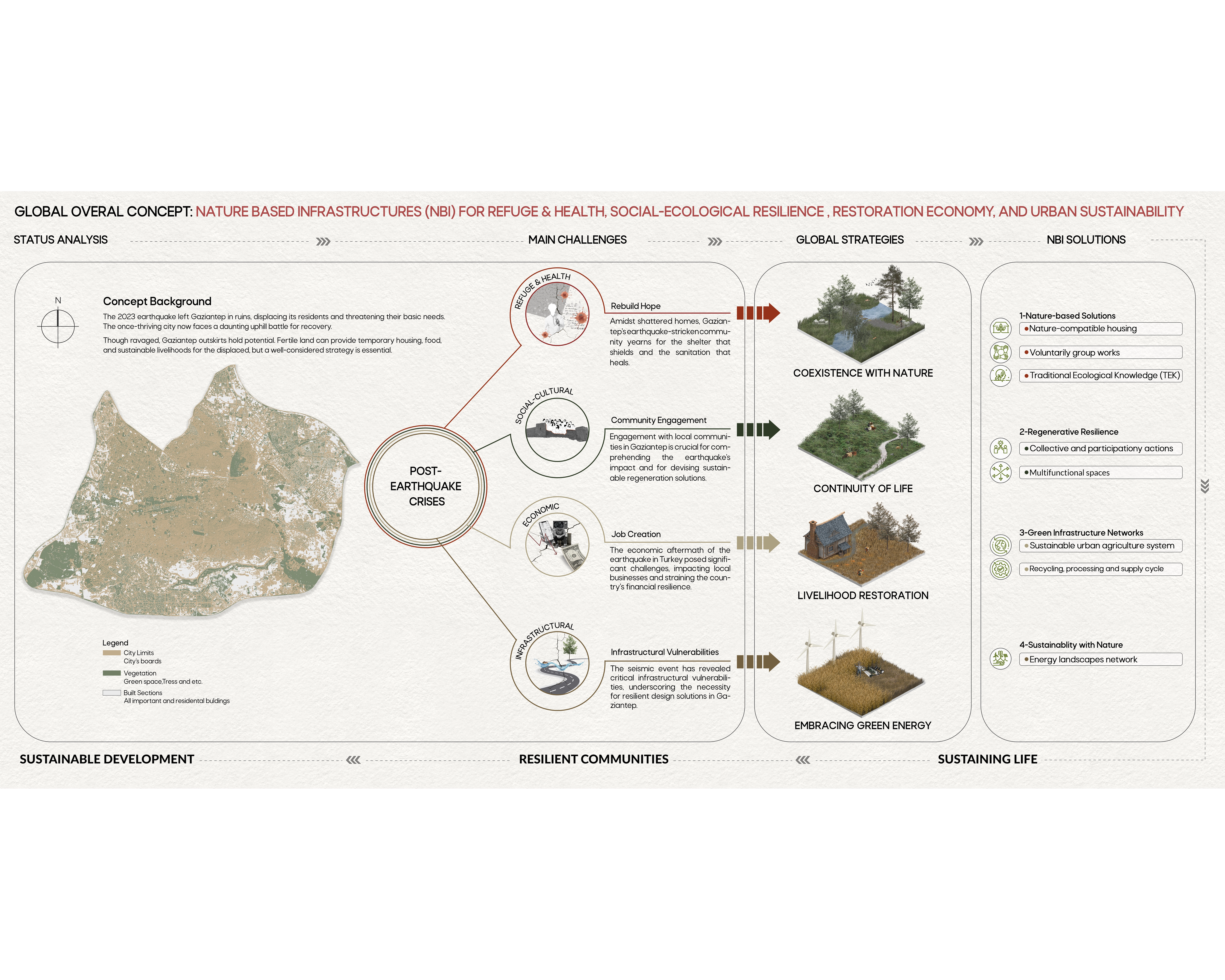 The catastrophic earthquakes that struck Türkiye and Syria in February 2023 served as a stark reminder of the devastating power of natural disasters and the profound impacts they may have on human settlements. With a combined of 7.8 and 7.6 Richter, these twin earthquakes unleashed a trail of destruction that left a mark on the region for years to come. The death toll surpassed 59,000, with countless more injured and displaced. Cities especially Gaziantep were reduced to rubble, their infrastructure shattered, and their communities deeply scarred. Amidst the despair, lies an opportunity to rebuild Gaziantep in a way that is not only resilient to future disasters but also fosters a more sustainable and equitable future for its citizens.