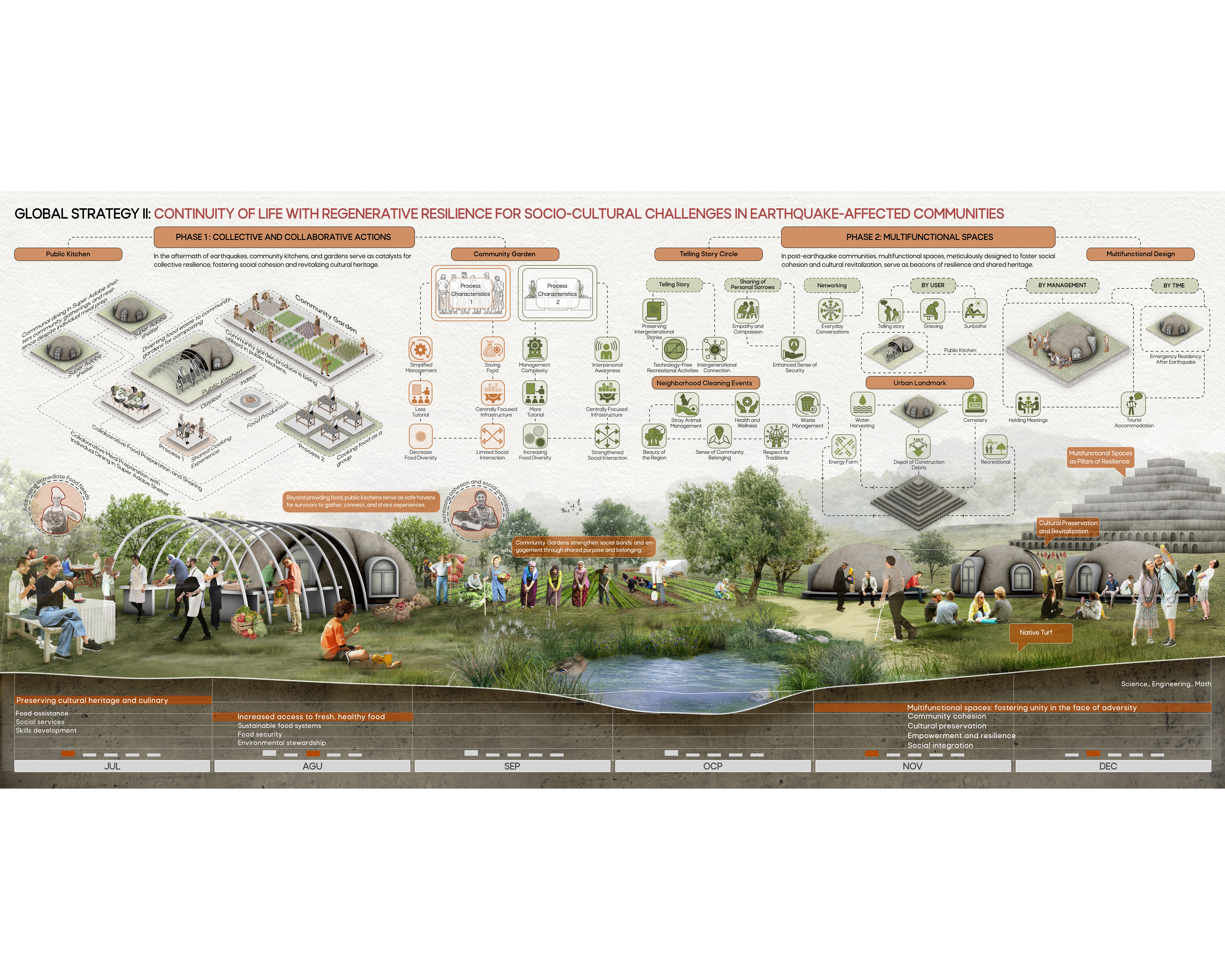 Post-earthquake design must go beyond aesthetics and functionality, incorporating grief and the revival of social ties as core principles. Minimizing the human footprint creates space for wildlife and ecological goals. Multifunctional spaces foster a sense of belonging among people in a common are; ensuring essential services are maintained without compromising the environment.
