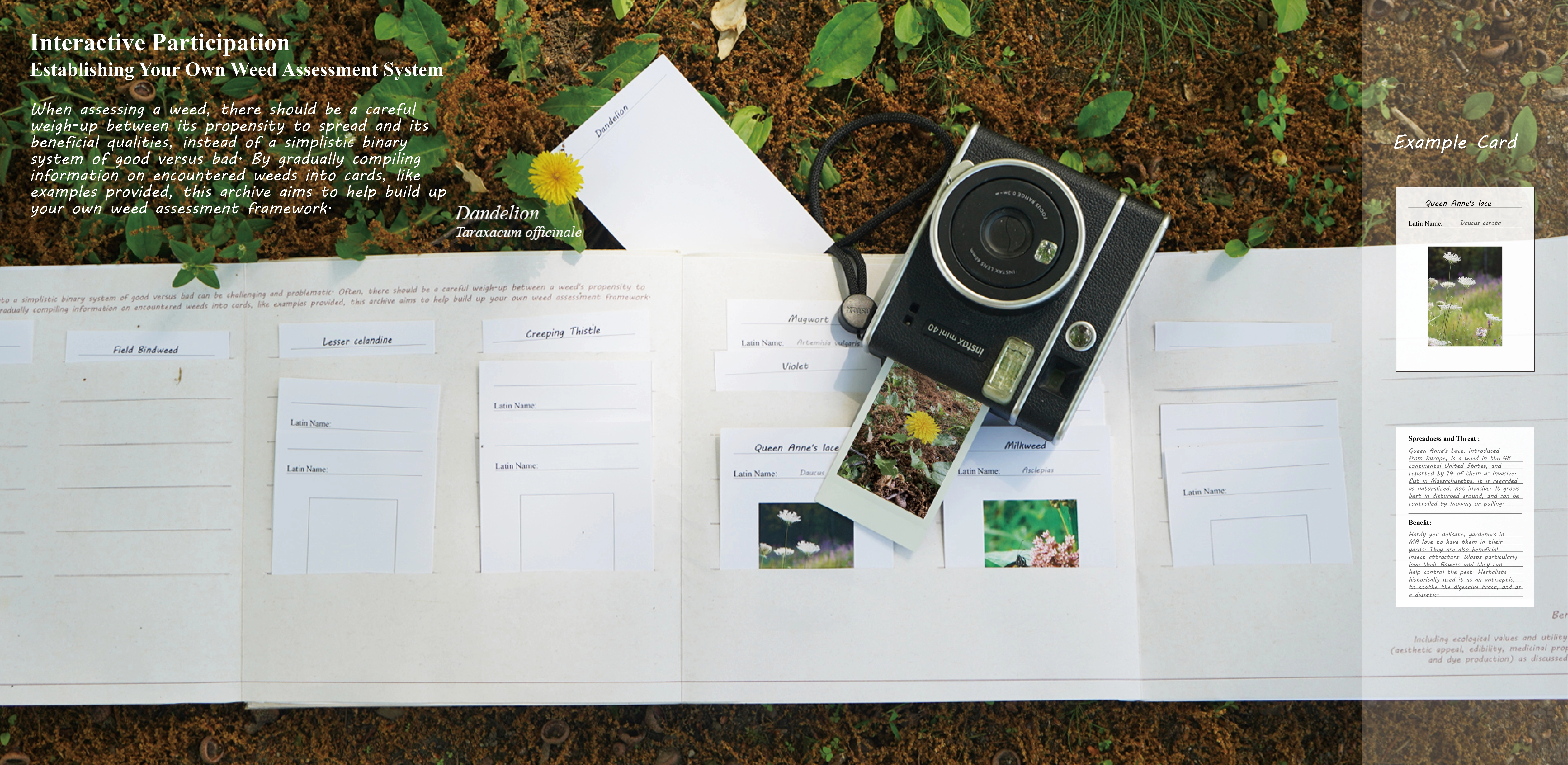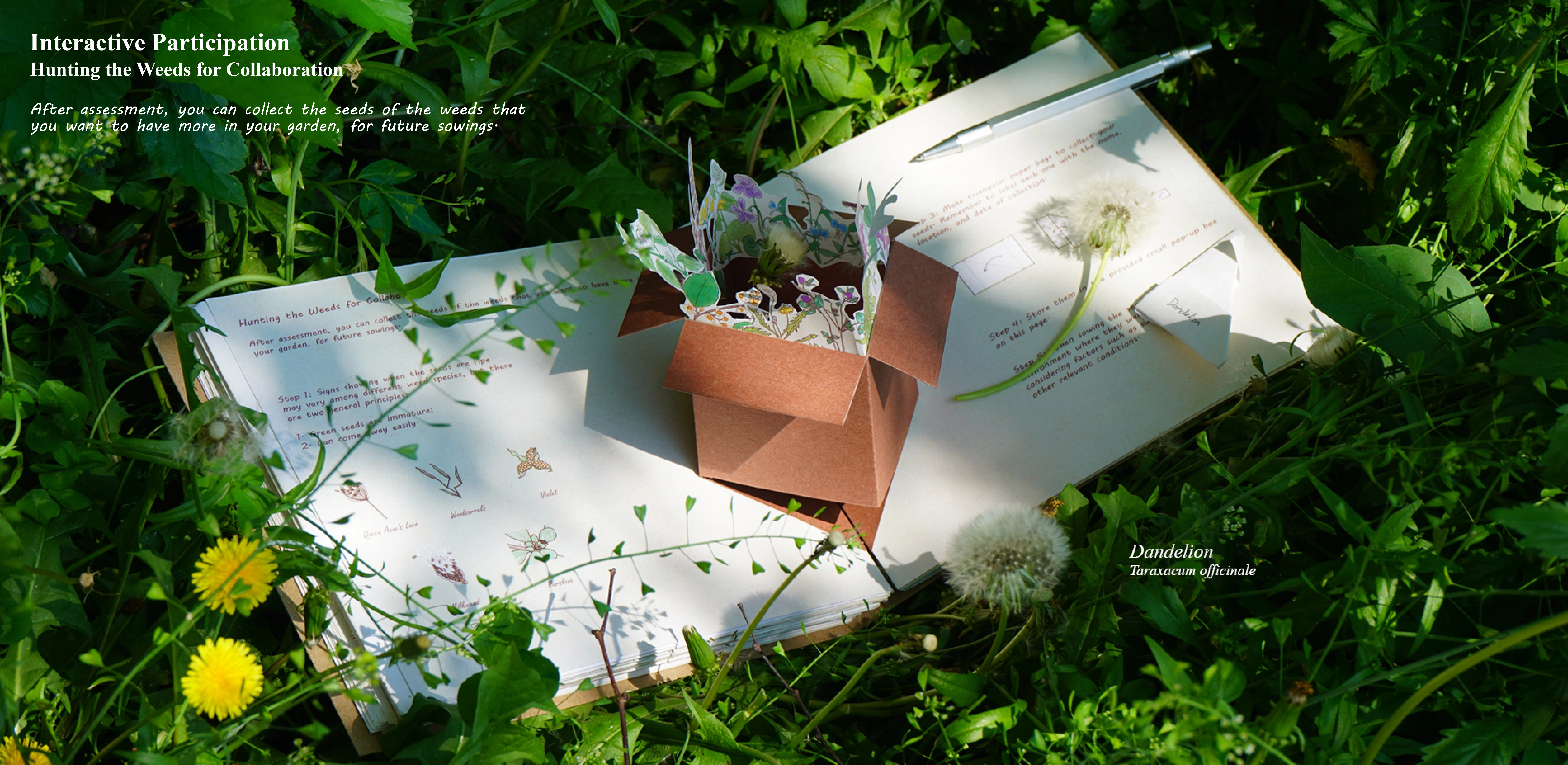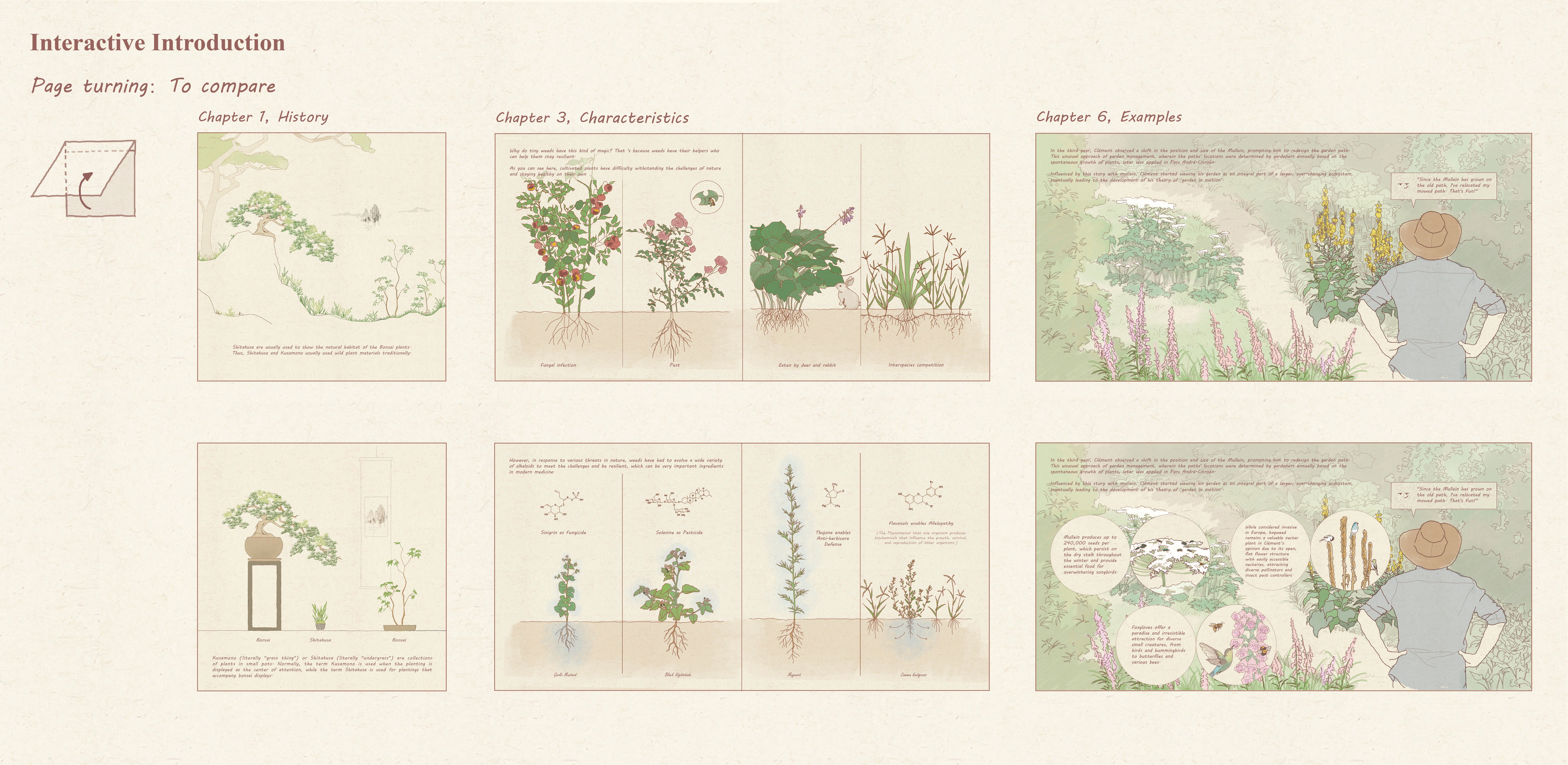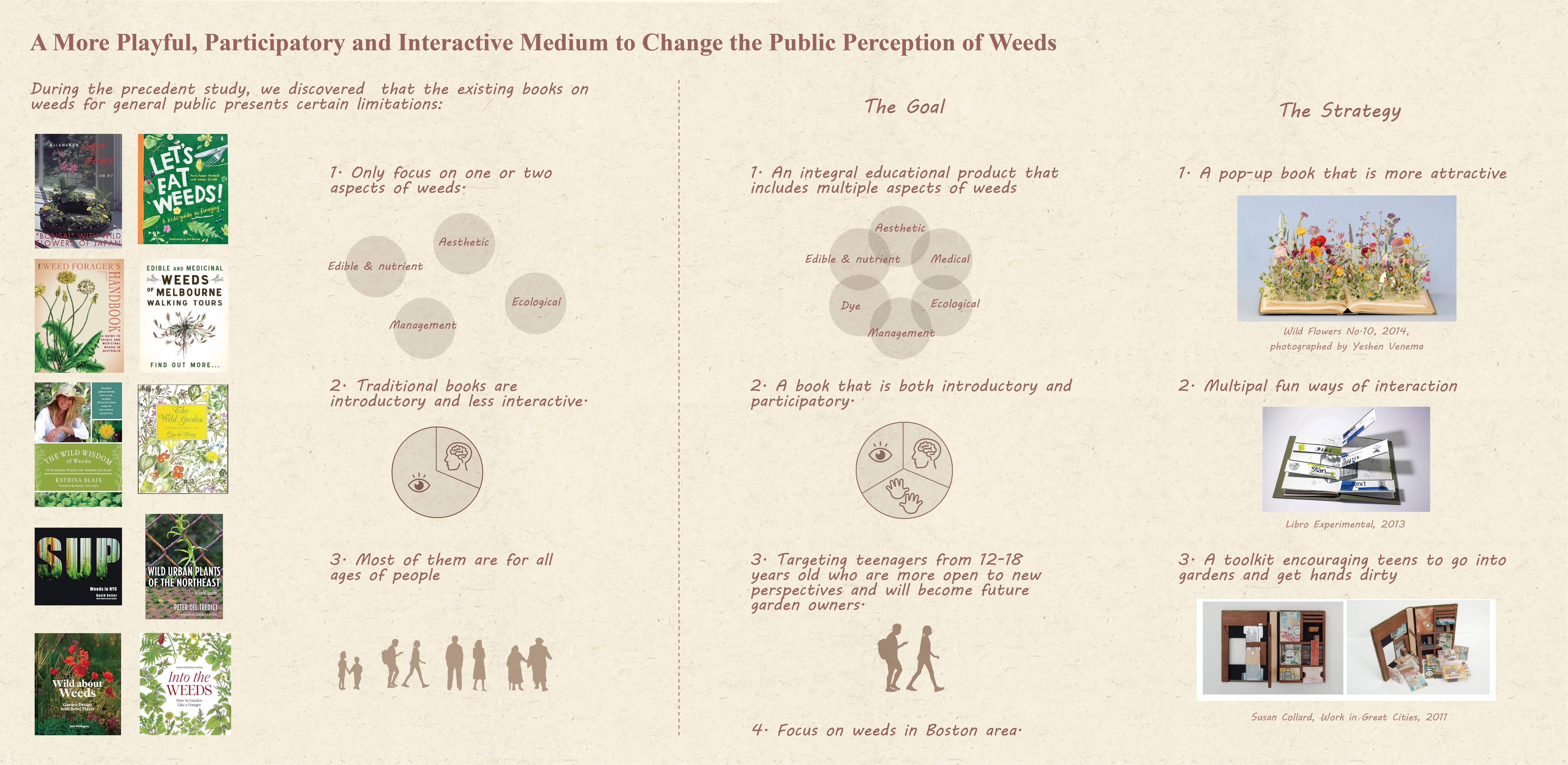 Consequently, Wonderland of Weeds serves as an experiment and a response. Wonderland of Weeds is an interactive picture book of Boston's spontaneous plants with a toolkit included, targeting teenagers from 12-18 years old. By attracting teenagers to interact with these unloved plants and get their hands dirty, the content aims to help them learn more about weeds and their unique values, encouraging each domestic garden to become more eco-friendly.