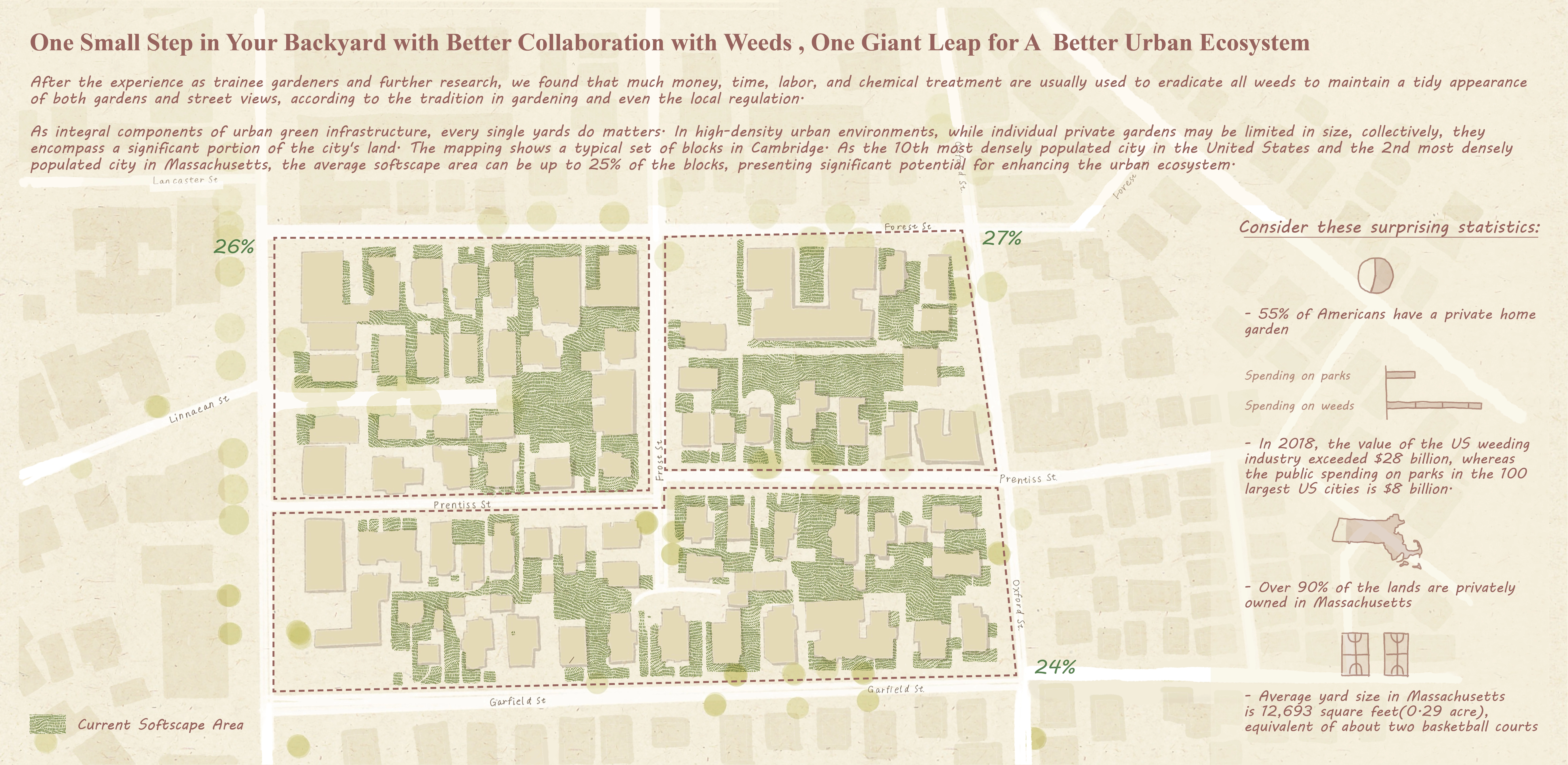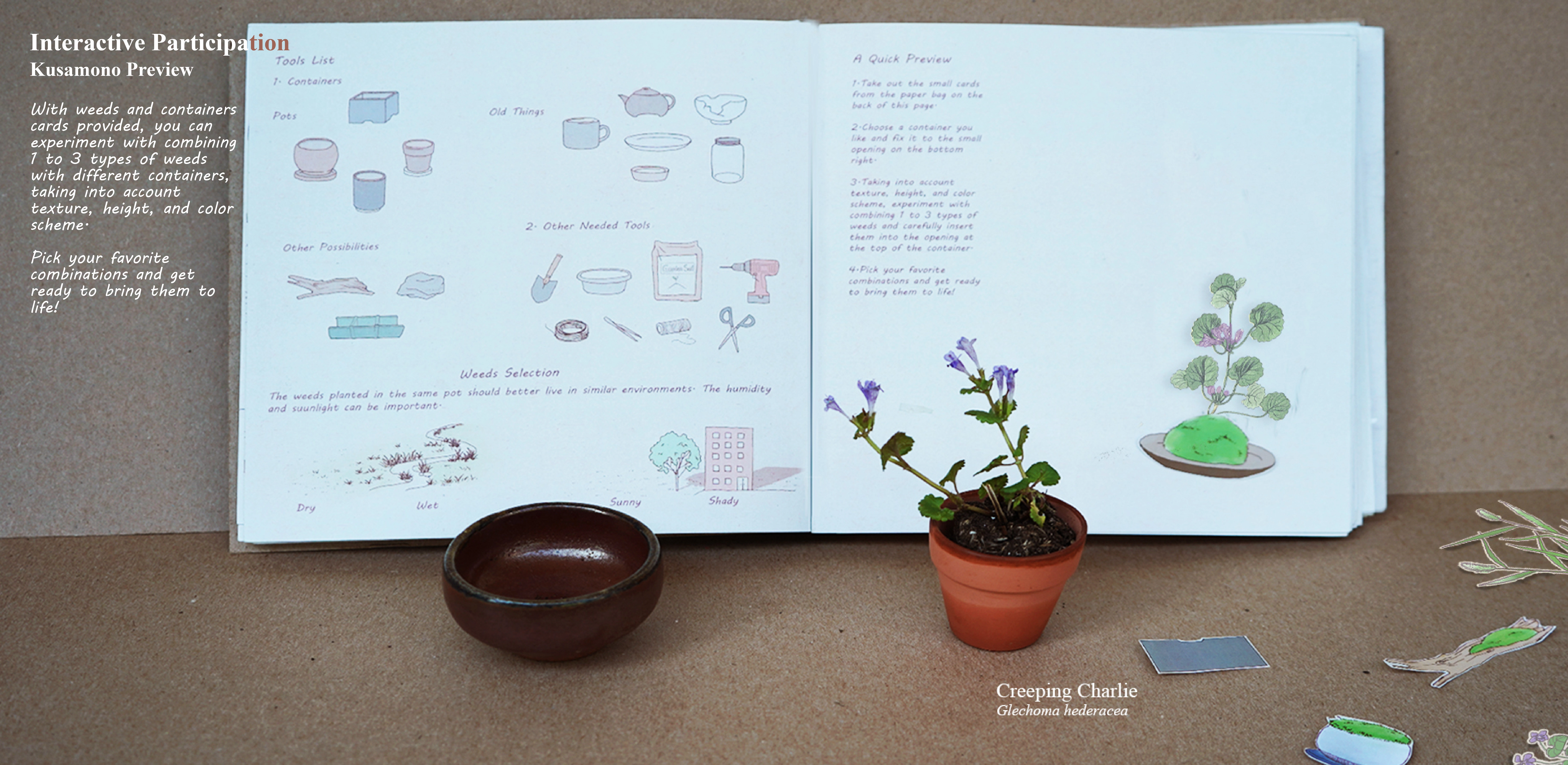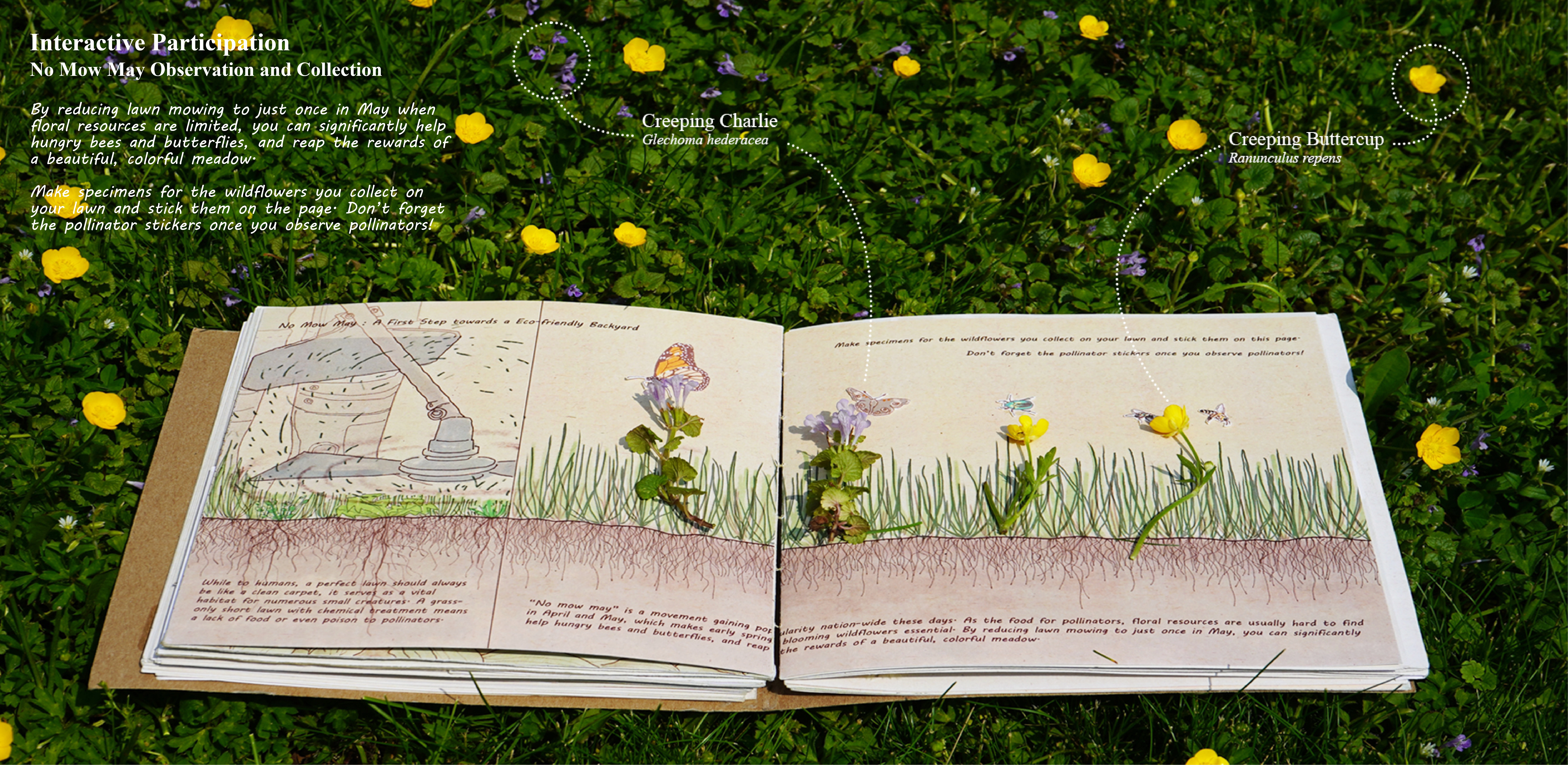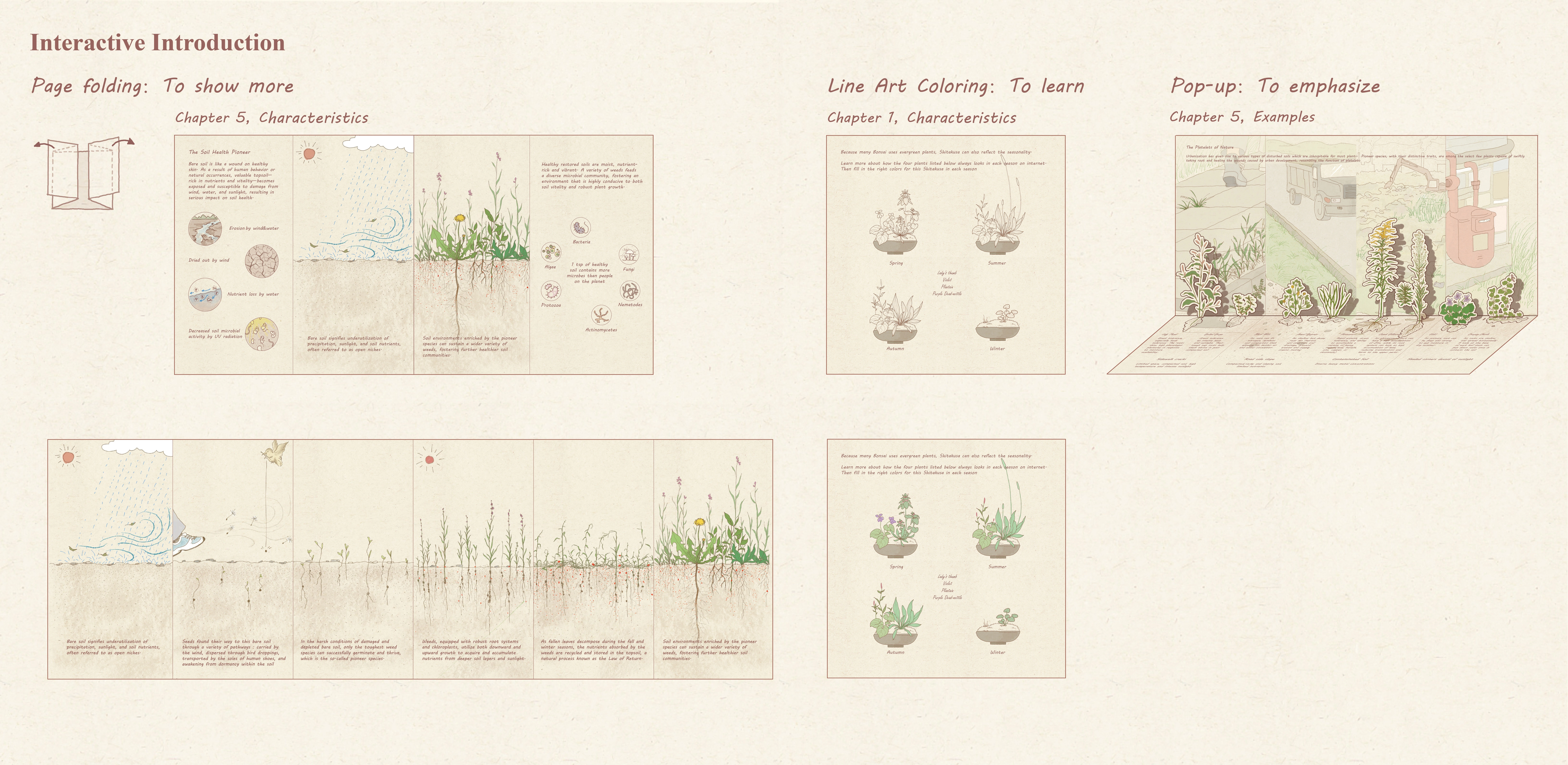 Consequently, Wonderland of Weeds serves as an experiment and a response. Wonderland of Weeds is an interactive picture book of Boston's spontaneous plants with a toolkit included, targeting teenagers from 12-18 years old. By attracting teenagers to interact with these unloved plants and get their hands dirty, the content aims to help them learn more about weeds and their unique values, encouraging each domestic garden to become more eco-friendly.