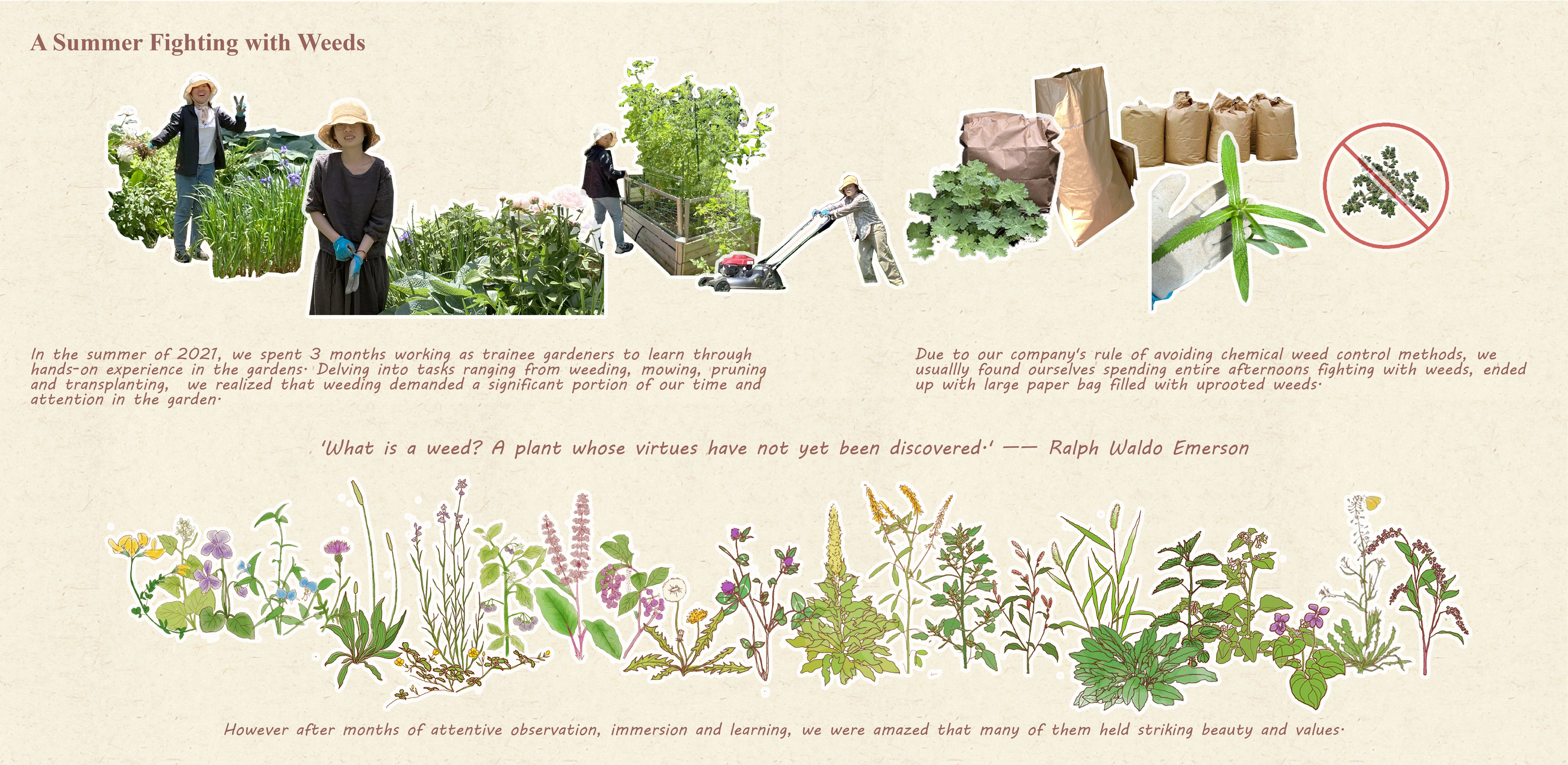 Spontaneous plants, better known as weeds, can be defined as resilient plants that grow anywhere without humans' help.  According to the tradition in gardening and even the local regulation, much money, time, labor, and chemical treatment are used to eradicate all weeds to maintain a tidy appearance of both gardens and street views, which is highly resource-intensive, unhelpful, or even harmful to our urban ecosystem. Received recent attention from ecological and landscape academia but still deemed as aggressive and dominant by the general public, the weeds have surprising ecological values and aesthetic potential, in fact, which requires careful selective management. They can help make the gardens filled with delicate cultivated plants more vibrant and resilient in front of different threats. Thus, how can designers help alter the public consciousness of spontaneous plants, which can contribute to a more resilient and healthy urban ecosystem in a bottom-up manner?