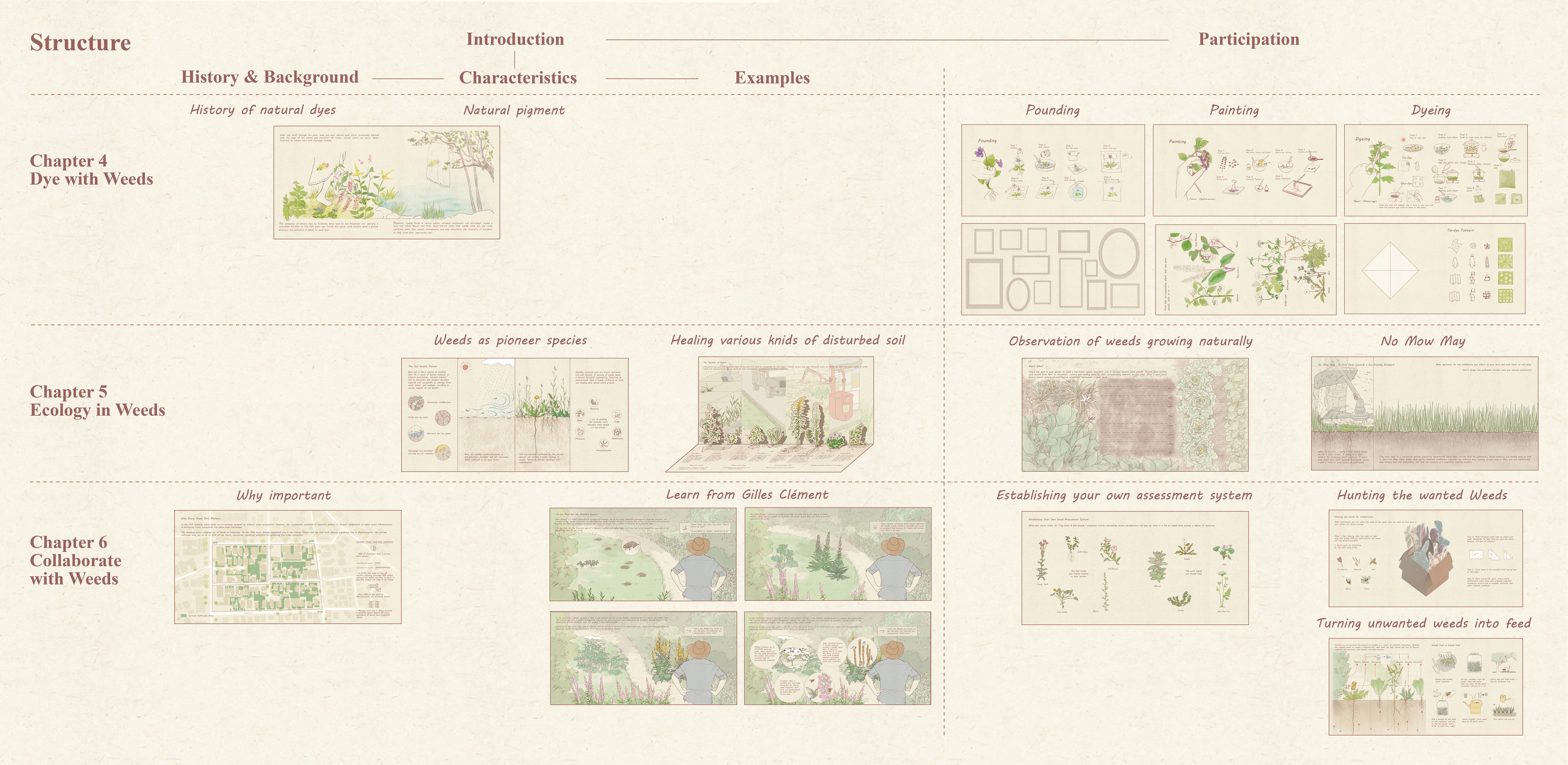 As important components of urban green infrastructure, the ecological potential in domestic gardens is not taken seriously by the landscape architecture academia nowadays. The widely used methods of weed control are highly resource-intensive, unhelpful, or even harmful to our urban ecosystem. By targeting teenagers who are more open to new perspectives and will become future garden owners, our picture book Wonderland of Weeds is an exploration of the participatory medium to help the public equipped with enough interest, awareness, knowledge, and skills to start managing weeds in a better way so that individual gardens can contribute to the overall urban ecosystem.