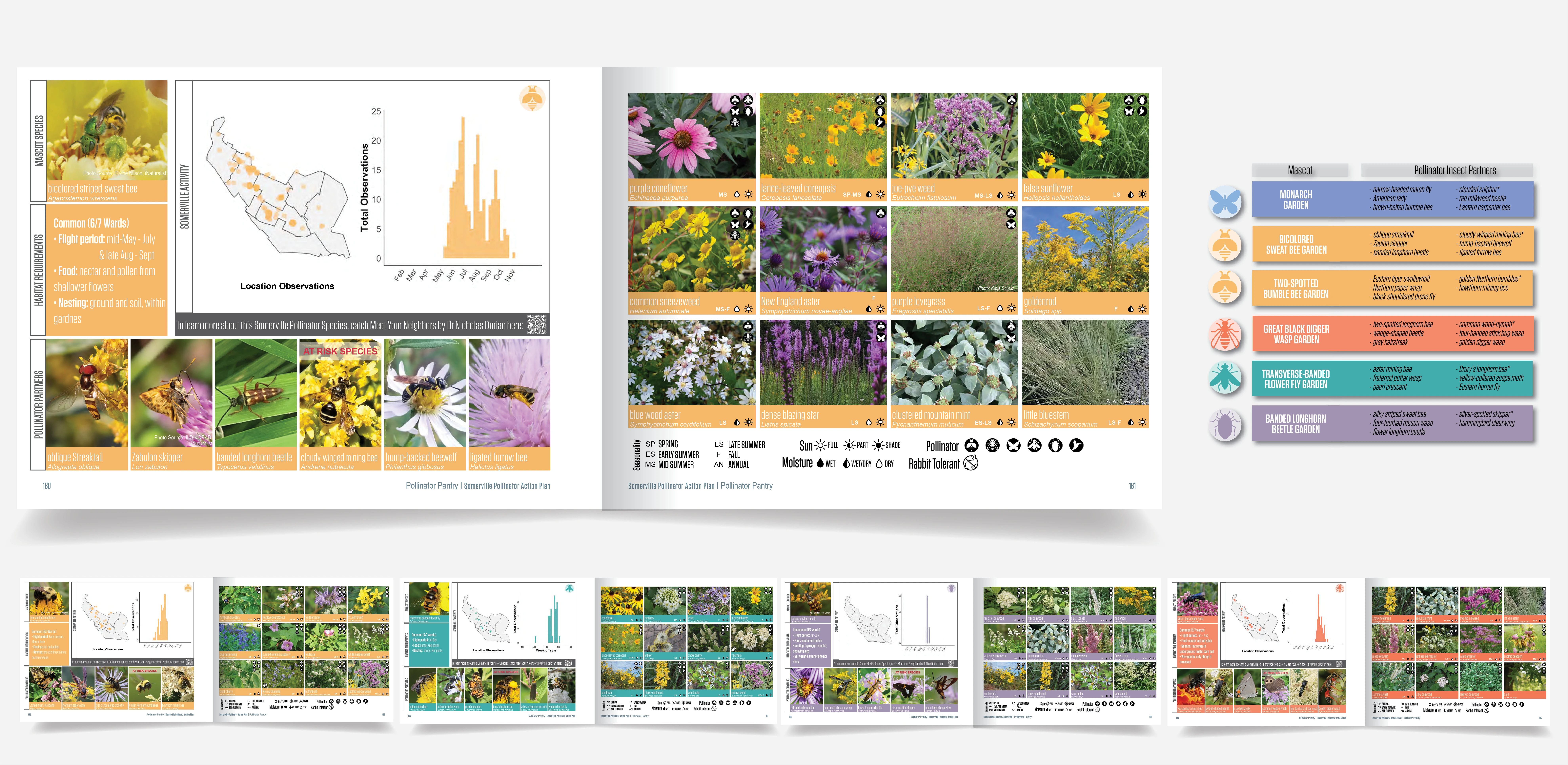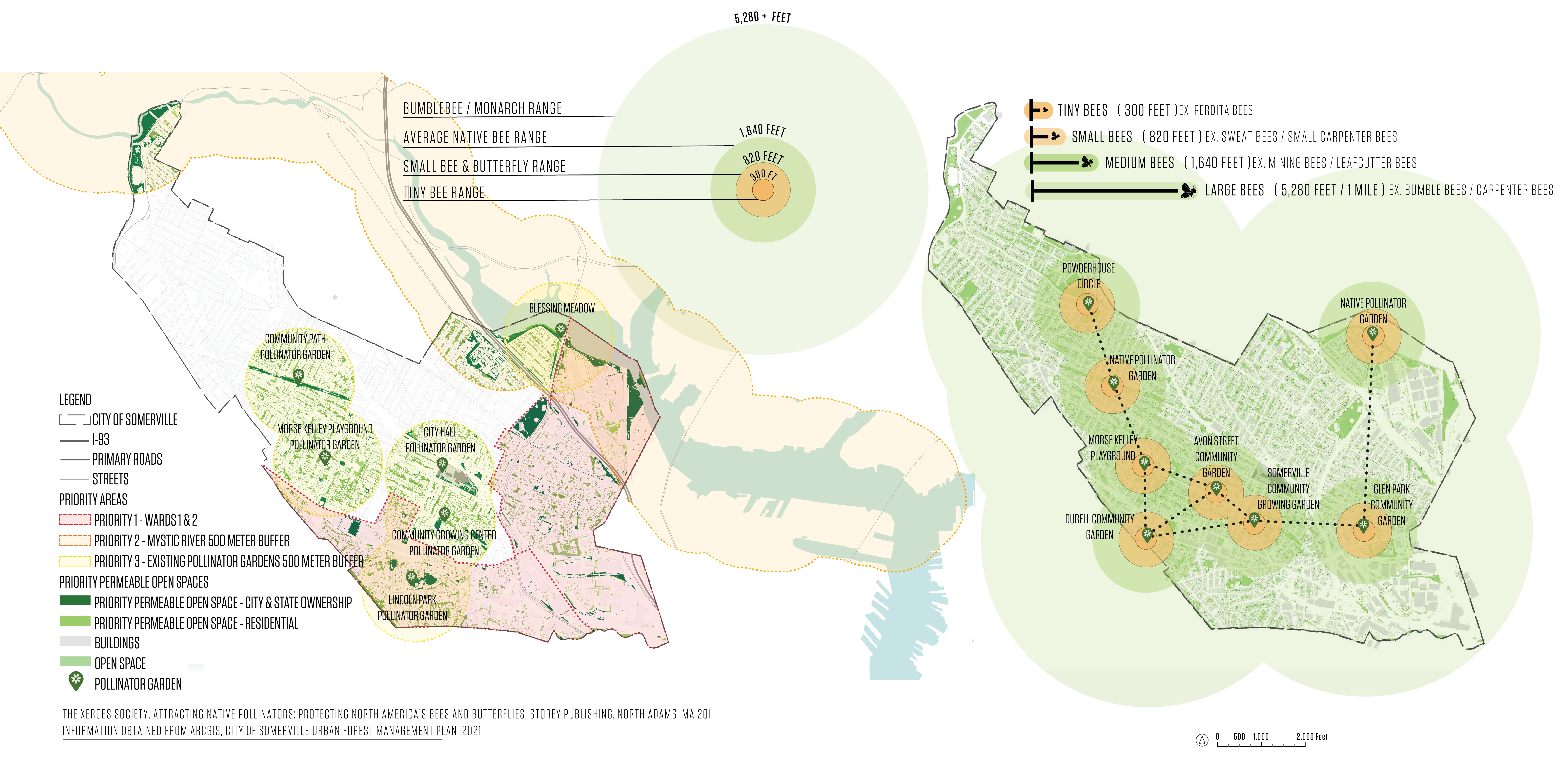 The Somerville Pollinator Action Plan is a first-of-its-kind urban pollinator research and policy framework, envisioning a city where biodiversity grows alongside community. Pollinator decline—projected at 30% insect loss over the next 20 years—demands urgent attention. iNaturalist and community observation data was mapped to create a baseline of known local pollinators. The plan details pollinator support strategies with both science and aesthetics in mind, including original ecological research, plant lists, revamped municipal policy and maintenance practices, and a ‘Pollinator Pantry’ of 40+ regionally specific planting ‘recipe cards.’ The methodology and open-source framework is replicable across the US to support urban biodiversity.