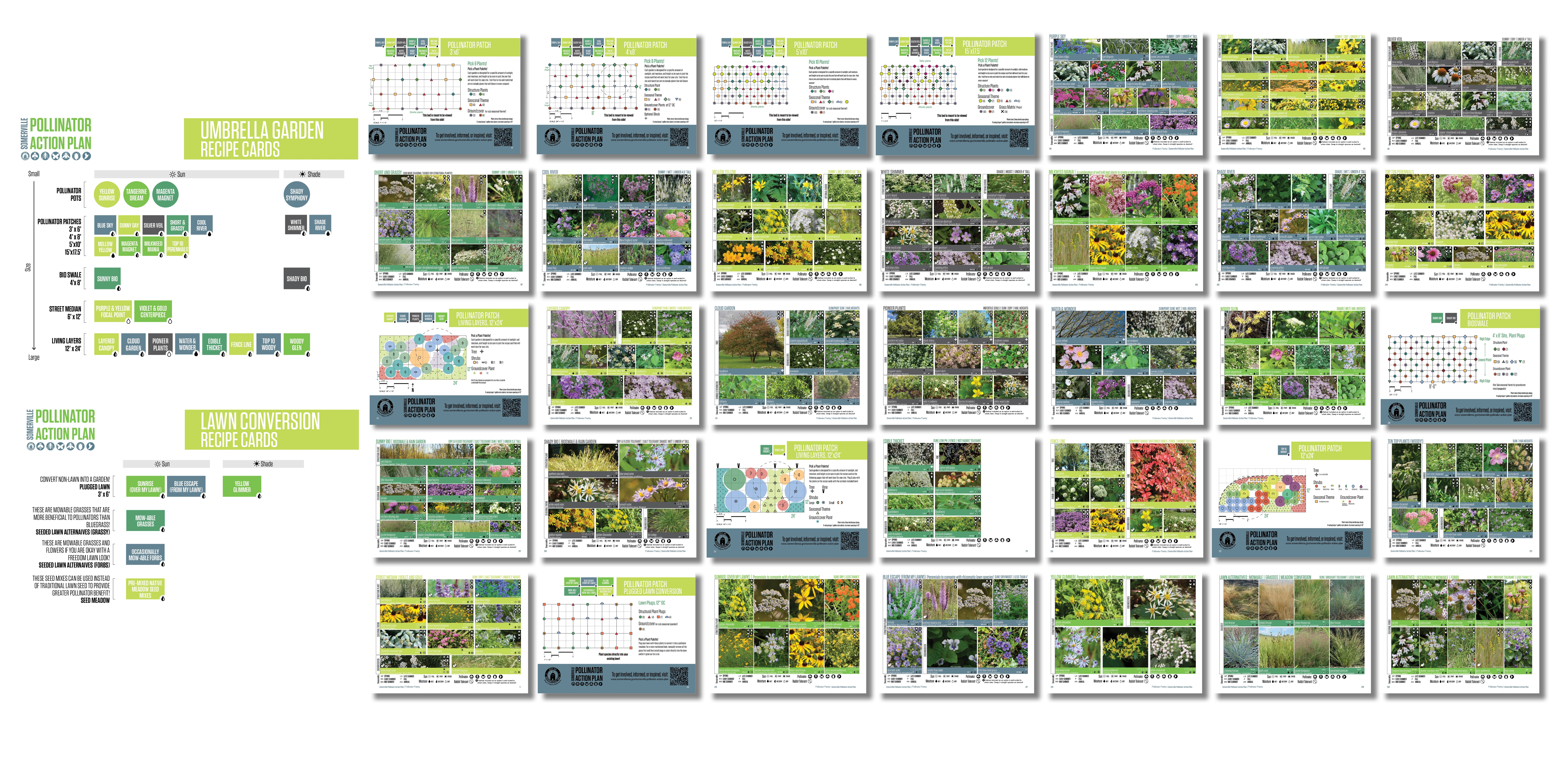 Using data from citizen science platforms iNaturalist, Ebird, Tufts Pollinator Initiative, and EwA Buggy, researchers mapped species presence and seasonality, setting a foundation for conservation and ongoing monitoring. 299 unique pollinators in Somerville were documented in 9397 observations. The project conservation biologist used over 10,000+ photographs to identify local pollinator and plant interactions, creating priority plant lists (including non-natives and cultivars!). Peer-reviewed literature was layered into the hyper-local findings to create a prioritized ‘Comprehensive Plant List’ (over 400 ecoregion- specific species) of both foraging and host plants. The list was used to create a ‘Pollinator Pantry’ of 40+ ‘Recipe Cards’ for garden designs at different scales, including critical trees and shrubs and easy lawn-to-forb conversions. GIS mapping sets priority areas for habitat creation by identifying gaps between existing pollinator gardens, water resources, and areas with minimal pollinator sightings.