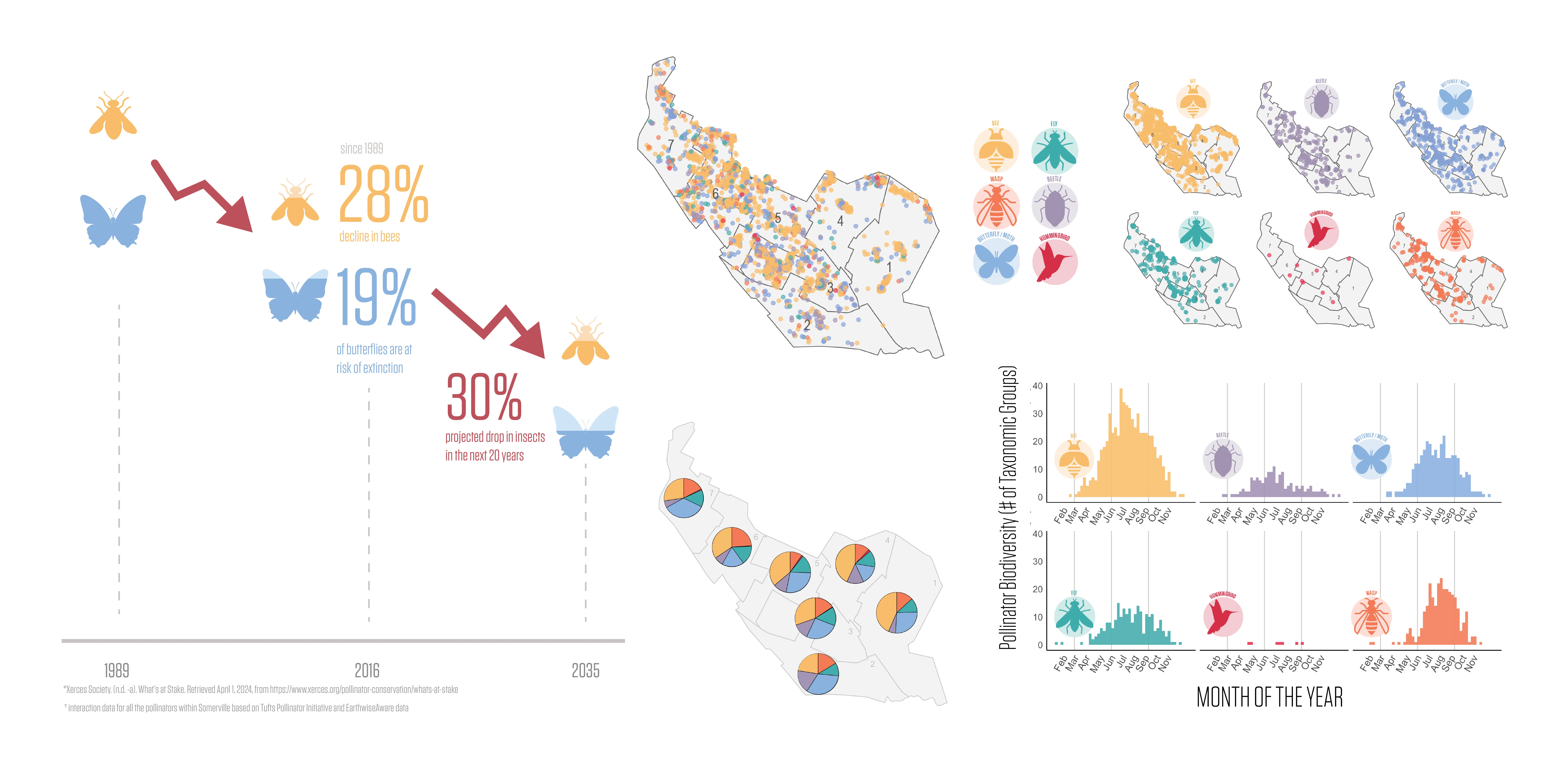 The Somerville Pollinator Action Plan (SPAP) guides efforts to create an urban environment to support pollinators in Somerville, MA. With pollinators essential to food production, biodiversity, and ecosystem stability, their decline—marked by a 28% drop in bumble bees and 19% of butterflies in the last decade—demands urgent research and action. This requires considering all pollinators, such as beetles, hover flies, wasps, and birds. Without intervention, insect populations could decline 30% in less than 20 years.