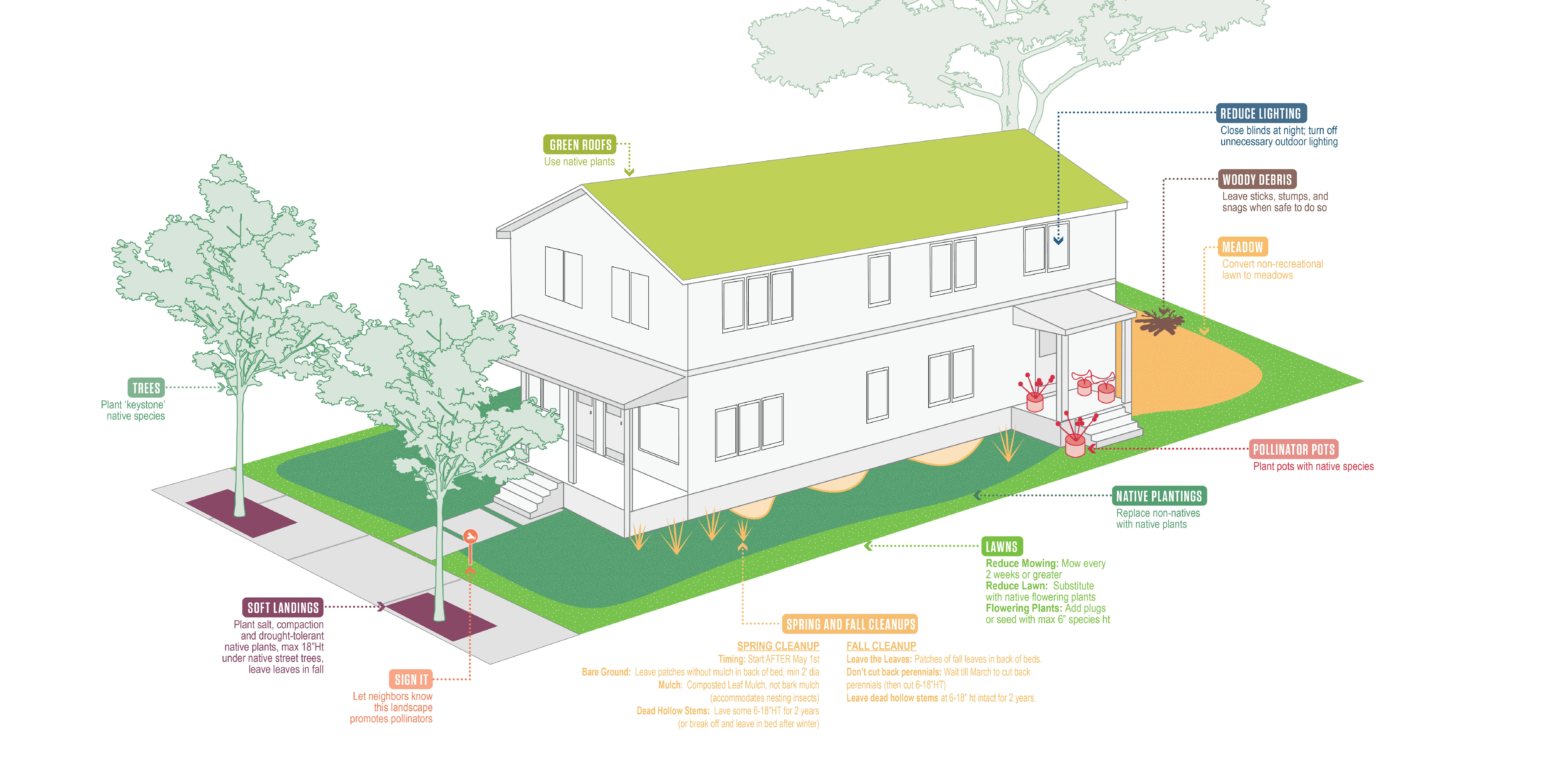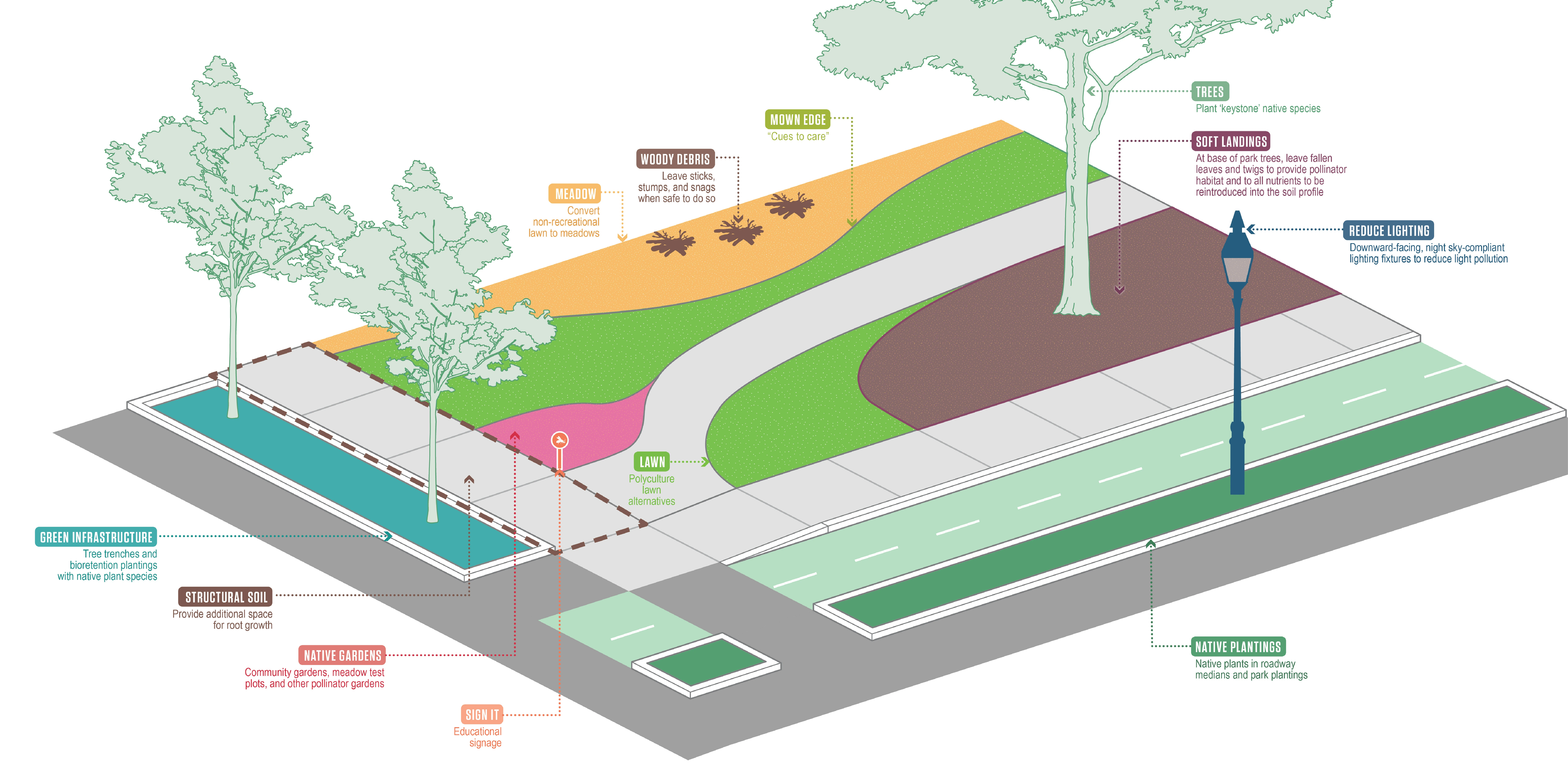 SPAP provides easy-to-follow checklists of revamped maintenance practices that target specific user groups, such as public DPW, landscape contractors, and residents. Branded signs were developed for pollinator-forward plantings and maintenance practices in the field.