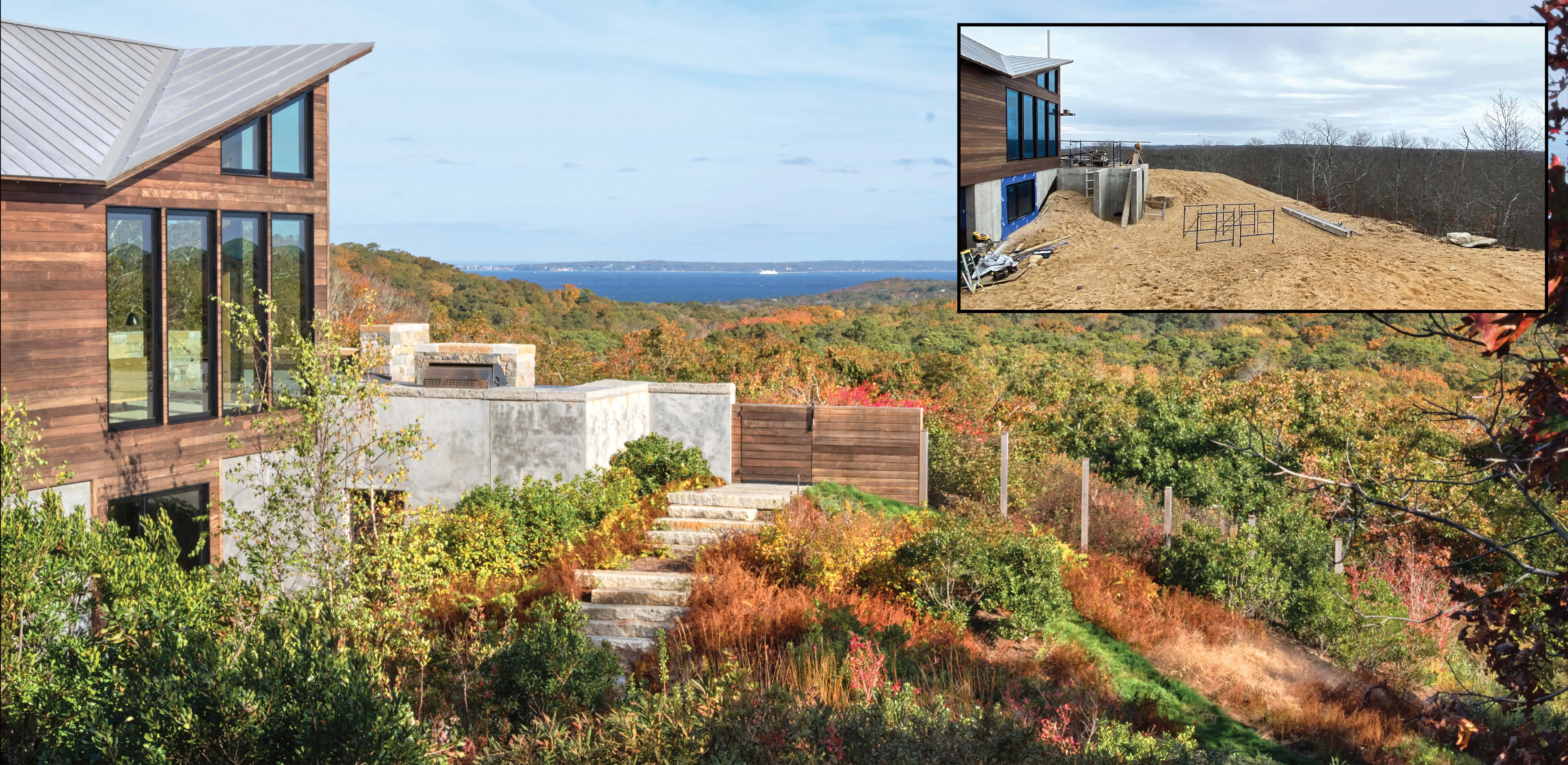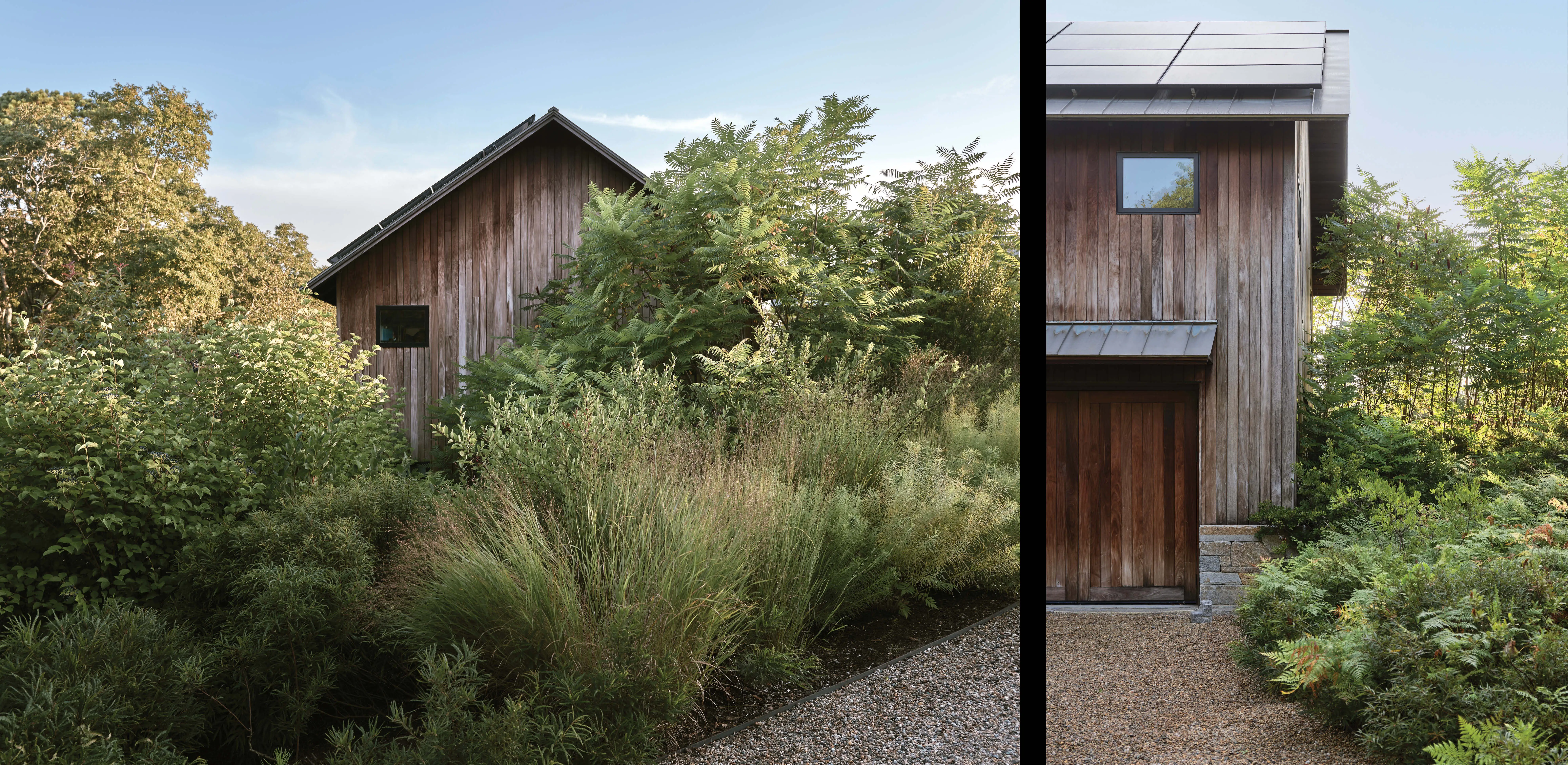 By the time the landscape architects joined the project, much of the land had already been cleared for house construction, leaving behind a barren, lifeless expanse surrounded by a sculptural beech, oak, and pine forest. Rather than replant the forest, the team embraced a successional native plant palette, crafting a mosaic of unique species assemblages that grew quickly into a thick vegetative armor that adapts to everchanging weather patterns. The challenge was to invite wanderlust through experiences that engage the site’s topography and to stimulate the island’s unique ecologies to return to the site where mature woodland once stood. The resulting landscape blends strength with beauty, offering dynamic multiseasonal interest, increased habitat, and expansive biodiversity.