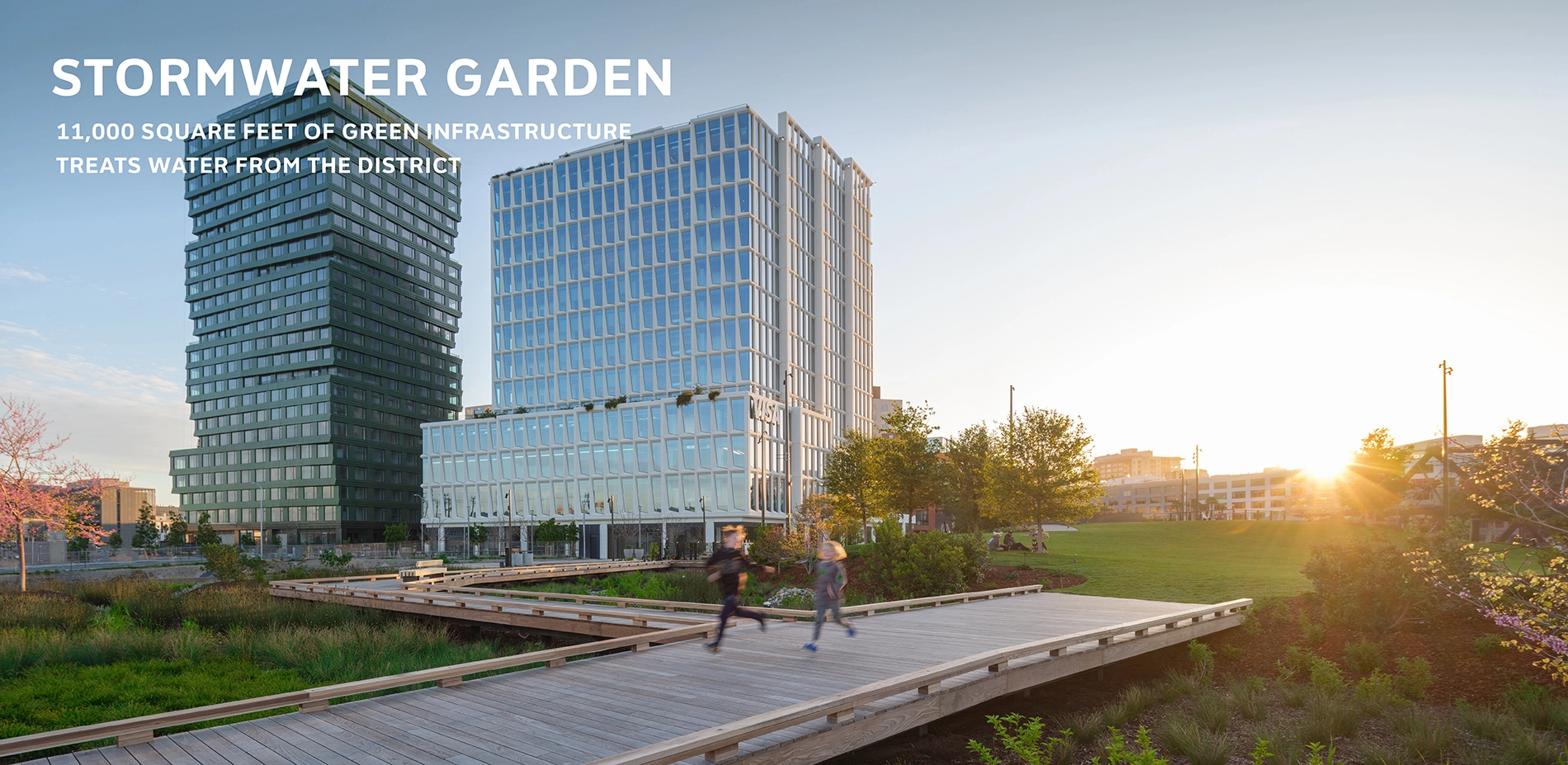 The 11,000-square-foot Stormwater Garden treats, stores, and conveys runoff from the entire development, incorporating green infrastructure through a series of elevated boardwalks crossing the garden. Water-tolerant native species enhance the park’s biodiversity.