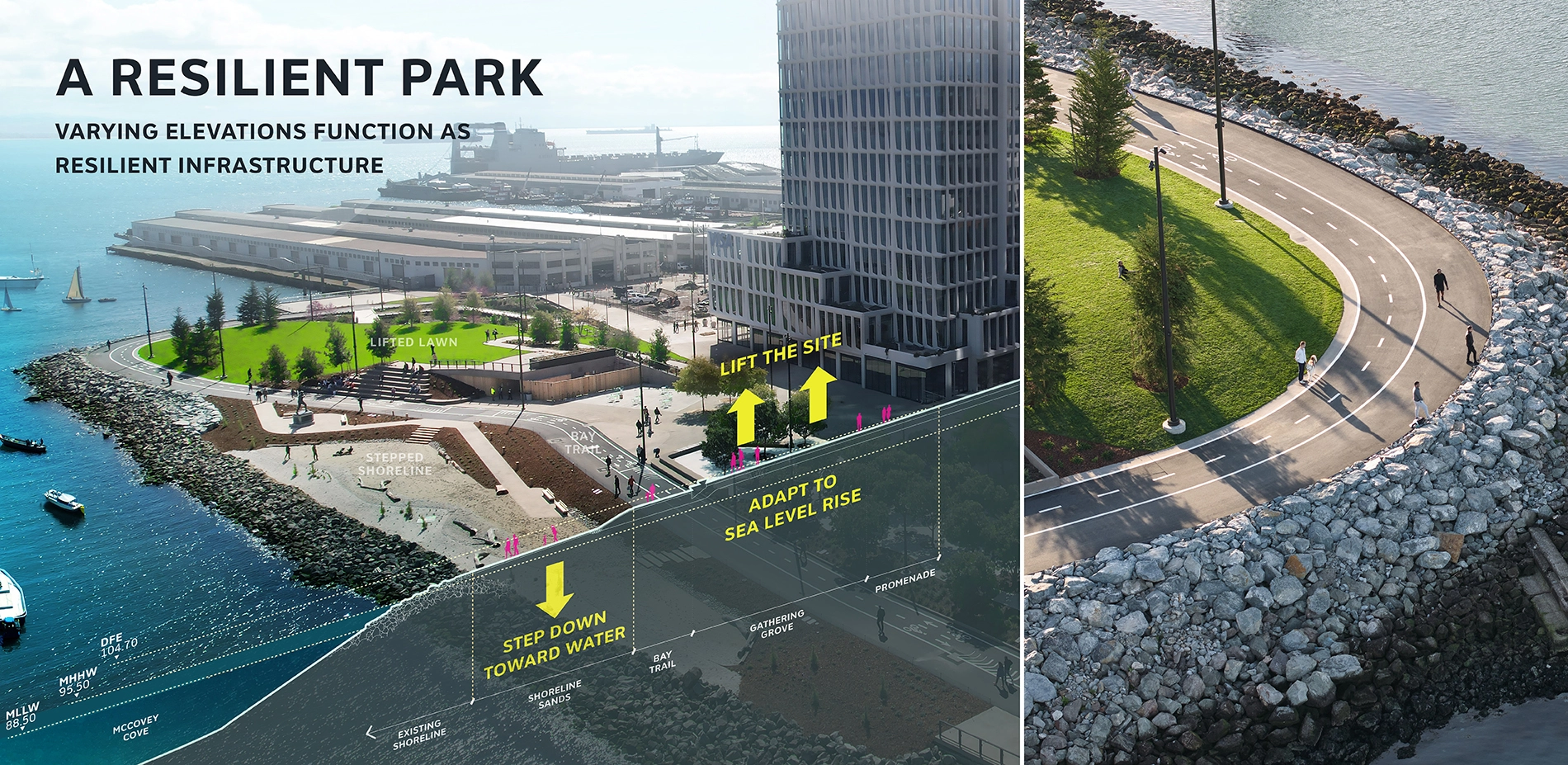 In addition to linking the park to the broader region, the Bay Trail also serves as the front line against sea level rise. Elevated approximately five feet above existing grade, the trail functions as a primary line of protection for China Basin Park and Mission Rock from coastal flooding: it marks where the park’s elevation lifts up above future sea level rise and conversely pushes down toward the water through the Shoreline Sands. This multi-benefit design reduces risk from sea level rise and storm events, while simultaneously enhancing connections to the water and creating immersive experiences of the San Francisco Bay and McCovey Cove.