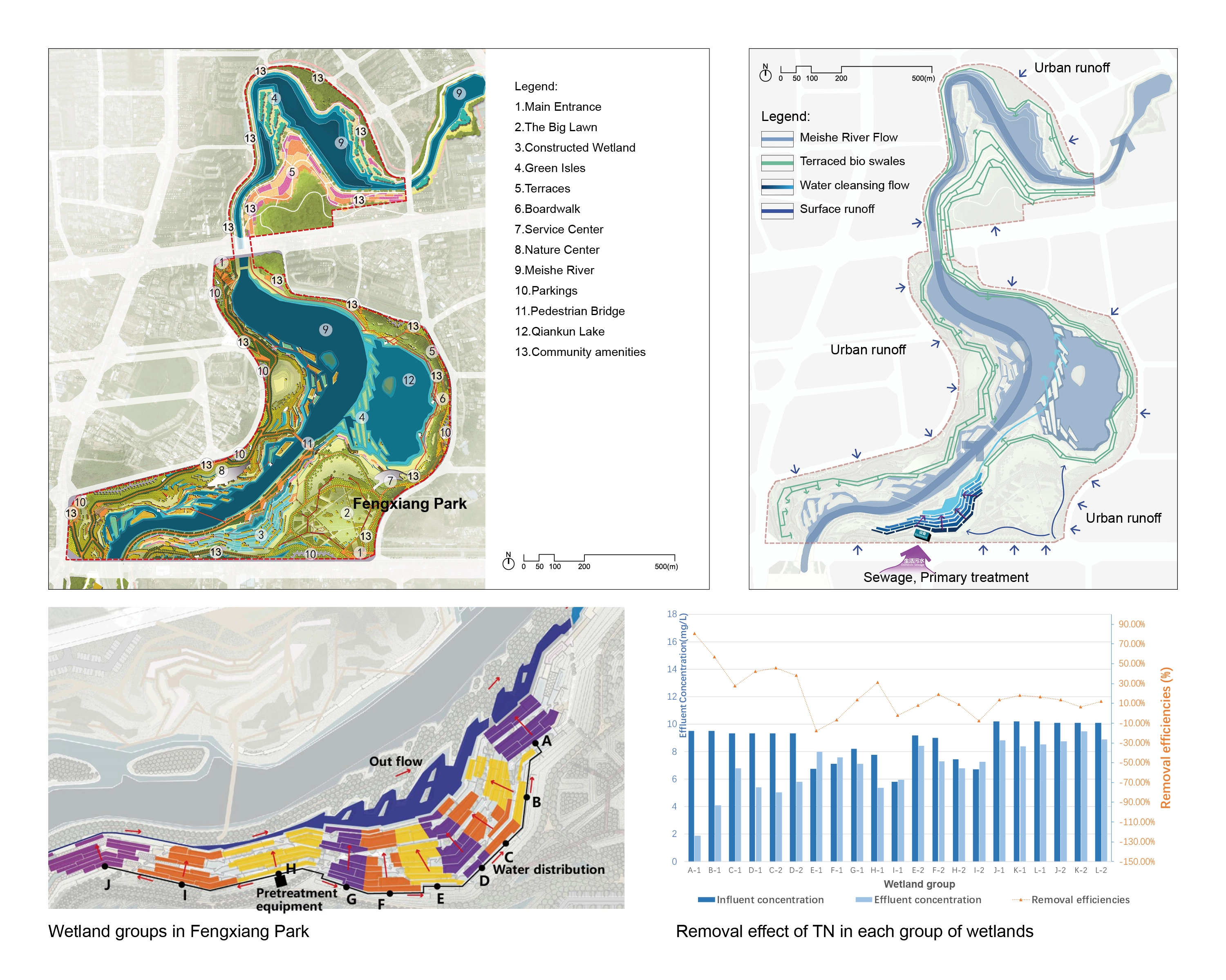 Bio-filtration: In Fengxiang Park, where concrete flood walls and garbage dumps once stood, constructed wetlands now line the riverbank, serving as water purification facilities. These wetlands treat two types of water: nutrient-rich non-point source pollution runoff and sewage from local urban villages lacking access to centralized sewage treatment. This natural system can clean 6000 tons of polluted water daily, improving it to swimmable quality. Additionally, mobile pre-treatment equipment at wetland inlets handles sewage, removing odors and pathogens before channeling grey water into the wetlands, and cleaning 3,500 tons of domestic sewage daily. Water flow management is flexible, with options to switch or combine flows as needed. Regular testing ensures water quality remains safe for public use.