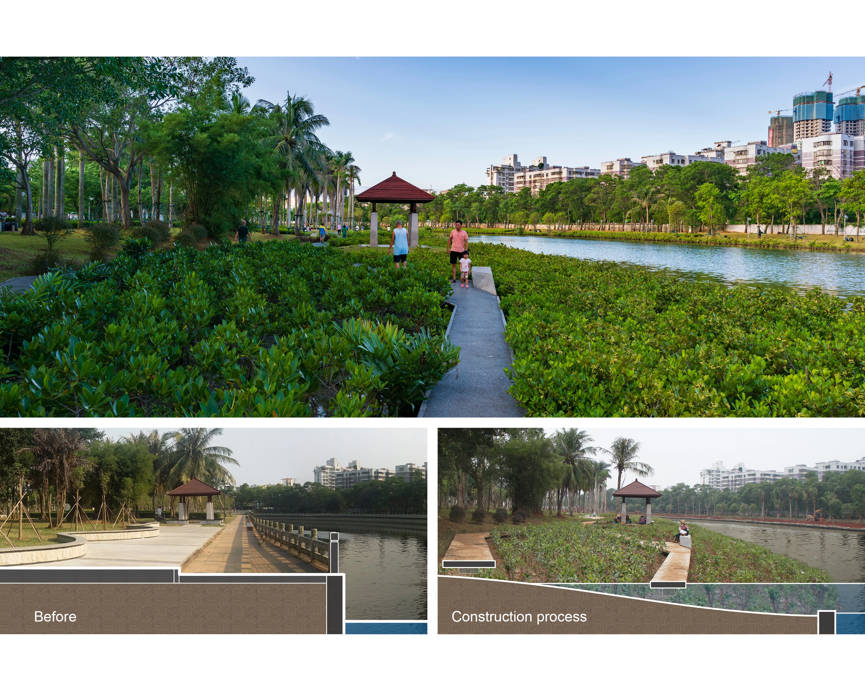 Dechannelizing: The concrete flood walls were removed and replaced with an eco-friendly river bank. The blocked waterway is reconnected to the ocean to allow tides to again enter the city; wetlands and shallow shores along the river were reconstructed so that mangroves could rehabilitate them. Continuously elevated pedestrian paths were designed to create waterfront access. The demolished concrete and excavated materials were recycled to build isles along the river to further rewild the waterway and enhance the interaction between water and earth and create habitats for diverse tropical fauna and flora.