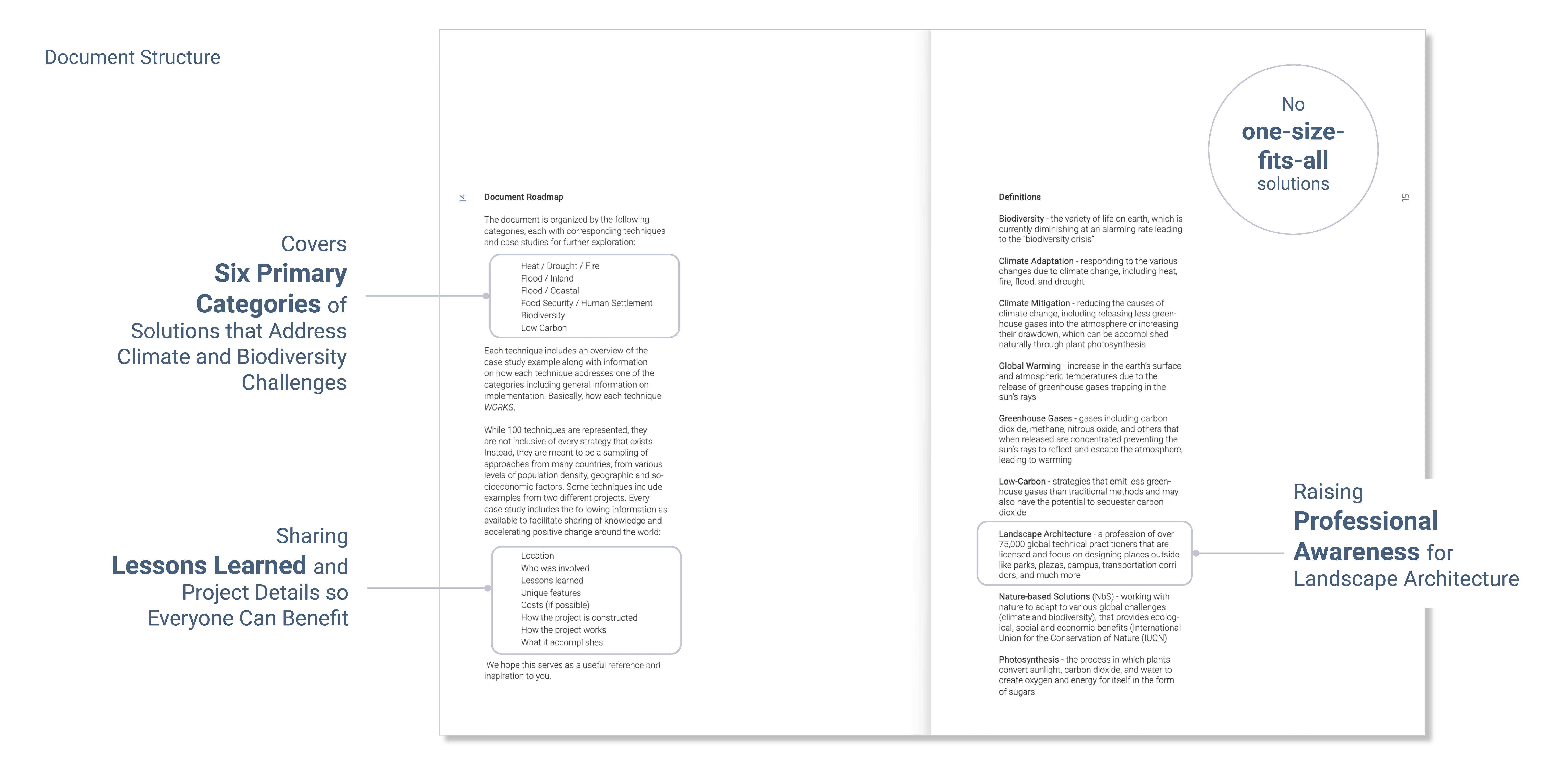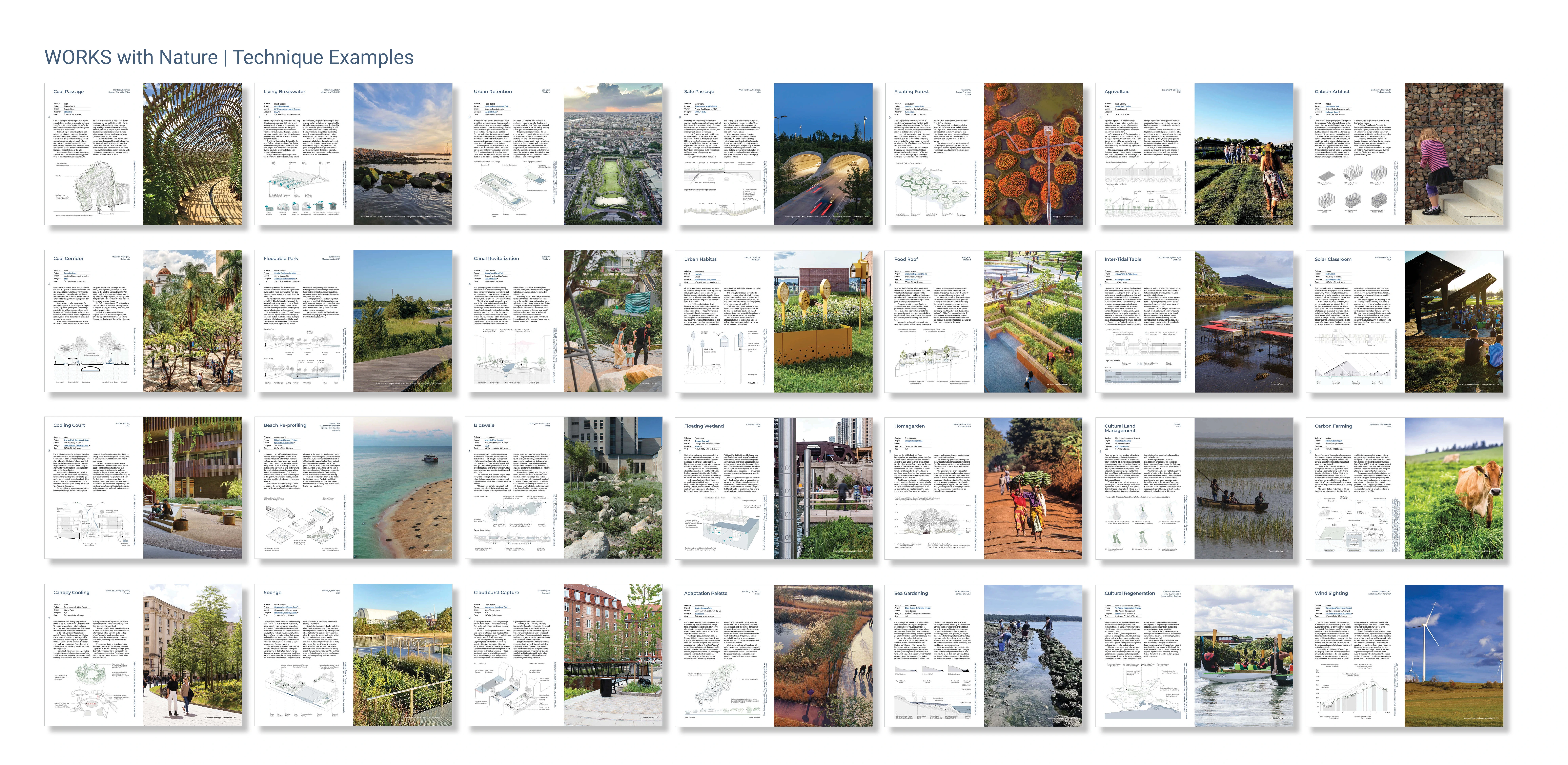 Each project showcases a technique with insights on community engagement, project team, lessons learned, a technical detail or process drawing and a project image that makes the content accessible to a broader audience.