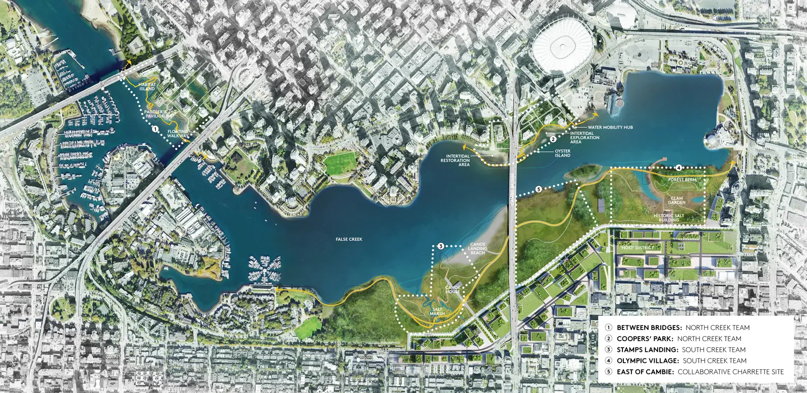 RECIPROCITY AND EXCHANGE Vancouver is situated on the unceded traditional homelands of the xwməθkwəy’əm (Musqueam), Skwxwú7mesh (Squamish), and səlilwətaɬ (Tsleil-Waututh) Host Nations. The area currently known as False Creek has significant meaning to Host Nations who have stewarded the land since time immemorial. Today, the shoreline is a major destination for residents and visitors, and vulnerable to flooding as sea level rises to one meter and beyond in the coming century. The Sea2City Design Challenge was a 12-month initiative to reimagine Vancouver's False Creek shoreline in the context of reconciliation between Host Nations, the City, the province and wider community. Embodying values of reciprocity and exchange, this challenge positioned teams as collaborators rather than competitors, with shared cultural advisors and “collaboratorium” workshops with the city and both teams. The design outcomes inform a framework and vision that prioritizes reconciliation with Host Nations to guide City and regional Coastal Adaptation Plans.