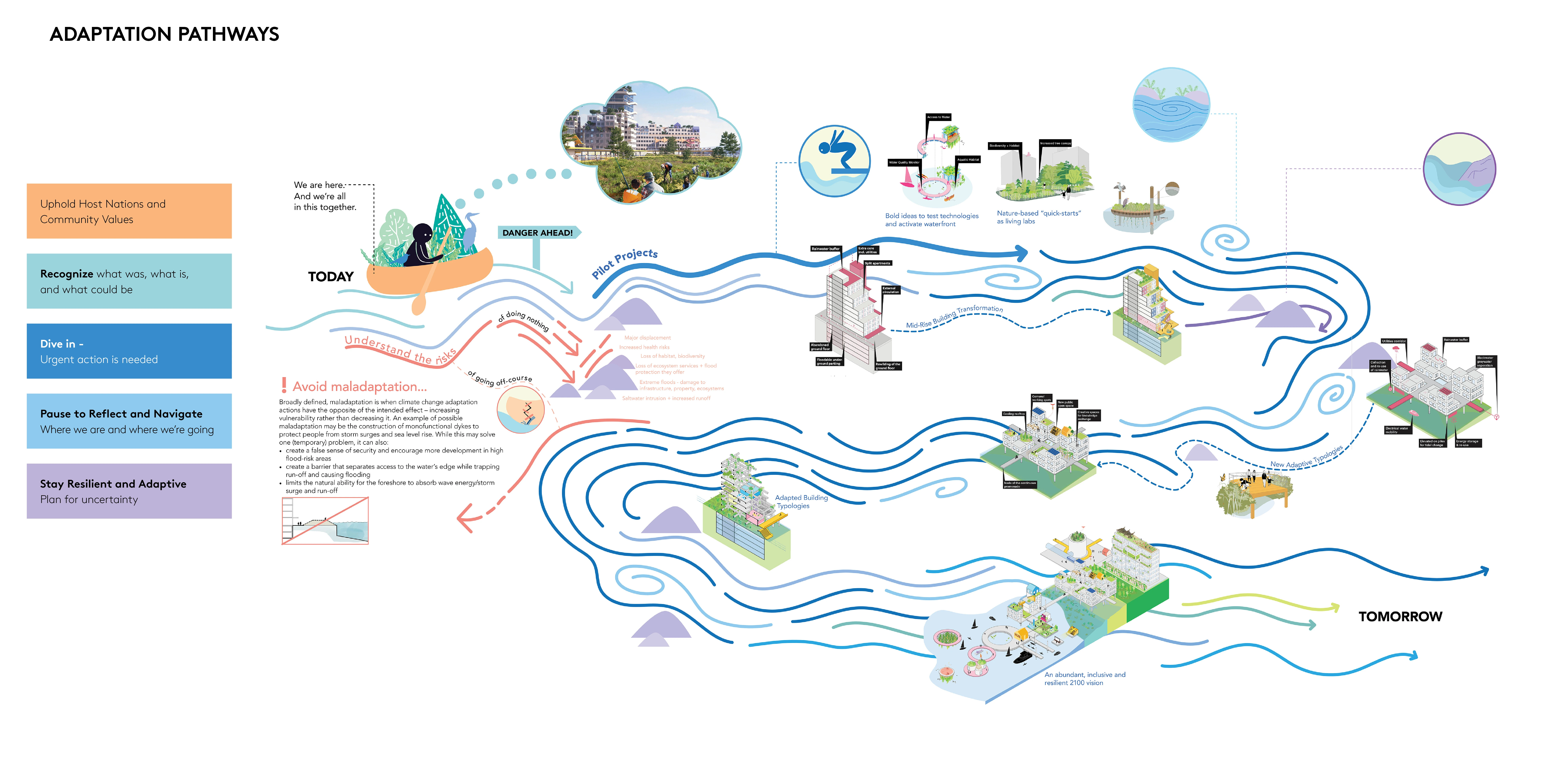 COMPREHENDING THE CLIMATE CRISIS The adaptive design responses illustrated short-term and long-term design opportunities to protect and adapt the promenade and surrounding land and water scapes. Responding to the urgent need for shared comprehension of the climate crisis, curated cultural events specific to climate adaptation supported collective learning and capacity building. This work was recognized by the International Association for Public Participation (IAP2), with the Canada Indigenous Engagement Award and the International Project of the Year Award.