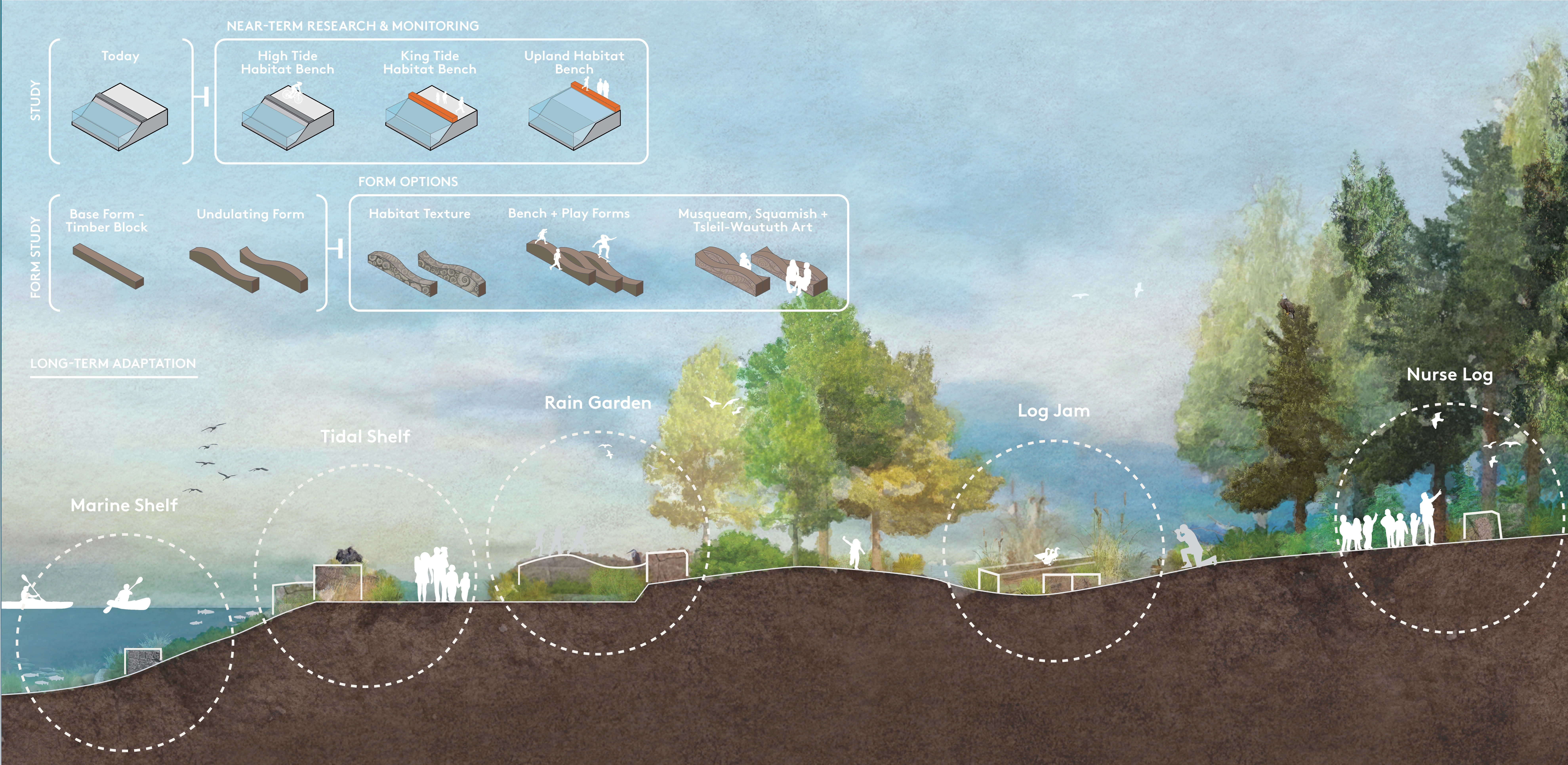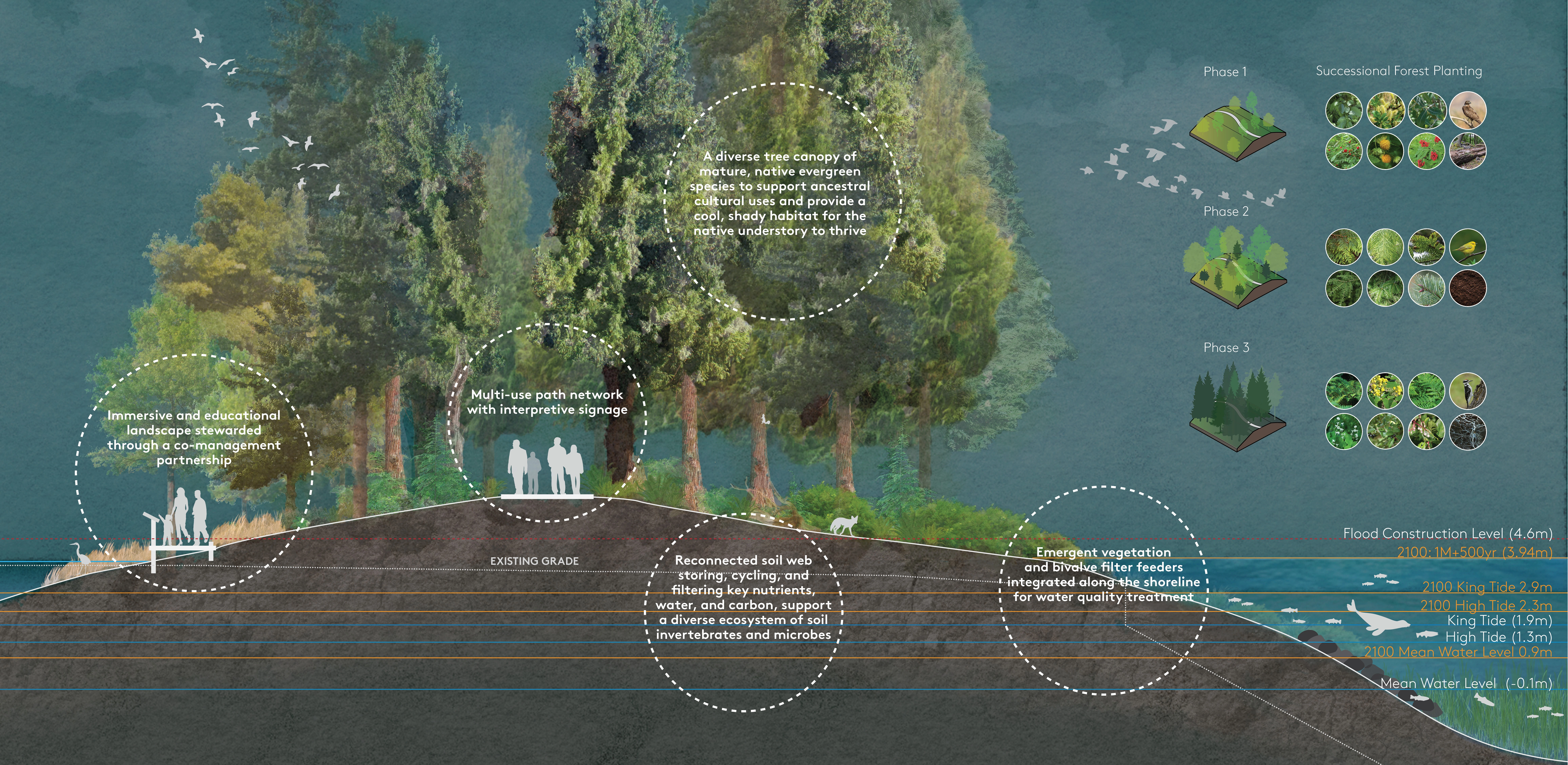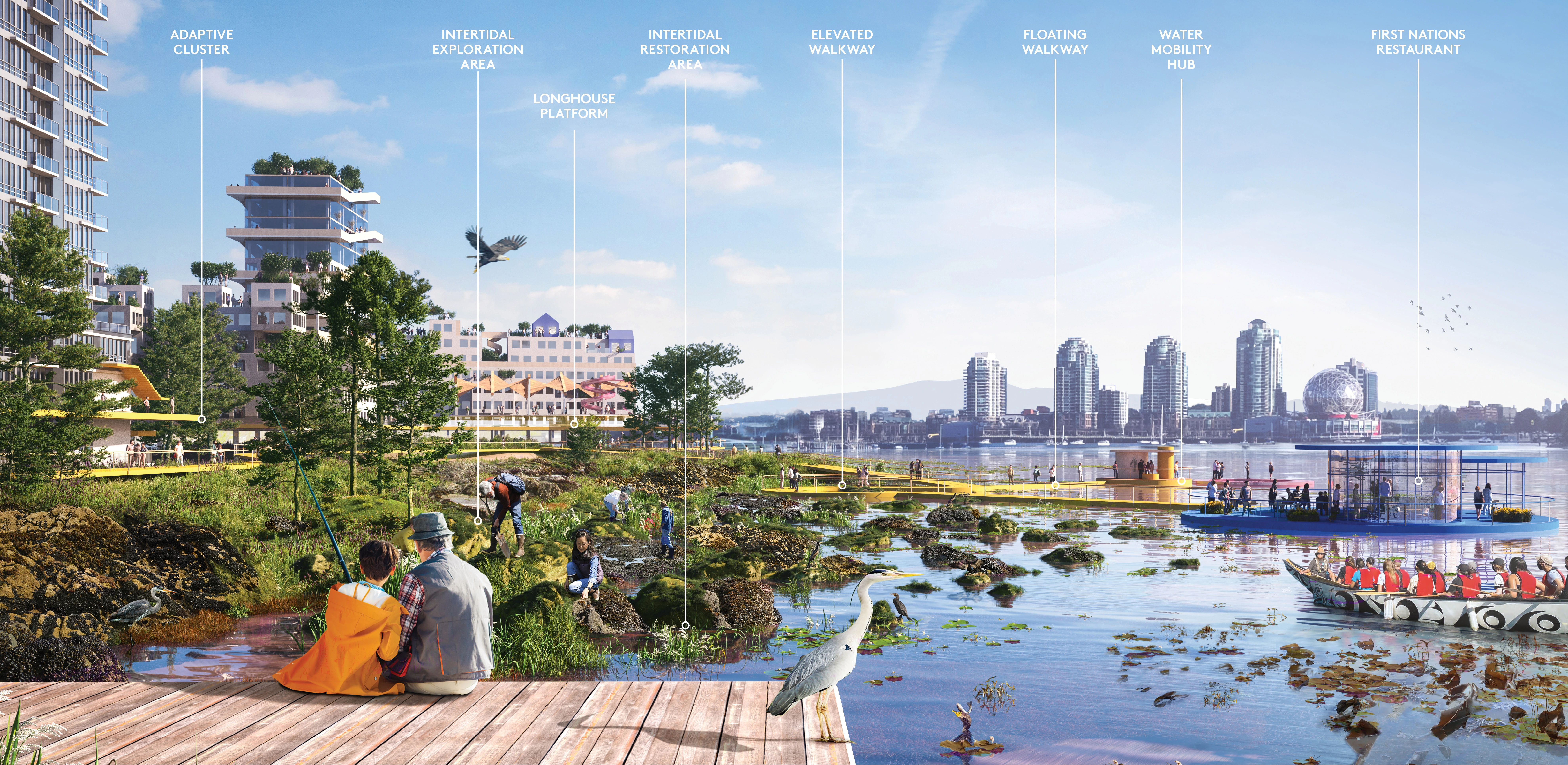 Grounded in the city of Vancouver B.C.’s commitment to truth and reconciliation, this nature-based climate adaptation approach envisions a return to the historic False Creek shoreline. A precedent-setting process prompted ongoing, continuous learning between city and province agencies, a youth adaptation lab, cultural artists, designers, the public, and Host Nation cultural advisors. With reconciliation and reciprocity as the foundation, design outcomes represent a future in which Host Nations are active, celebrated partners in the strategic transformation of an ever-changing shoreline over generations. Both visionary and technically informed, this work inspires the practice of adaptation and charts a course for meaningful reconciliation.