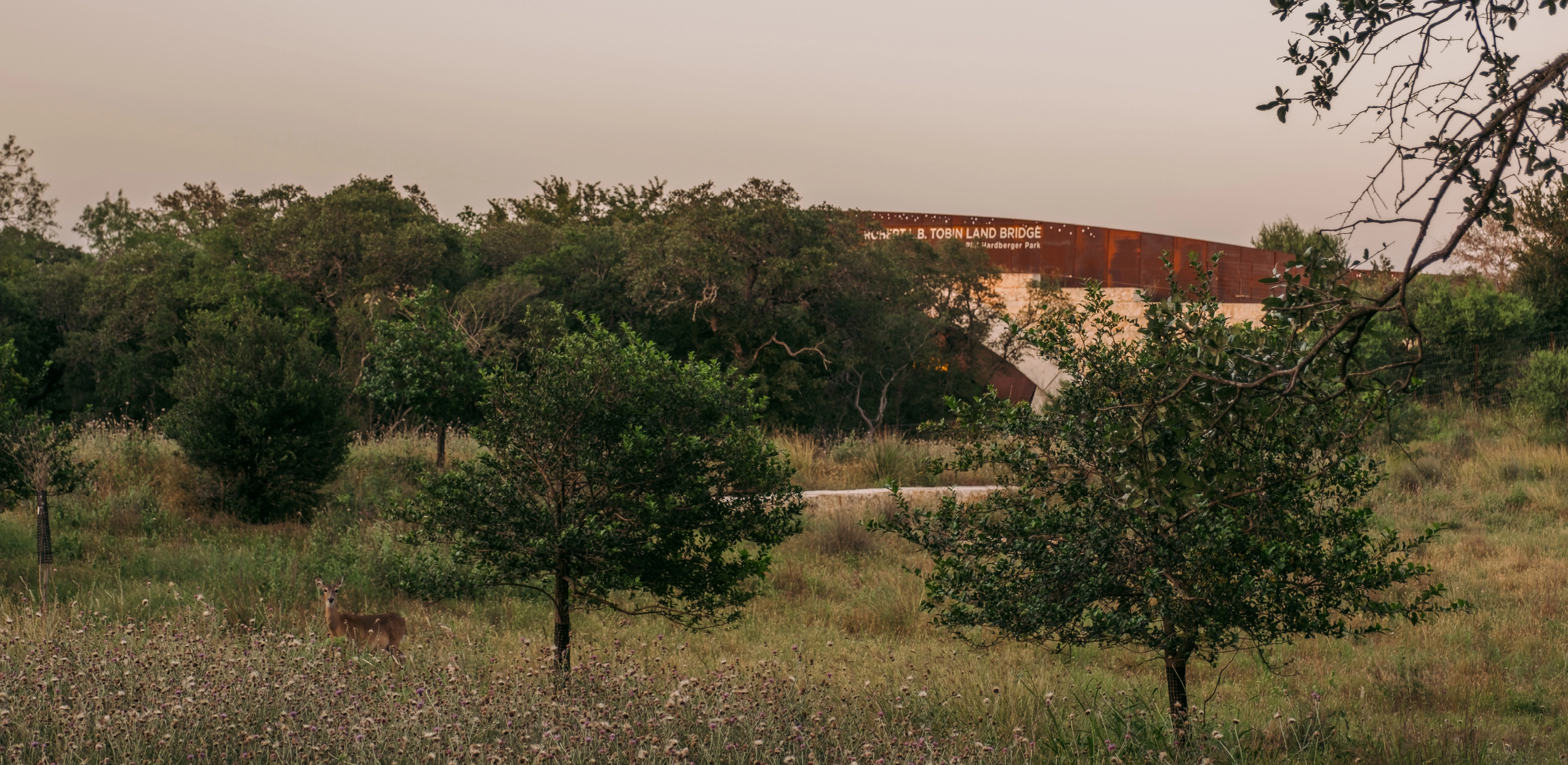 The Robert L.B. Tobin Land Bridge of Phil Hardberger Park in San Antonio is the first land bridge of its kind, for both human and wildlife passage, in the United States. At a monumental environmental scale, the bridge reconnects a once bisected, mile-wide tract of natural area and public park. It restores a major ecological sanctuary for wildlife along the longest creek corridor in Bexar county, prioritizing wildlife passage alongside people. More than infrastructure, it is a continuation of the land itself, where the life of restored south Texas scrubland and savanna unfolds over a cityscape as a new model for urban wildness.