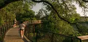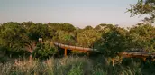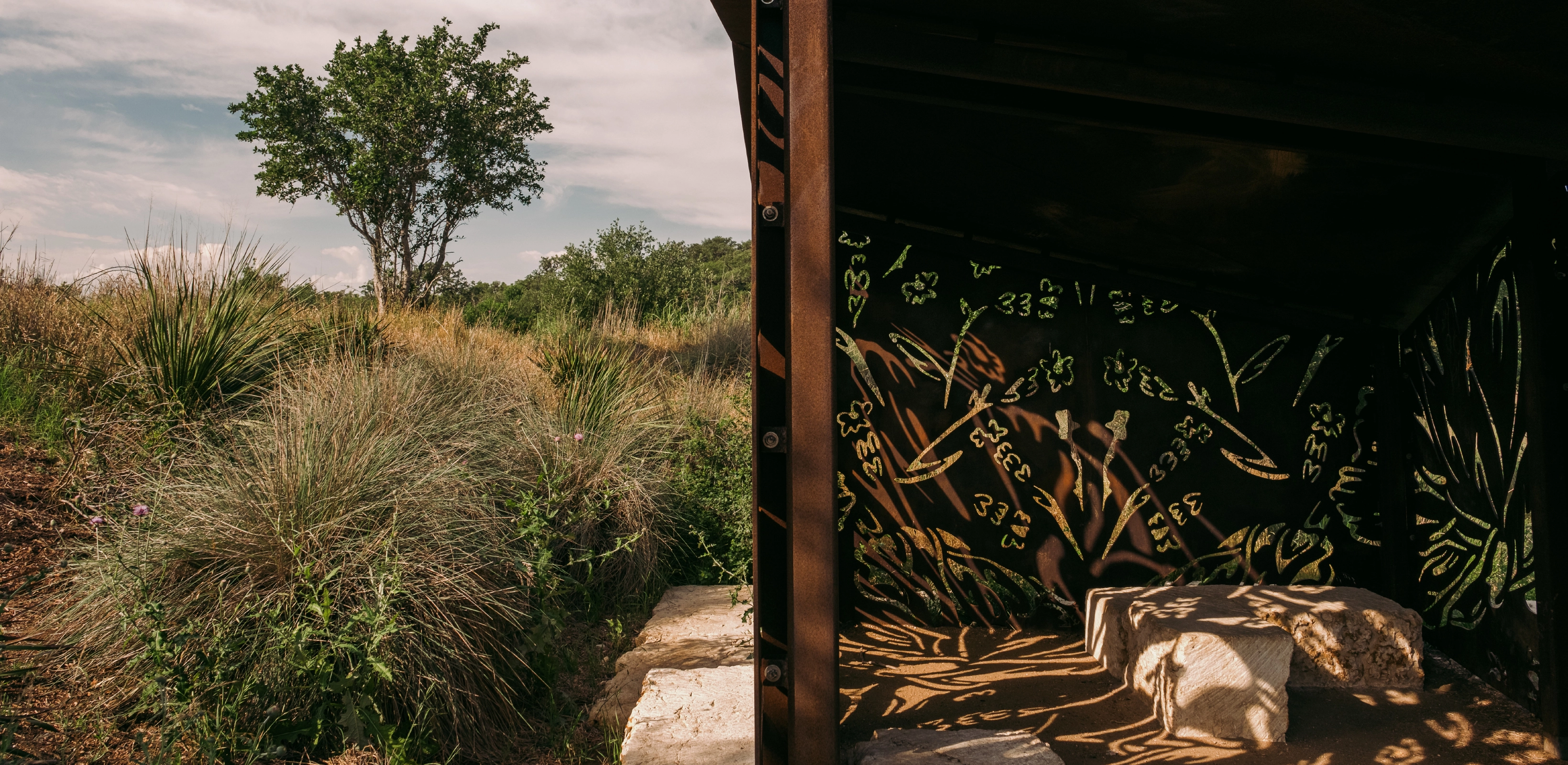 The bridge was conceived as a flowing extension of the land itself. Sculpted earth, layered with amplified savanna and scrubland, spans 175’ across Wurzbach Parkway and reconnects both sides of the park back to Salado Creek. The 160’ wide corridor of densely planted landscape is bermed along one edge for wildlife movement, while offering a narrower, accessible trail system for people. A 25 foot elevated skywalk of wood and steel sensitively winds through the tree canopy to the top of the land bridge. At the summit, steel parapet bridge walls create unexpected quietness, and the view extends for miles across the city. Wildlife blinds are sited at either end of the bridge, offering shade and a chance to observe animals at the water guzzlers. The perforated wall patterns take cues from the site’s flora and fauna, created by local artists and detailed by the landscape architects. All the materials, plants and forms of the bridge are responsive to the site and inspired by the region.