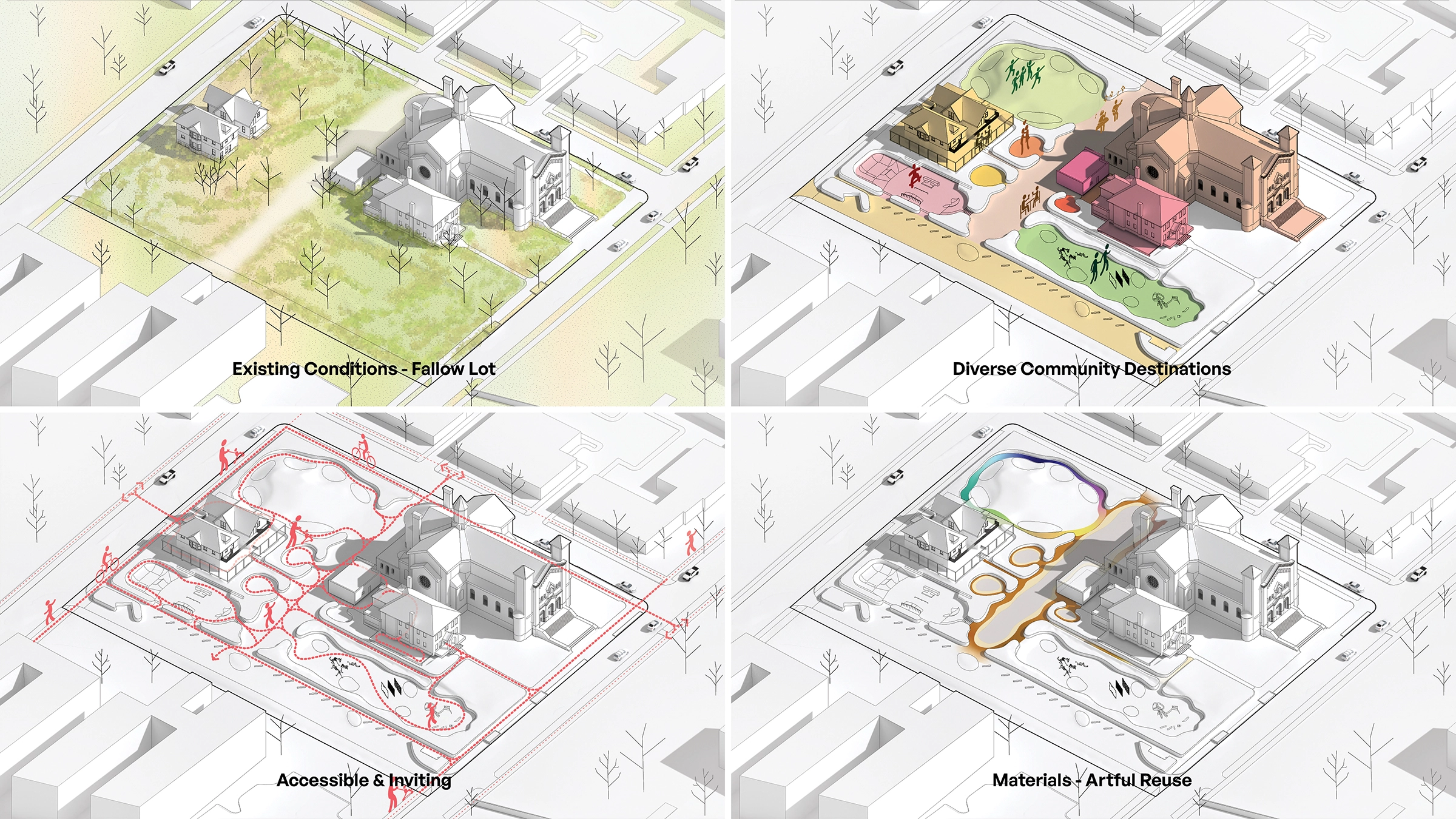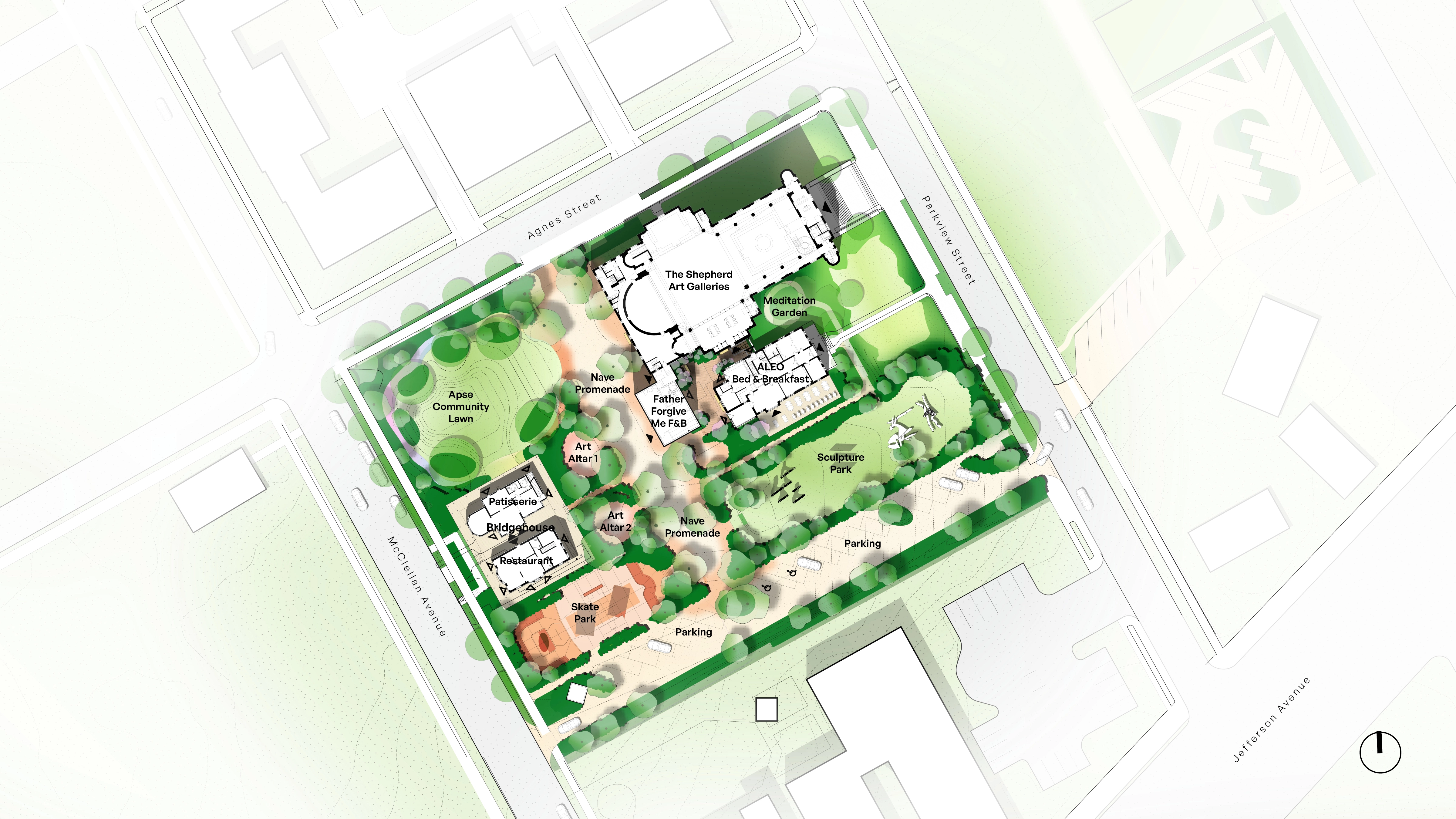 Design Approach - Program and Accessibility: The design integrates diverse programmatic needs; creates a sense of discovery and play; harmonizes with the vast brick Romanesque church; and achieves critical site performance goals such as a high pervious-impervious ratio, ADA accessibility, and robust native planting. The site layout is conceived as an interlocking series of outdoor “rooms” hosting the wide variety of program. The plan composition is playfully inspired by the church’s architecture. In this way, spaces hint at apsoidal geometries, and adopt names such as ‘The Nave Alley’, the “Art Altars”, and “Father Forgive Me” dining area. The Nave is a municipal alleyway doubling as a neighborhood thoroughfare.Circulation is laid out to invite the broader neighborhood and create a sense of discovery.