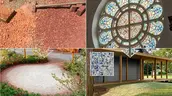Design Approach - Materials and Planting: Walking around the neighborhood, the team found great beauty in materials and textures. The design team chose to embrace the story of the site, celebrate the broken glass, brick, and decay, and explore an artful and sustainable approach to material reuse. To achieve drainage requirements, porous paving is used extensively. Bricks were salvaged from the church’s decaying nunnery, then crushed and integrated with the site's paving. Local recycled glass—tumbled and rounded—was used in the paving, paying homage to the church’s stained glass windows. The glass gravel is placed in the meditation loop, following the logic of a ROYGBIV color wheel, referencing the identity of the community as an arts hub. Wood was salvaged from local trees downed during storms. For the project, the team designed furniture, signage, and wayfinding, using the reclaimed wood, and working with a local fabricator, creating a unified material vocabulary.