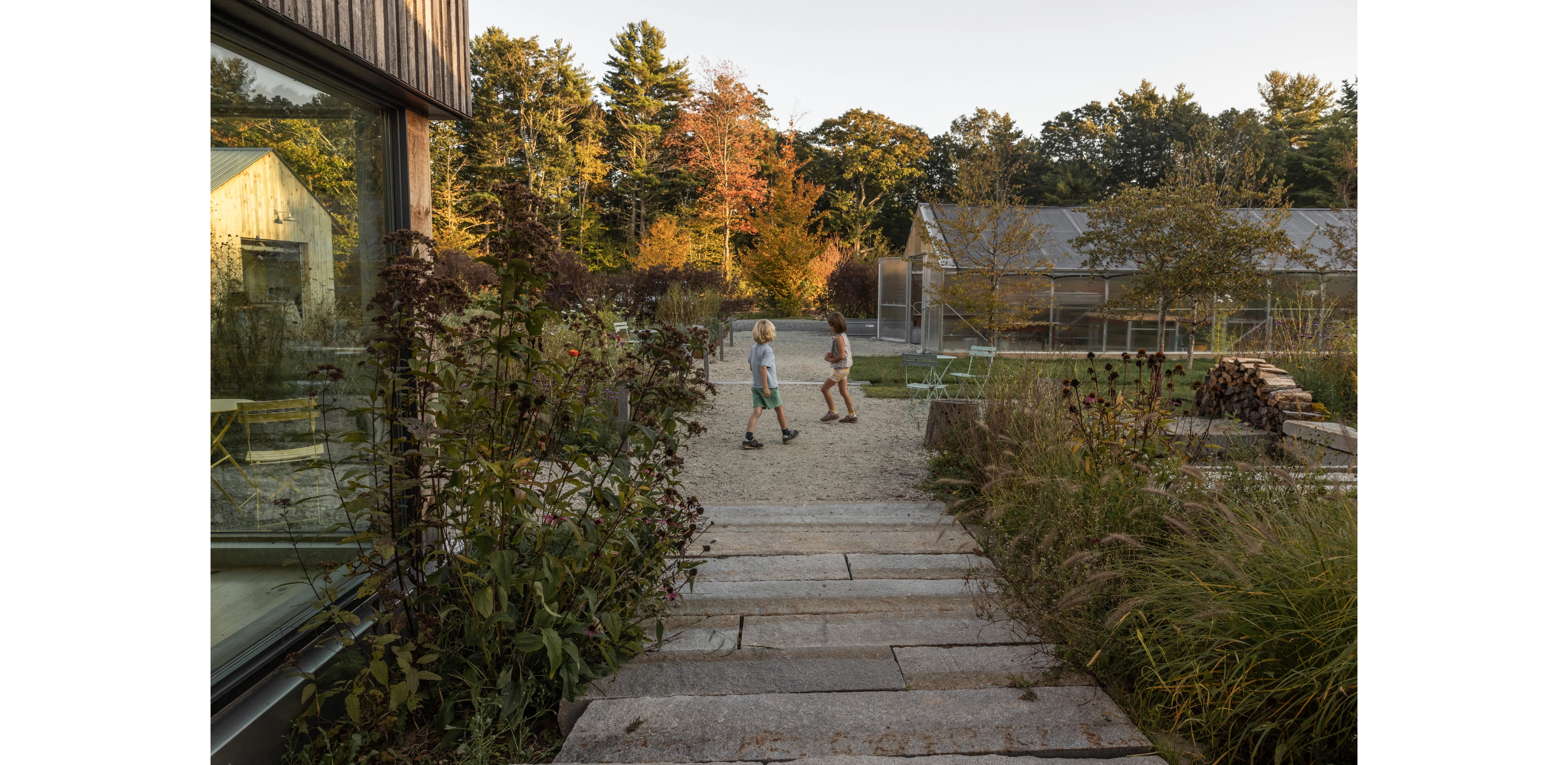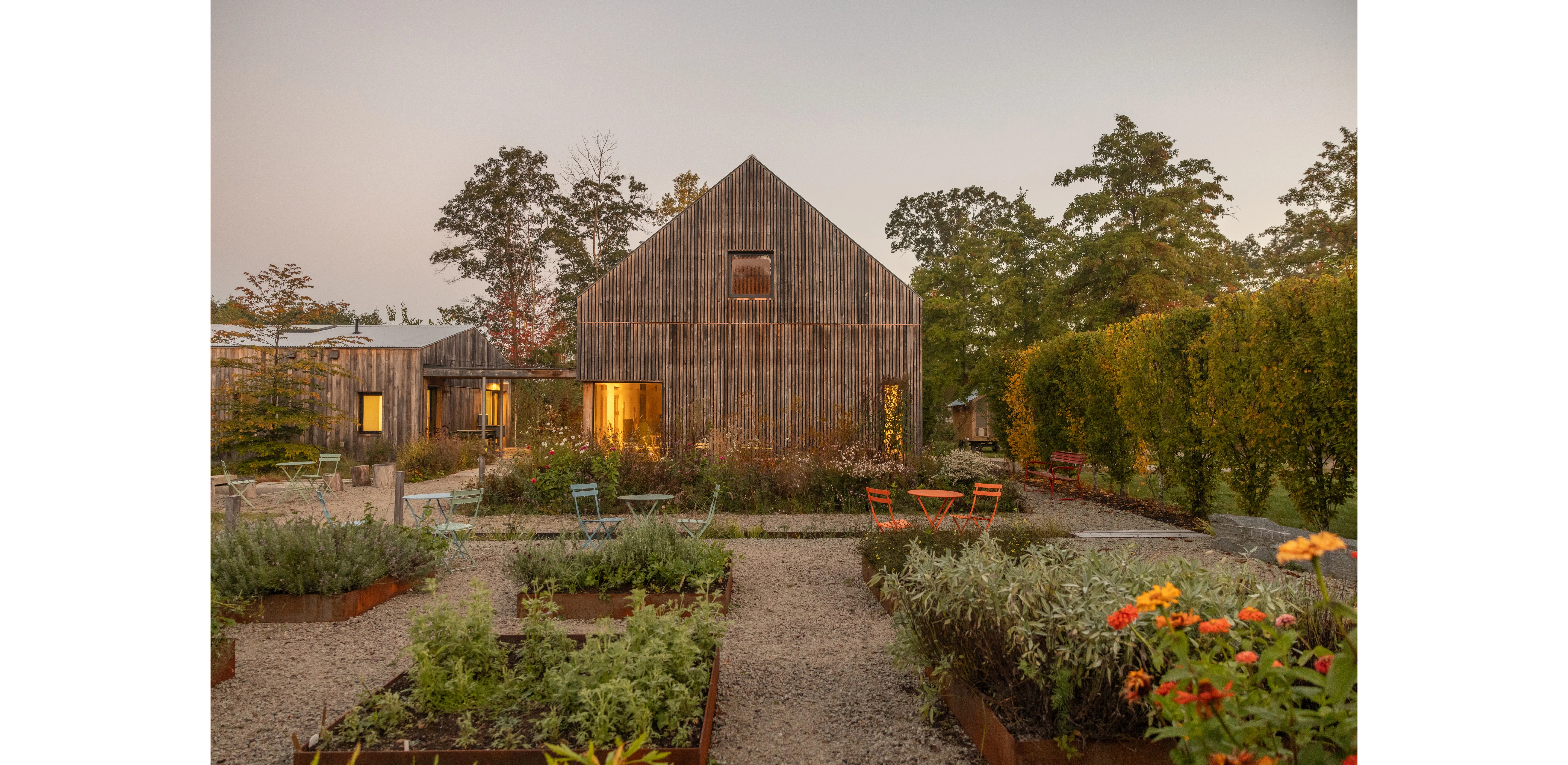FIELDWORK AND PRACTICE In 2020, a trio of buildings were completed, expanding Charbrook’s role in our practice. A studio, grange hall and greenhouse were constructed on the lower pasture using passive-house standards and sustainably harvested site timber. The farm has become a series of exploratory plots where we study materials, test planting strategies and experiment with field-based design. We have the construction equipment and ability to build mock-ups and host charrettes and farm tours. Students from design programs come for nursery dig and plant days. Lectures, exhibits and events engage the broader public. Charbrook is at once a home and a place of inquiry, making, and community—where the act of designing is inspired by the rural landscape.