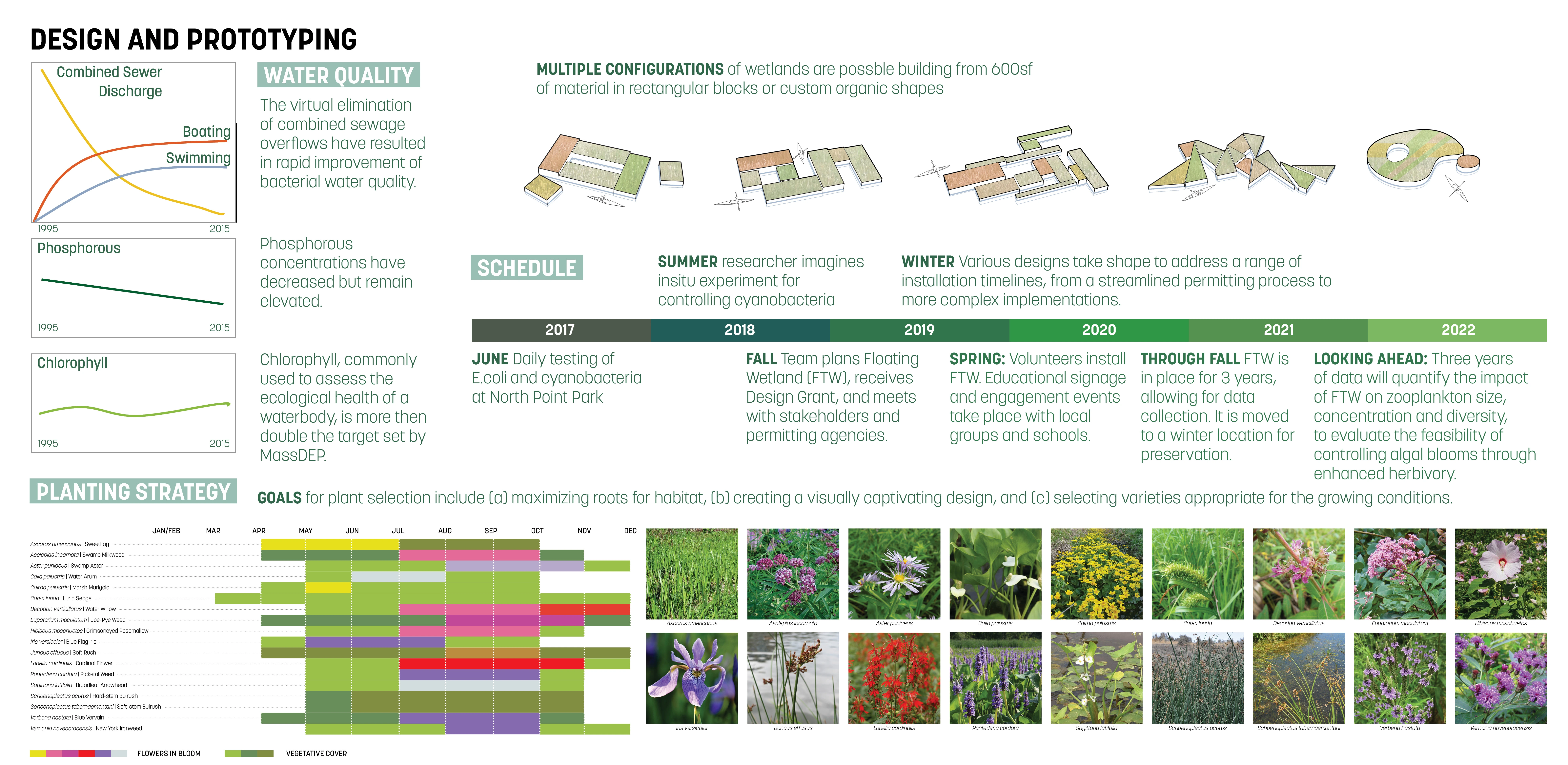 The processes of urban development radically alter urban water bodies. Engineered drainage systems, land use changes, and loss of wetland habitat have resulted in water bodies with high levels of organic loading but limited natural pathways for processing pollutants. The Charles River Floating Wetland Pilot Project explores Floating Treatment Wetlands (FTWs) as an in-stream solution to improve water quality and ecological function in urban water bodies. FTWs are artificial, self-buoyant islands that support native wetland plants, providing habitat and removing nutrients from the water column. Synthesizing data from three multi-year pilots in Boston, Chicago, and Baltimore, this study focuses on phosphorus removal, ecological changes, and community engagement. The research addresses the challenges of translating short-duration lab and mesocosm experiments into practical, field-scale applications. This multi-year field study provides a defensible method for sizing FTWs to achieve specific water quality goals. Key findings include: Phosphorus Removal: FTWs achieve phosphorus removal through plant uptake. In this study, mass removal through harvesting of aerial vegetation was 2.3 g·P m⁻² year⁻¹. One acre of FTW can offset nutrient loading from 7-15 acres of dense urban development, comparable to infiltration-based green infrastructure and more effective than biofiltration methods and green roofs. Ecological Benefits: FTWs create measurable changes in biotic structure. Localized changes include increased abundance of native prey fish and increased mean body among large-bodied zooplankton. These changes are consistent with top-down control of algal biomass observed in healthy clear-water ecosystems. Community Engagement: The project serves as a platform for hands-on environmental education through STEAM kits, kayak tours, youth design sessions, and on-site experiments. Since its installation, 408 STEAM kits with informational materials in six languages have been deployed in local schools, enabling students to build their mini-floating wetlands and learn about river ecology. Kayak tours provide immersive learning experiences, while youth design sessions incorporate community feedback into future FTW planning. A solar-powered fish camera was installed to monitor fish populations. The research provides a basis for scaling FTWs in urban environments, offering landscape architects a new tool to address water quality challenges while enhancing ecological and social benefits. Along the Lower Charles River, where native wetland vegetation is scarce, FTWs provide critical habitat for small fish, foraging grounds for birds, and food sources for larval insects, and may serve as stepping stones in recovering urban waterways. For humans, access to urban blue spaces has been linked to improved well-being and reduced health risks. Future research must assess FTWs’ long-term impacts, scalability, and integration with broader green infrastructure. By merging science, design, and public outreach, the project demonstrates FTW’s potential to transform degraded urban waters into vibrant, healthy ecosystems and environmental stewardship. This project not only advances the field of ecological engineering but also provides a model for integrating innovative green infrastructure into landscape architecture. The findings highlight the importance of combining ecological interventions with community engagement for sustainable urban water management.