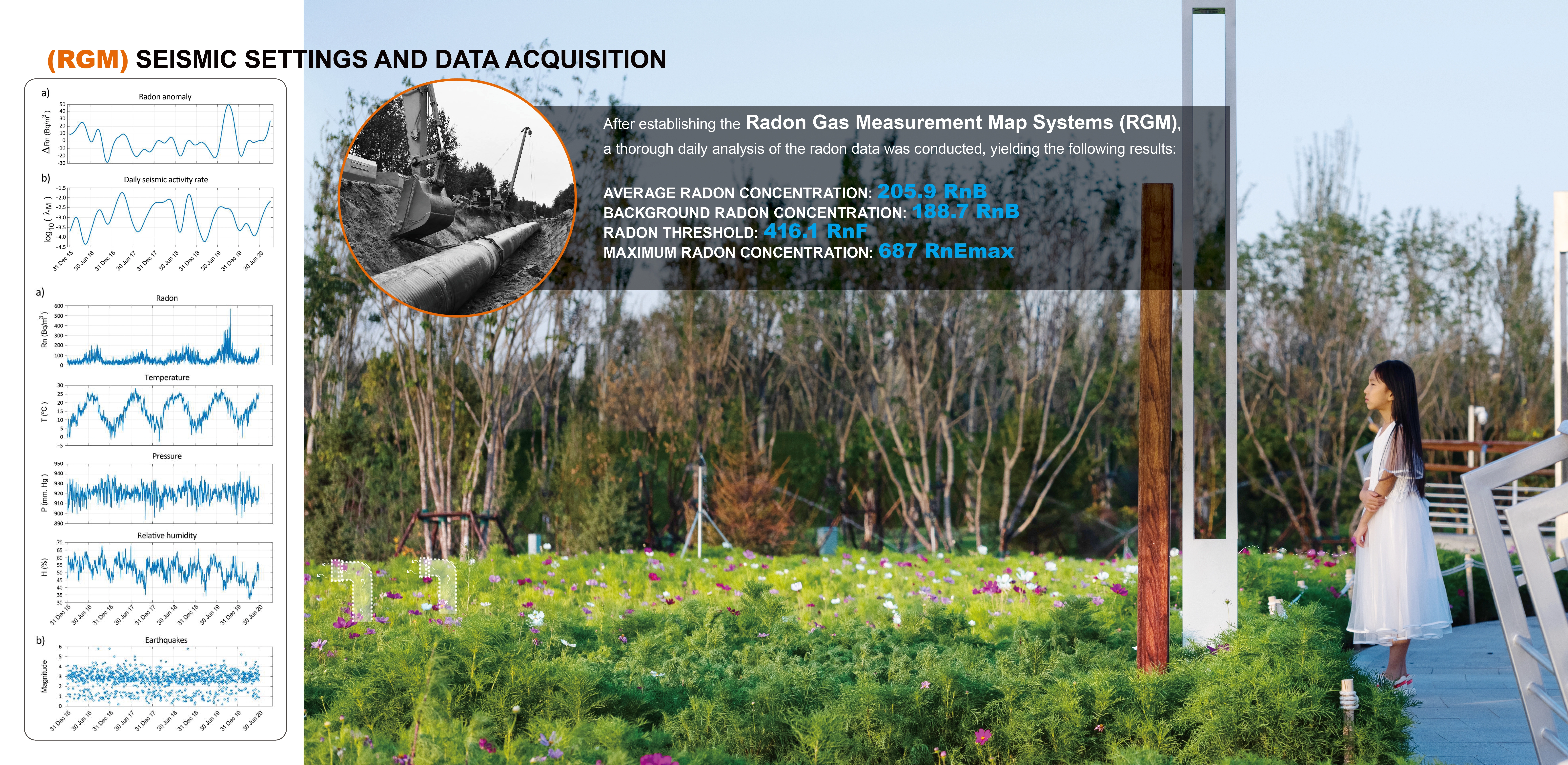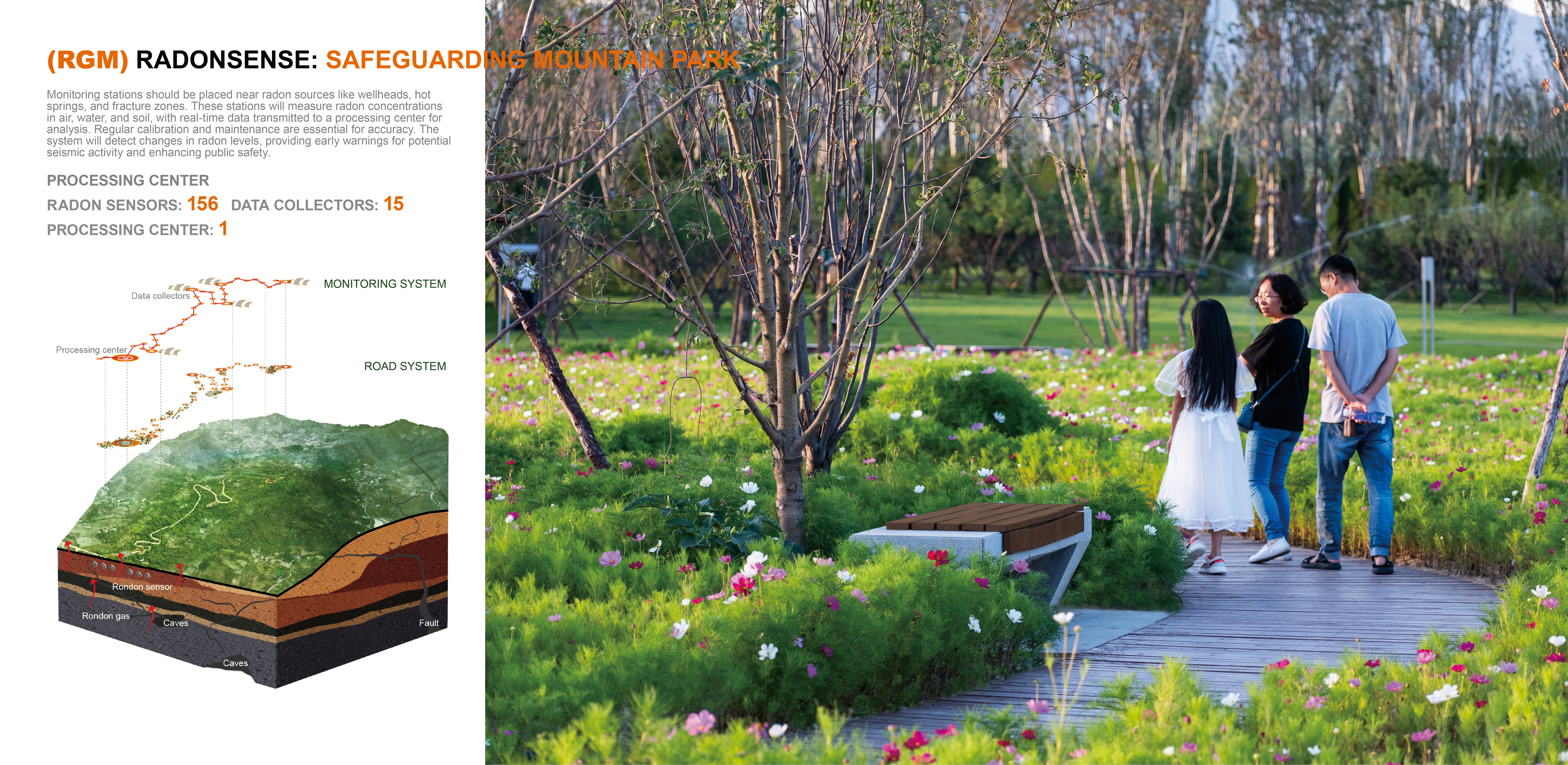 Research reveals that radon fluctuations in seismic-prone regions are key to earthquake monitoring. Integrated along park roads, the Underground Radon Gas Measurement (RGM) system continuously tracks radon fluctuations—key seismic indicators. Data from 15 collectors is processed at a mountain monitoring center, generating real-time, color-coded risk maps for rapid earthquake assessment. Designed to blend into the landscape, this system enhances disaster preparedness while maintaining ecological balance.