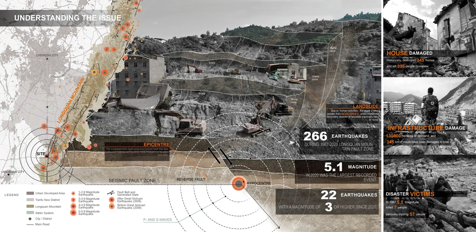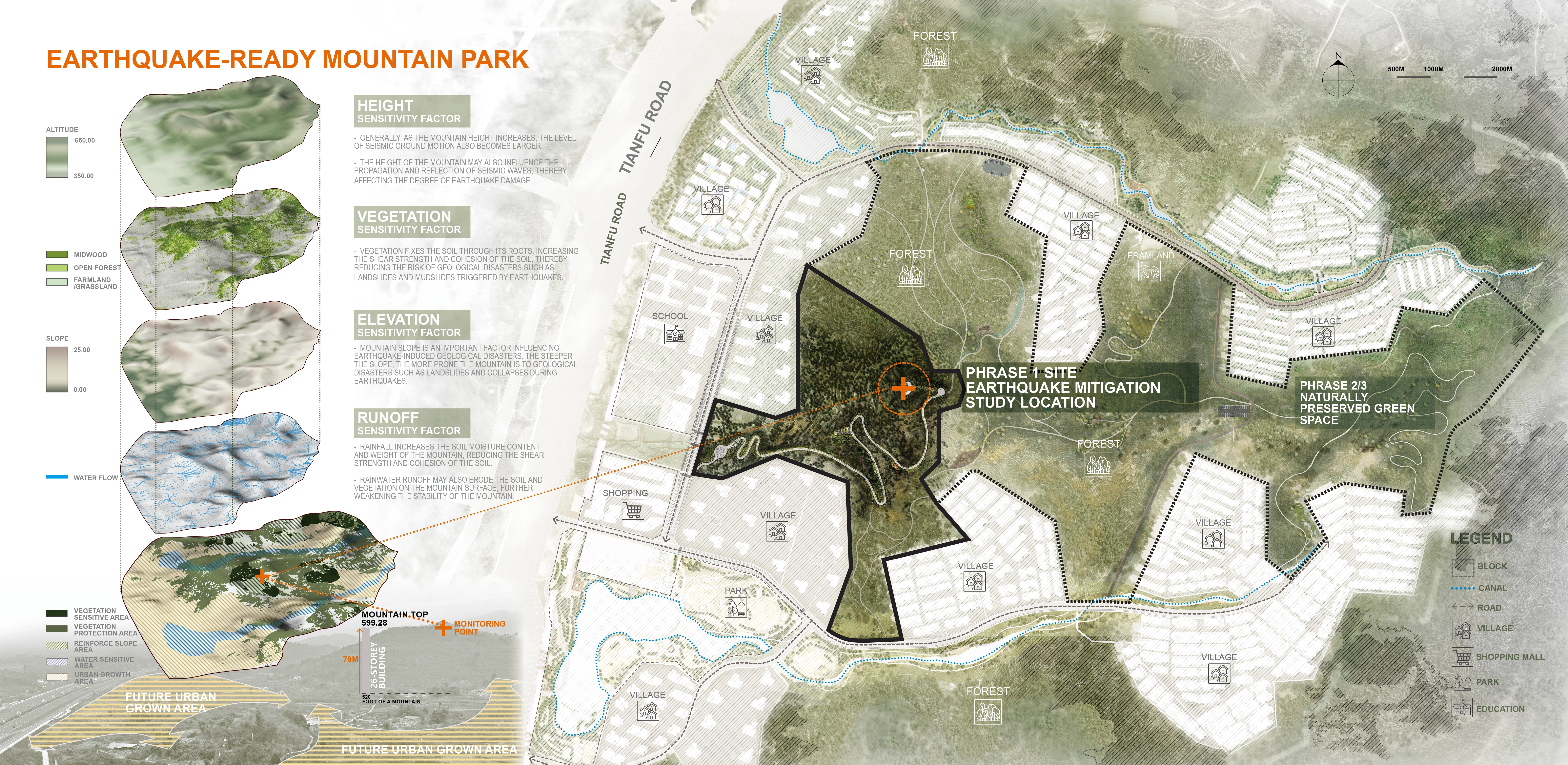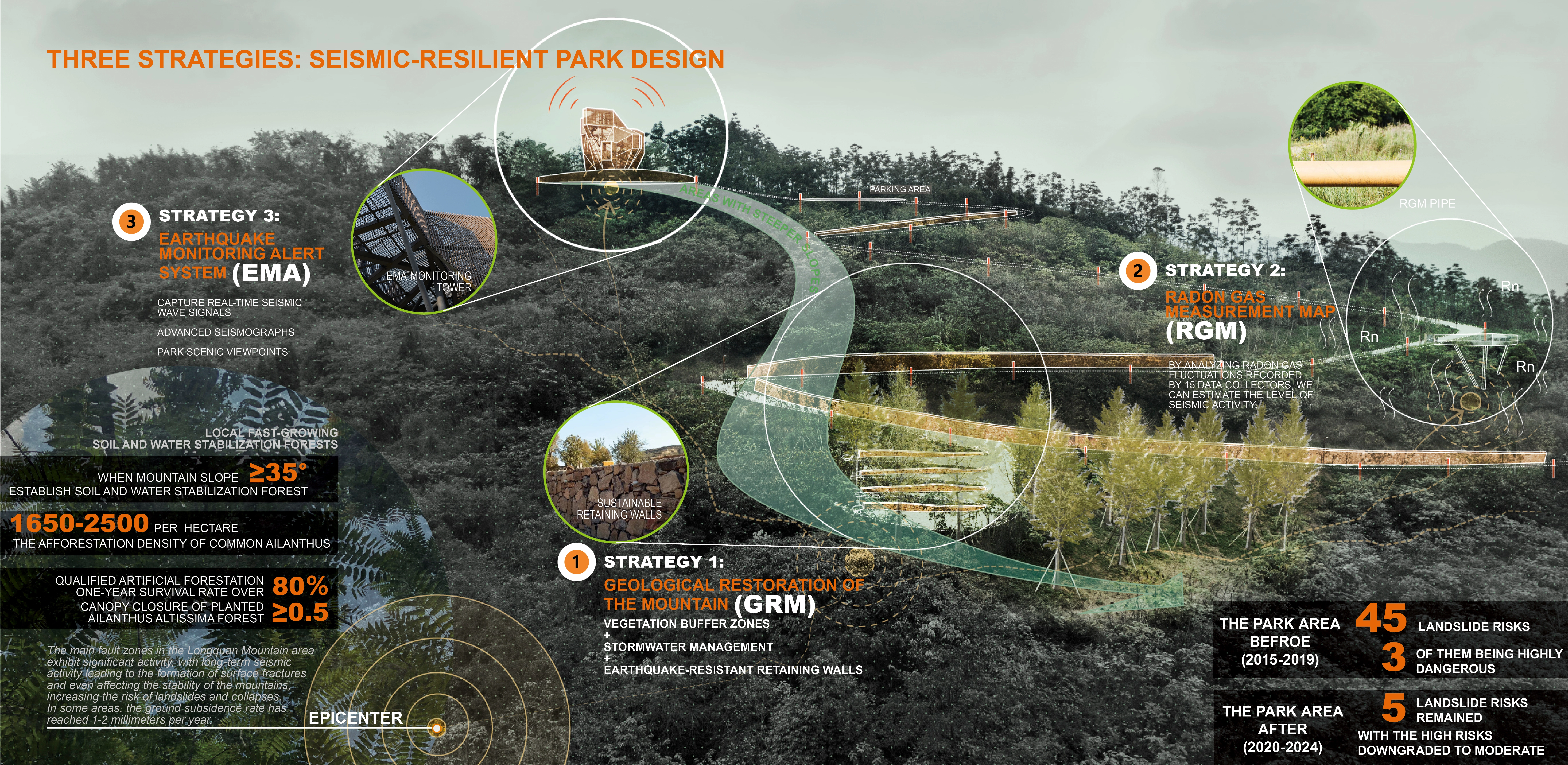 Through a research-driven design approach for Longquan Mountain Park, three key strategies—Mountain Geological Restoration(GRM), Radon Gas Mapping (RGM), and Earthquake Monitoring and Alert Systems (EMA)—demonstrate how green spaces can support disaster mitigation while maintaining ecological and aesthetic value. The study highlights landscape interventions to improve public safety and sustainability in seismic regions.