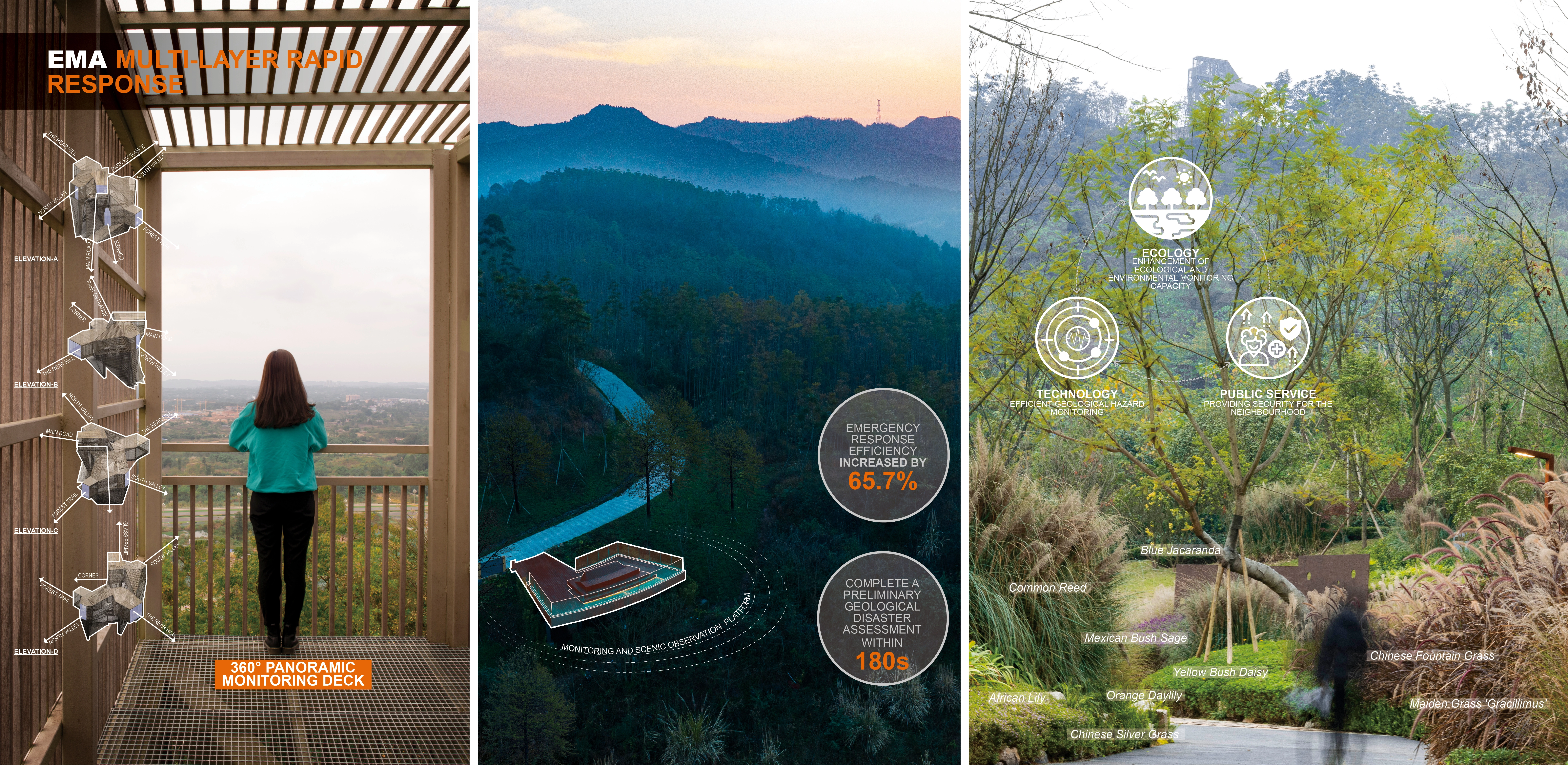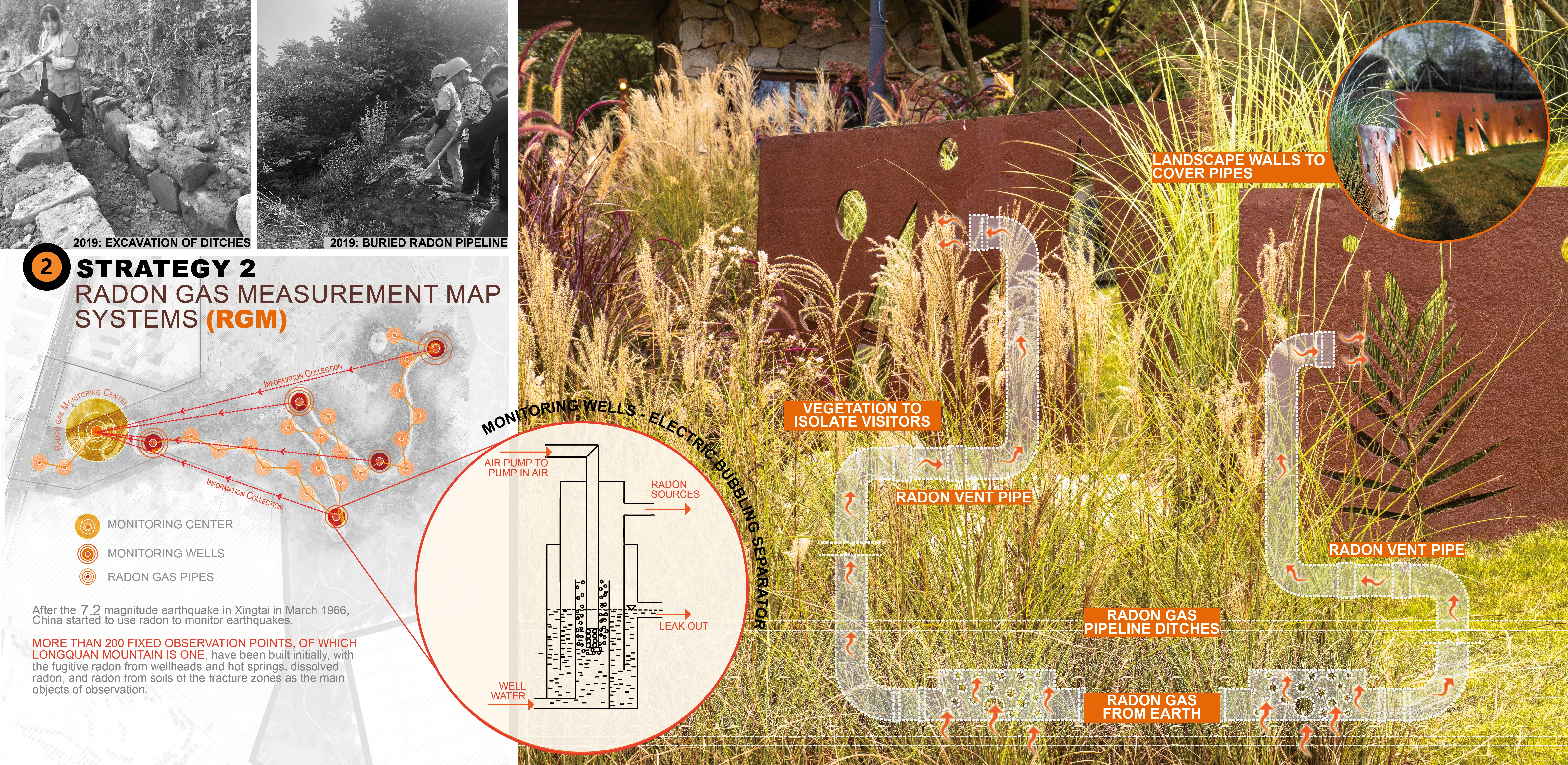 This study presents a landscape-based approach to earthquake disaster mitigation by integrating Geological Restoration of the Mountain (GRM), Radon Gas Measurement Mapping(RGM), and the Earthquake Monitoring Alert System (EMA). By combining advanced hazard prevention with ecological restoration, the design enhances seismic monitoring, early warning, and disaster resilience while also promoting soil and water conservation, landslide mitigation, and landscape aesthetics. Beyond reducing economic losses, this strategy transforms Chengdu’s mountainous terrain into a multifunctional public space, fostering ecological resilience and community engagement.