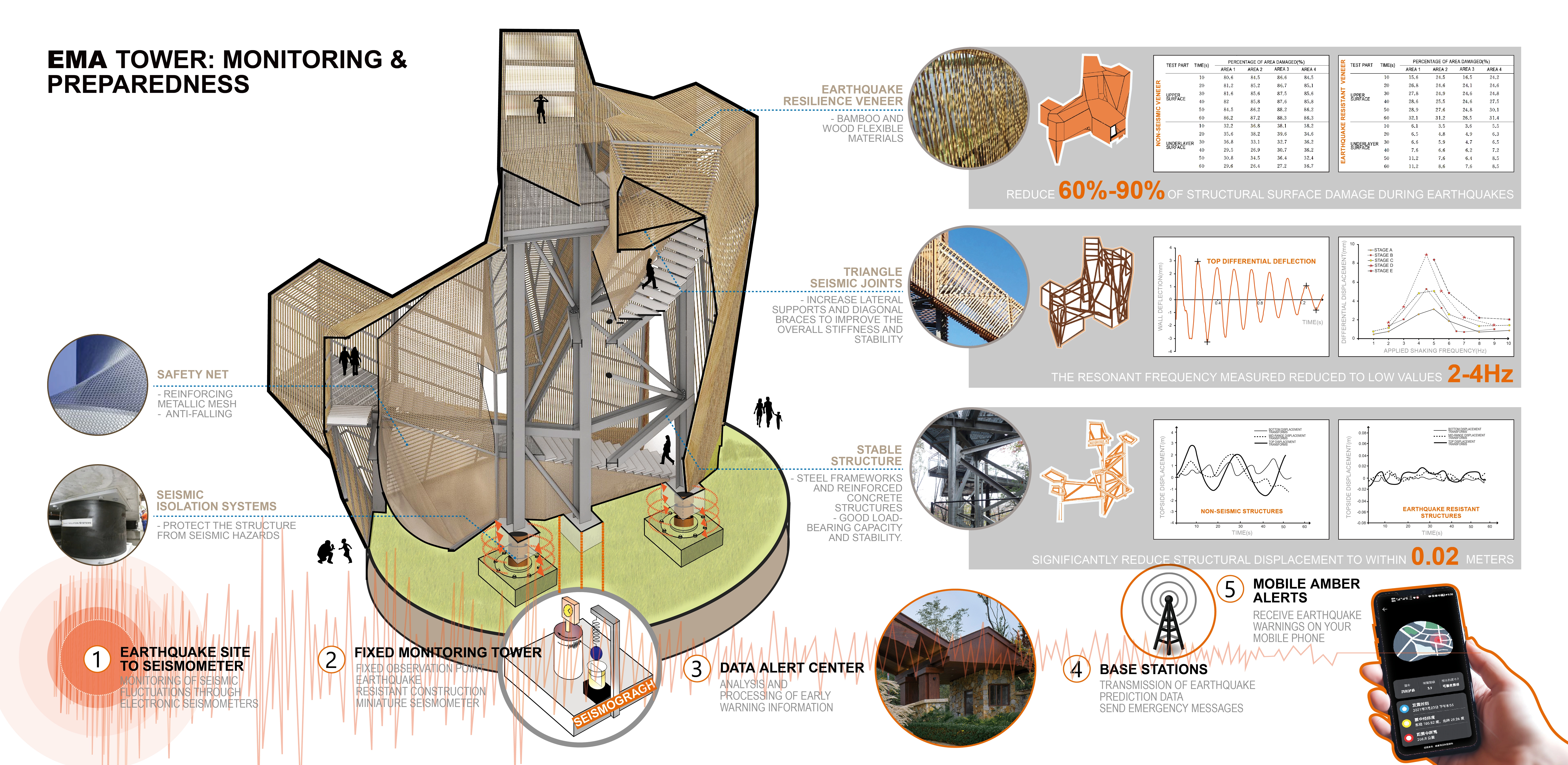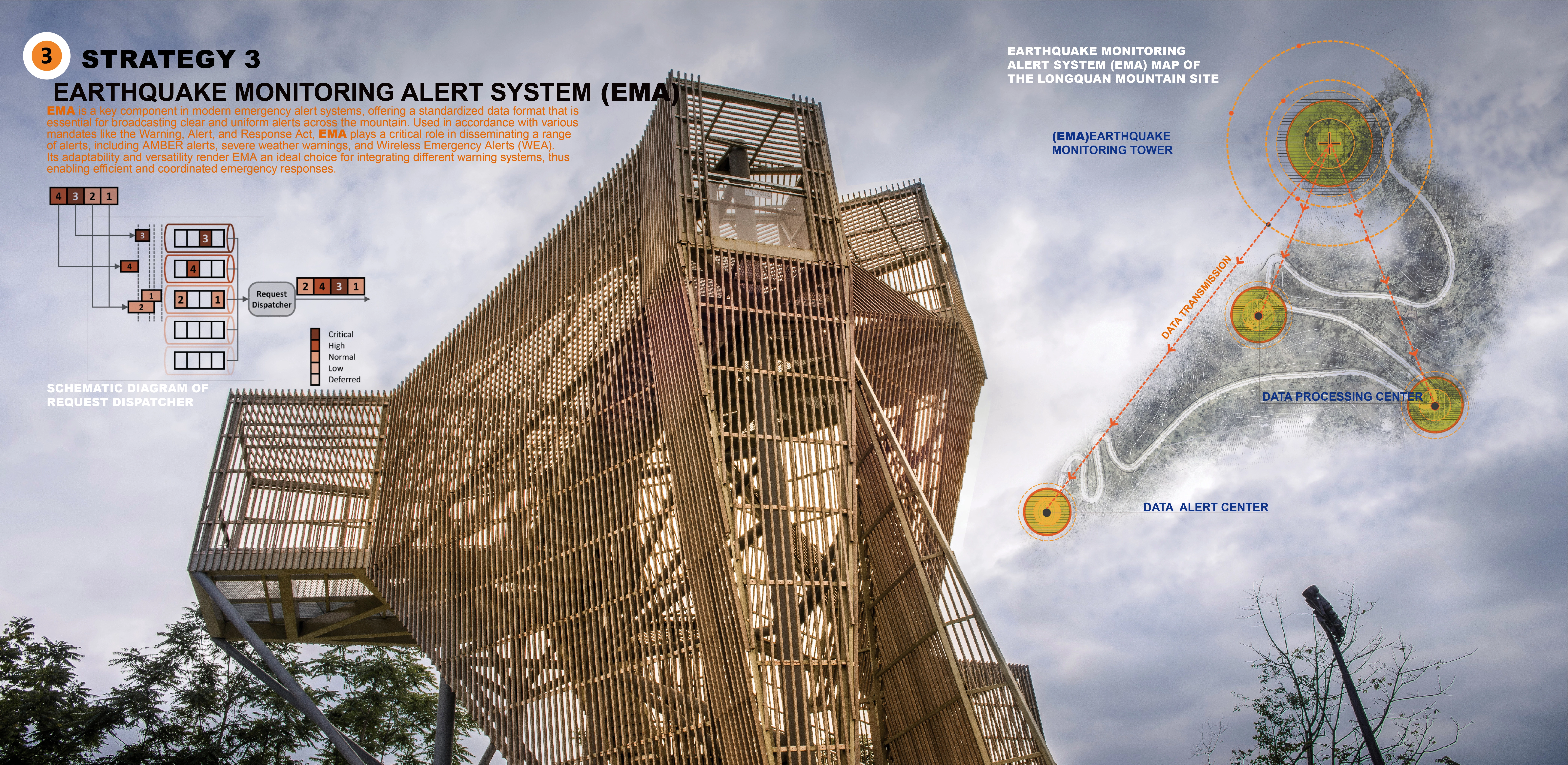 The Earthquake Monitoring Alert System (EMA) provides standardized, real-time alerts across the mountain, integrating with emergency warning systems like AMBER alerts and Wireless Emergency Alerts (WEA). At its core, an earthquake-resistant Monitoring Tower houses advanced seismographs for real-time detection while doubling as a scenic observation point for geological assessments. Data Processing Centers track seismic activity and soil displacement, relaying critical insights to the Alert Center, which delivers intuitive, map-based warnings. This integrated system enhances emergency response efficiency, ensuring swift, informed decision-making for disaster preparedness.
