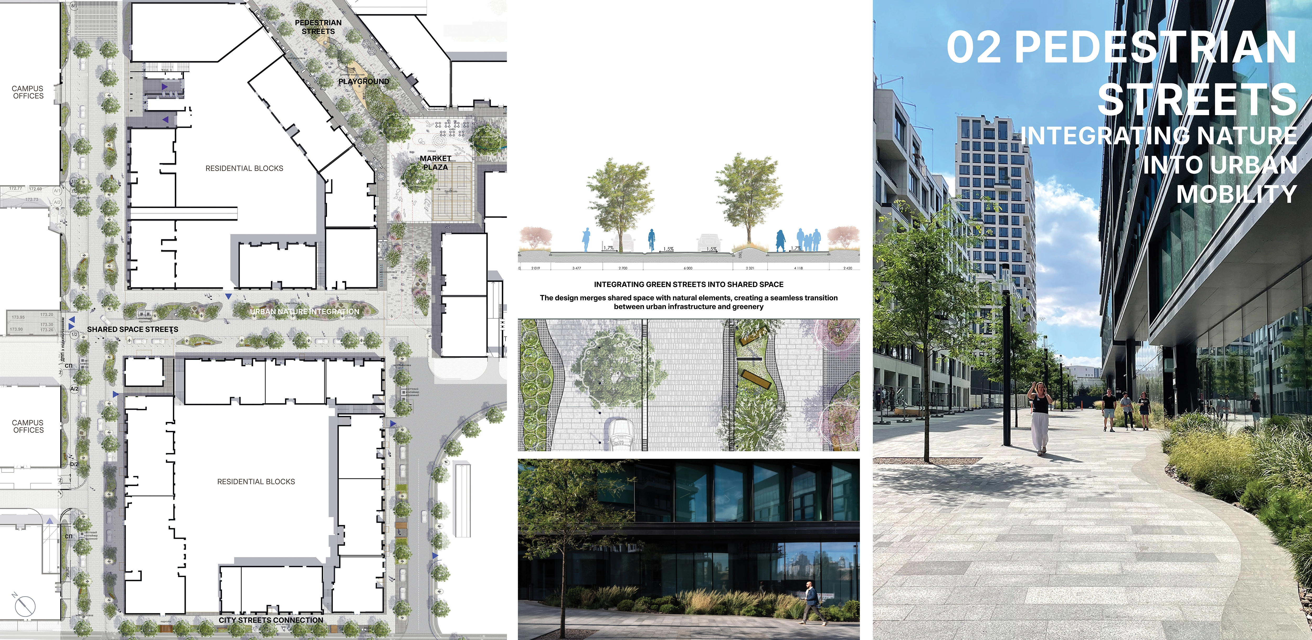 Pedestrian-first design – shared spaces prioritizing people over cars Flexible landscapes – multifunctional spaces fostering work, recreation, and interaction Material identity – corten steel, concrete, and wood reflect the industrial past while shaping a contemporary district