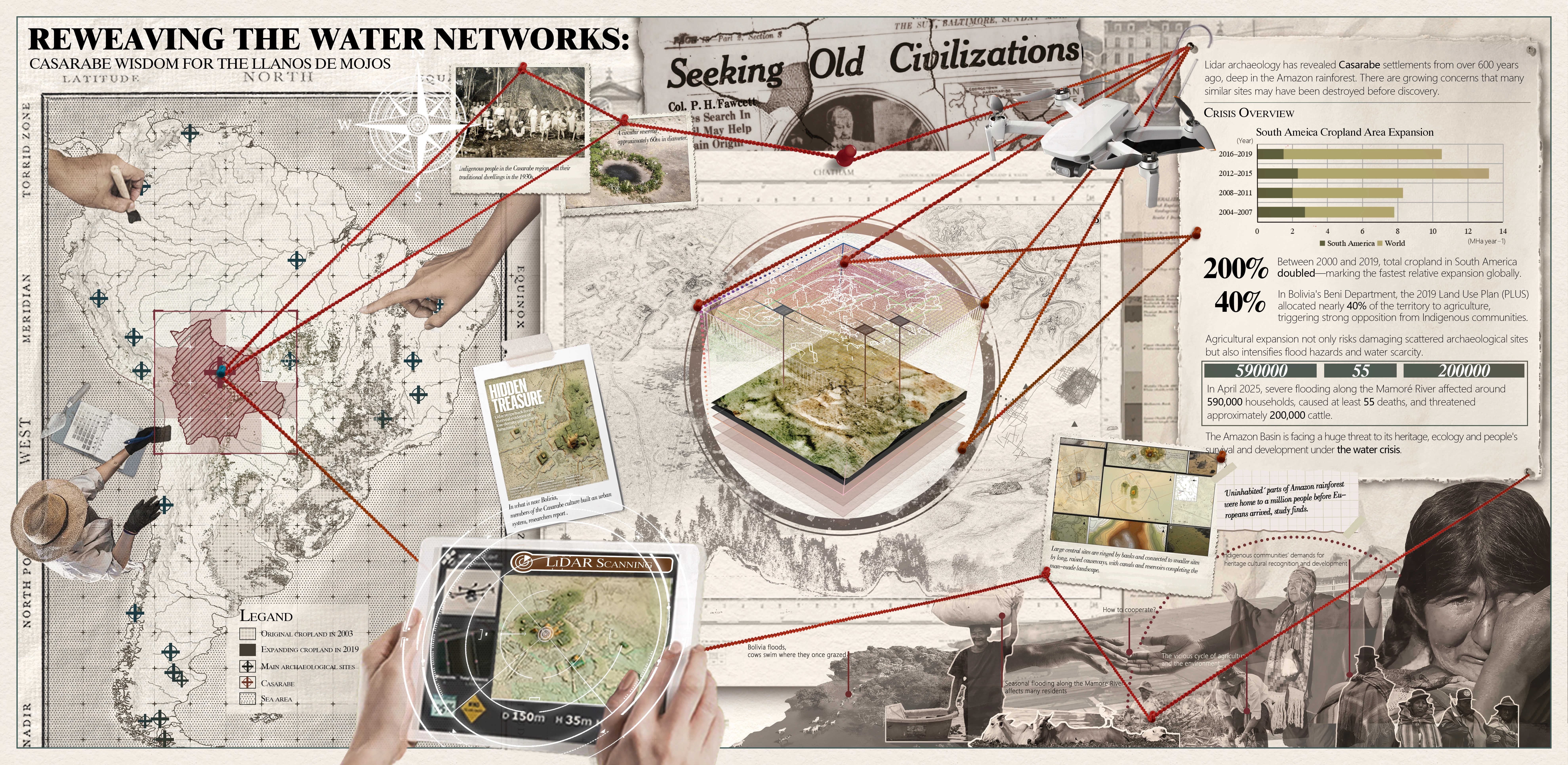 At the Casarabe heritage landscape in Beni Province, seasonal droughts and floods create water crises that threaten local communities, agriculture, and archaeological sites. The ancients countered extremes with ponds, canals, raised fields, and mounds, forming a resilient mosaic landscape. Drawing on three water-wisdom legacies—Flood Management, Efficient Agricultural Water Use, and Integrated Water Culture—we establish a Flood Management Network, an Agricultural Water Ecology Network, and a