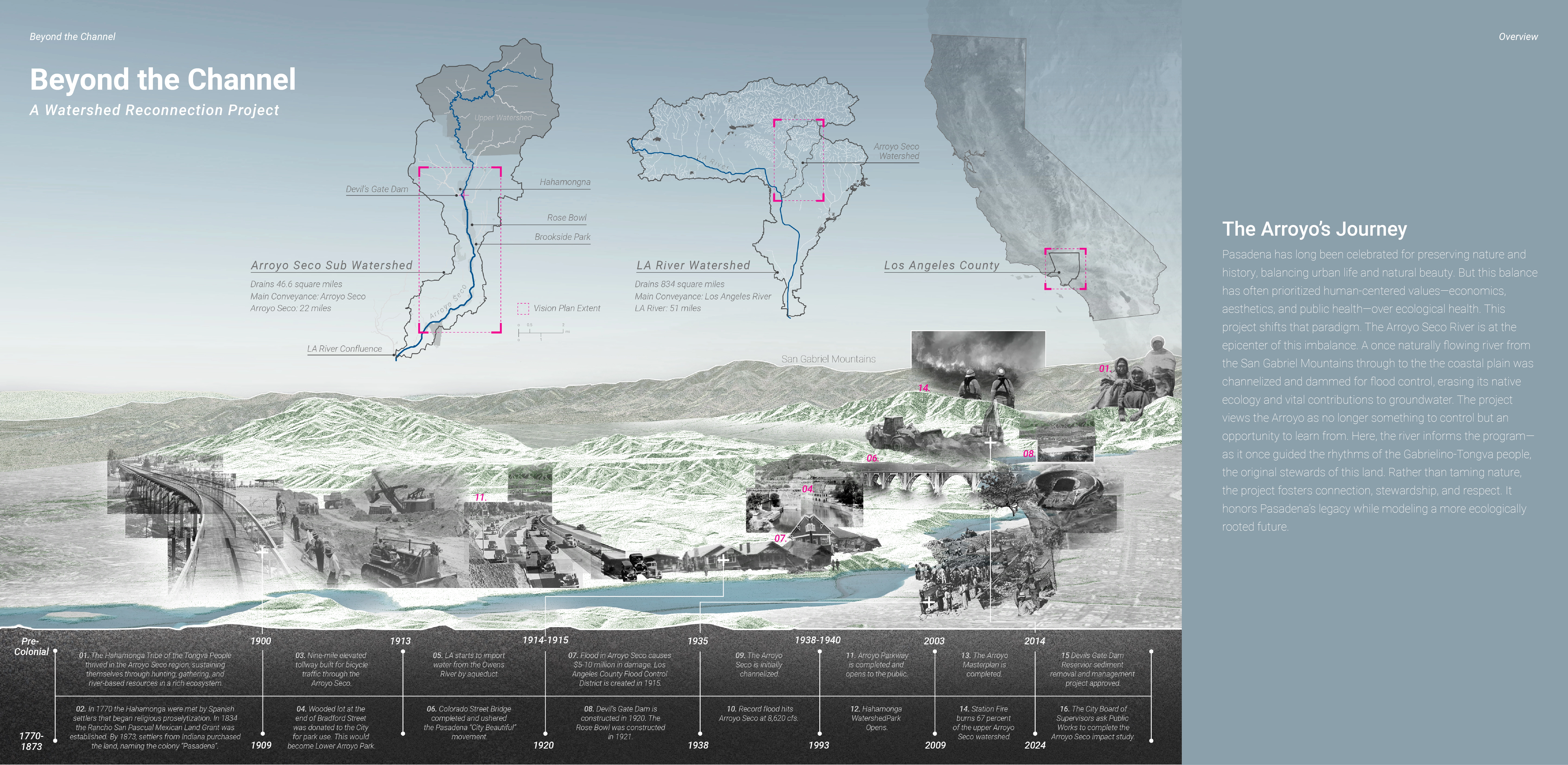 Pasadena is known for balancing urban life and natural beauty. But this balance has prioritized economics, aesthetics, and recreation over ecological and public health. The Arroyo Seco is at the epicenter of this imbalance. A once meandering river was channelized and dammed for flood control, erasing its native ecology and vital contributions to groundwater. The project no longer views the river as a control, but as an opportunity to learn from. In our vision, the river should inform the huma