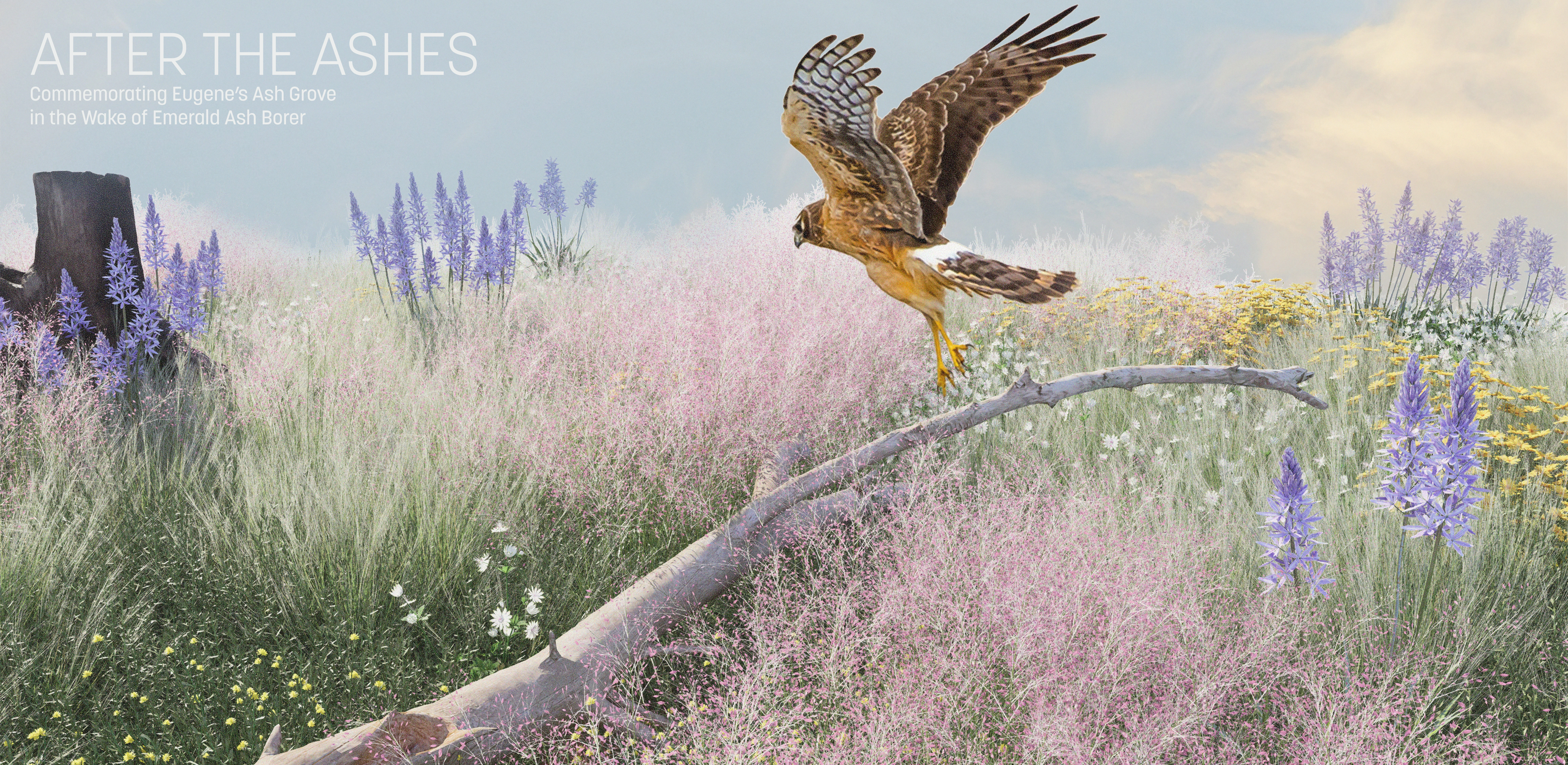 In the wake of destruction from the Emerald Ash Borer beetle, the transformation of Amazon Park's Ash Grove honors one of Eugene's most beloved wetland priority sites while restoring pre-colonial camas meadow conditions. Advocating for a mixed solution of ash tree treatment and wetland adaptation, After the Ashes provides an ecologically sensitive approach that balances visitor engagement with habitat needs. A curving boardwalk is interrupted by perforated panels that mimic
