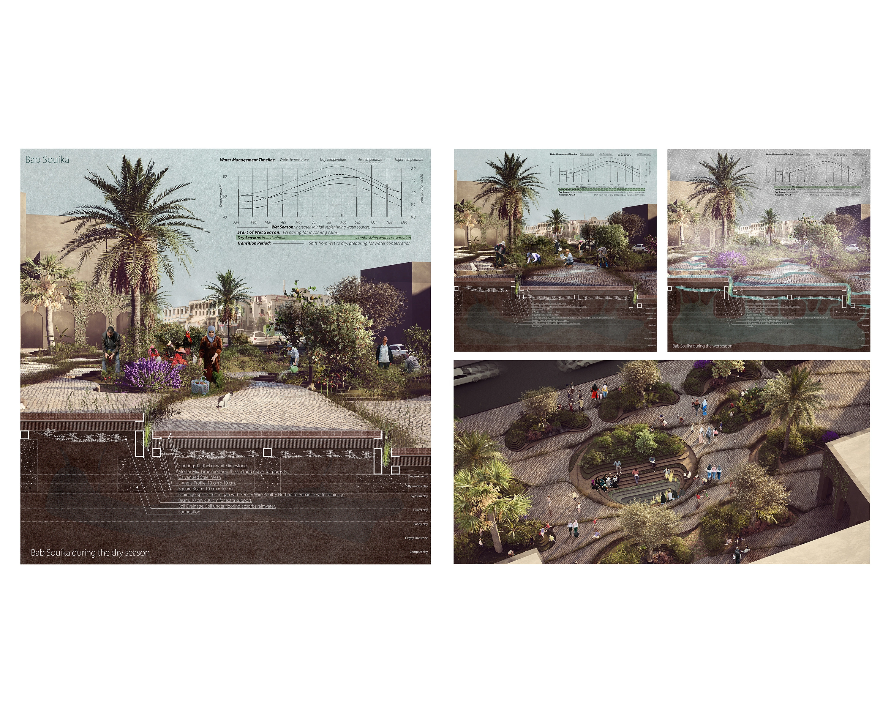This thesis proposes adapting traditional water management practices for the colonial city of Tunis to reduce flash flood impacts by 9%, while nurturing spaces for flood control, temperature regulation, and social interaction. Colonial and post-colonial development ignored water systems, and climate change has worsened the situation.The study developed a “shallow water dictionary” and documented multi-scalar traditional water management practices as a manual for future landscape architectural