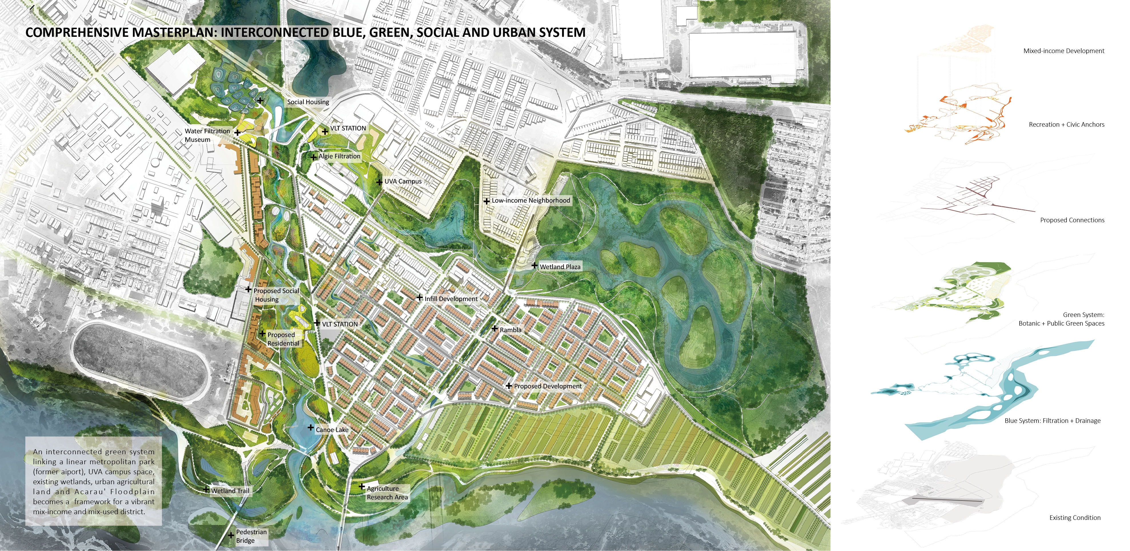 "Lugar de Encontro" or a Landscape of Encounters is a transformative landscape urbanism project in Sobral, Ceará that repurposes a former airport site (closed in 2017) that displaced the historic Pajeú Creek disrupting the Jaguaribe watershed. At the heart of our design lies a commitment to water filtration responding to the city's distraught relationship with sewage water treatment and urban flooding. By reclaiming the airport as an ecological armature, the project builds upon existing