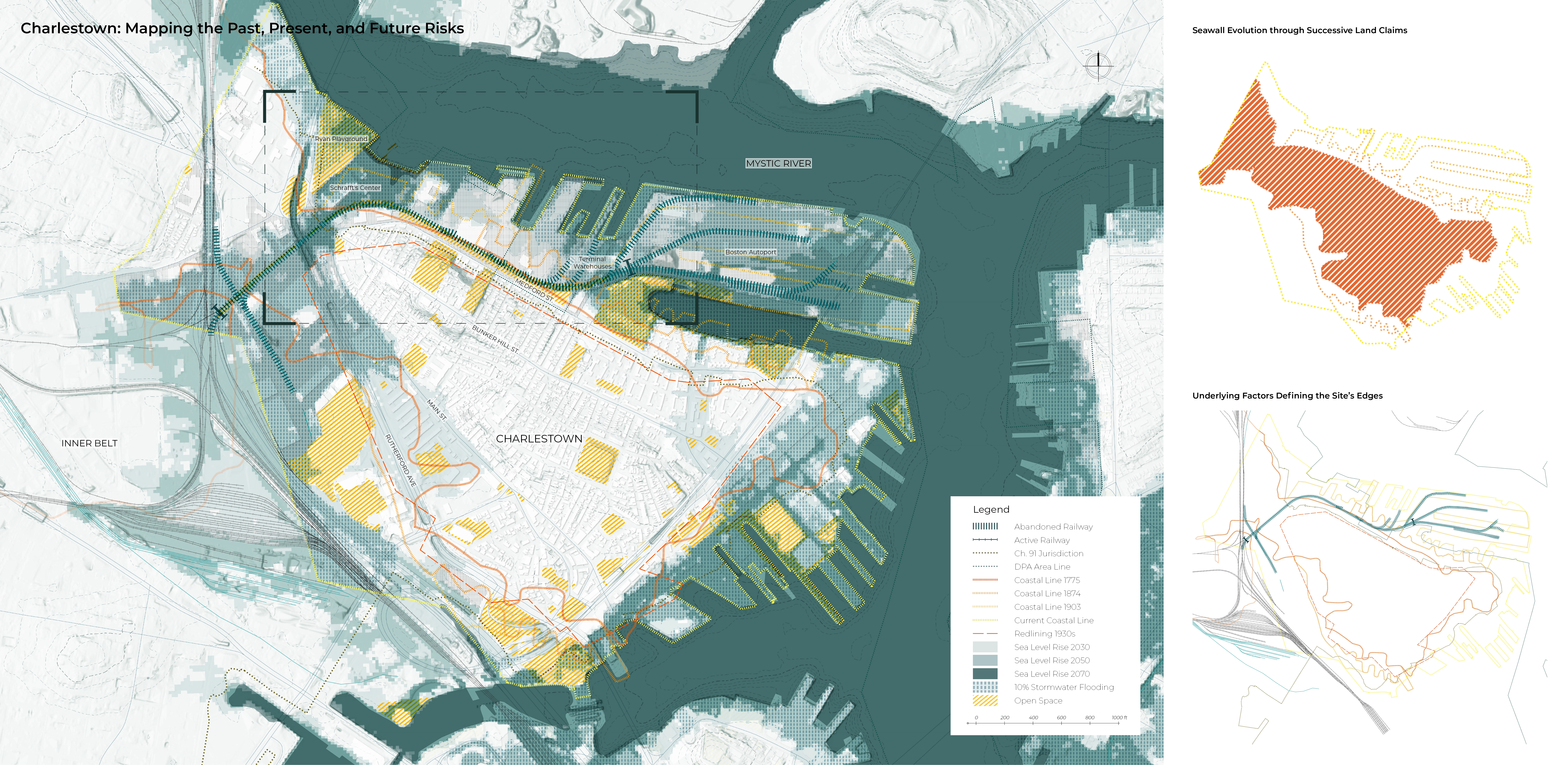 This project reimagines Charlestown’s waterfront as a dynamic archive—one that reveals layers of material history while adapting to future climate challenges. Historically, shifting seawalls and zoning lines fractured the relationship between the community and the water, producing two hardened edges: an abandoned rail corridor inland and a sealed waterfront. The design softens these boundaries through porosity, layering, and fragmentation, creating a new spatial framework across three zones:
