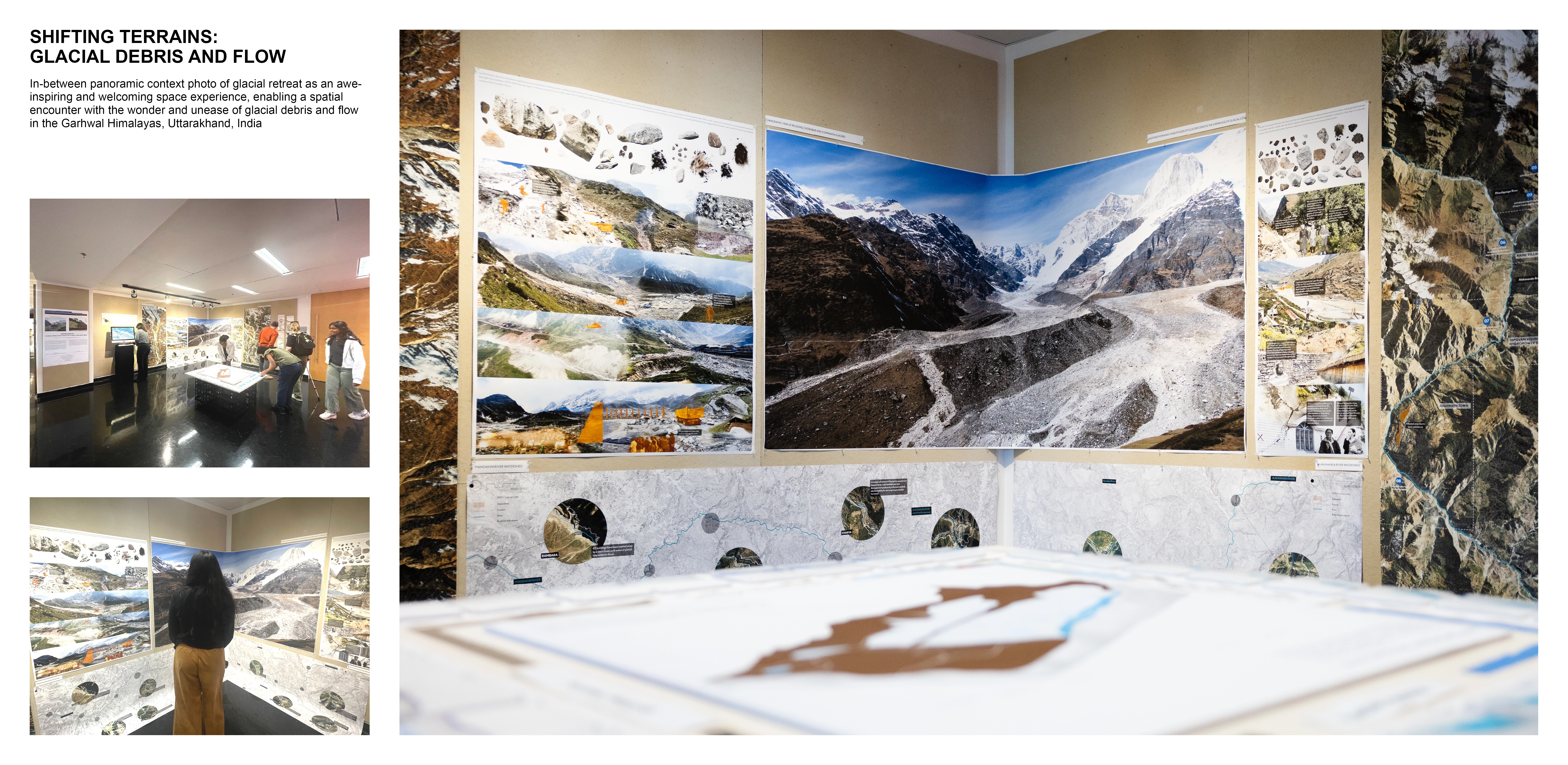 In the context of climate change, the rapid retreat of alpine glaciers is reshaping both upstream river infrastructure and socio-cultural values of mountain communities. The travel fellowship exhibition, led by a graduate landscape architecture student, investigates unstable glaciated landscapes in the Garhwal Himalayas, India, focusing on the 2013 and 2021 glacial lake outburst floods. By unpacking landscape change, it highlights the relationship between glacial geomorp