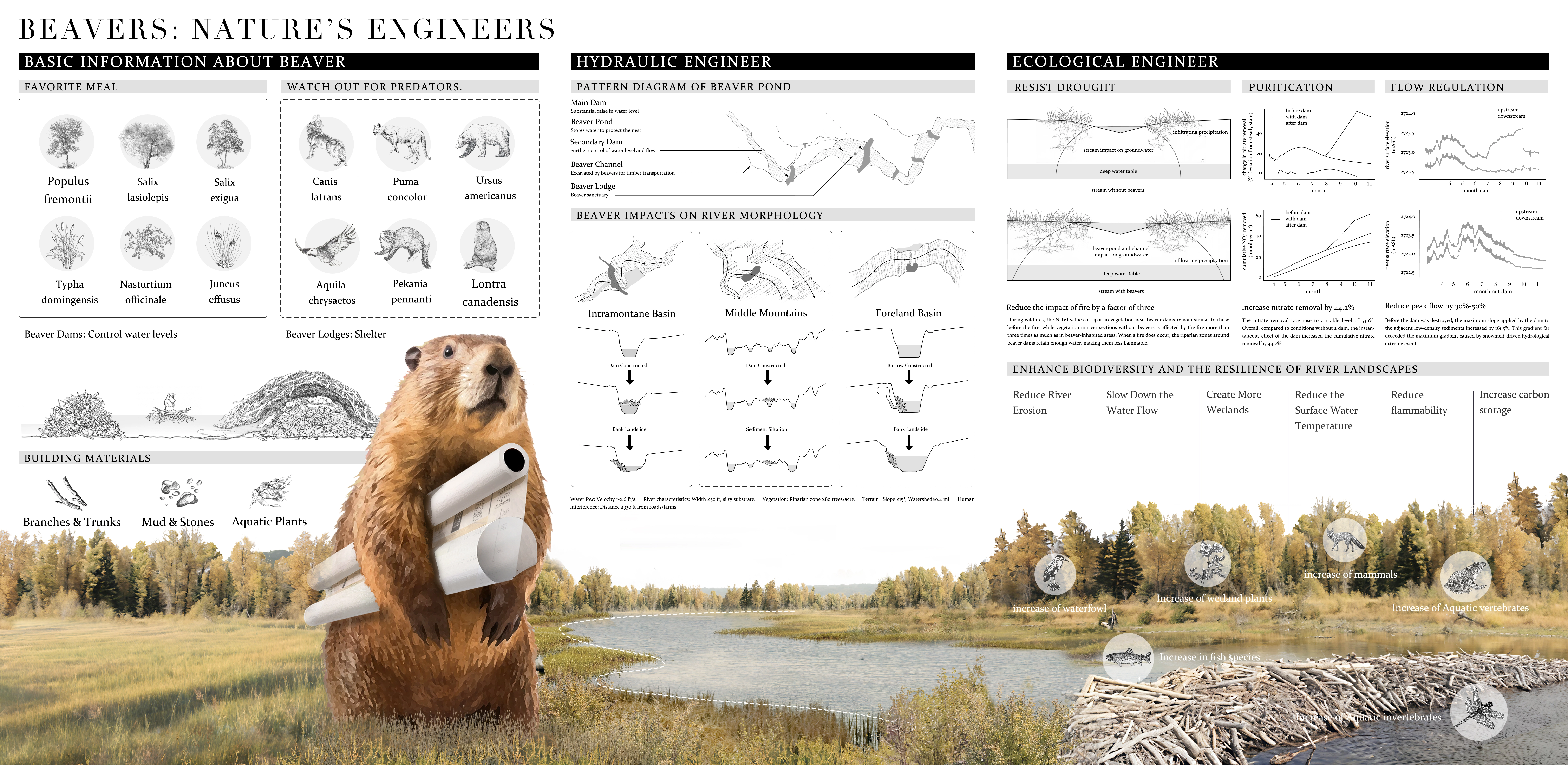 In response to groundwater loss and fragmented corridors in California’s Central Valley, our team supports the Department of Conservation’s rewetting strategy by partnering with native beavers to build a human–nature co-restoration system. Stage one prepares habitats with auxiliary dams and willow forests to help beavers settle in. Stage two relies on beavers to reshape the ecosystem and reconnect corridors. Stage three introduces low-impact pavilions, floating boardwalks, and nature-education homestays to support ecotourism. This pilot site offers a replicable model for broader application.