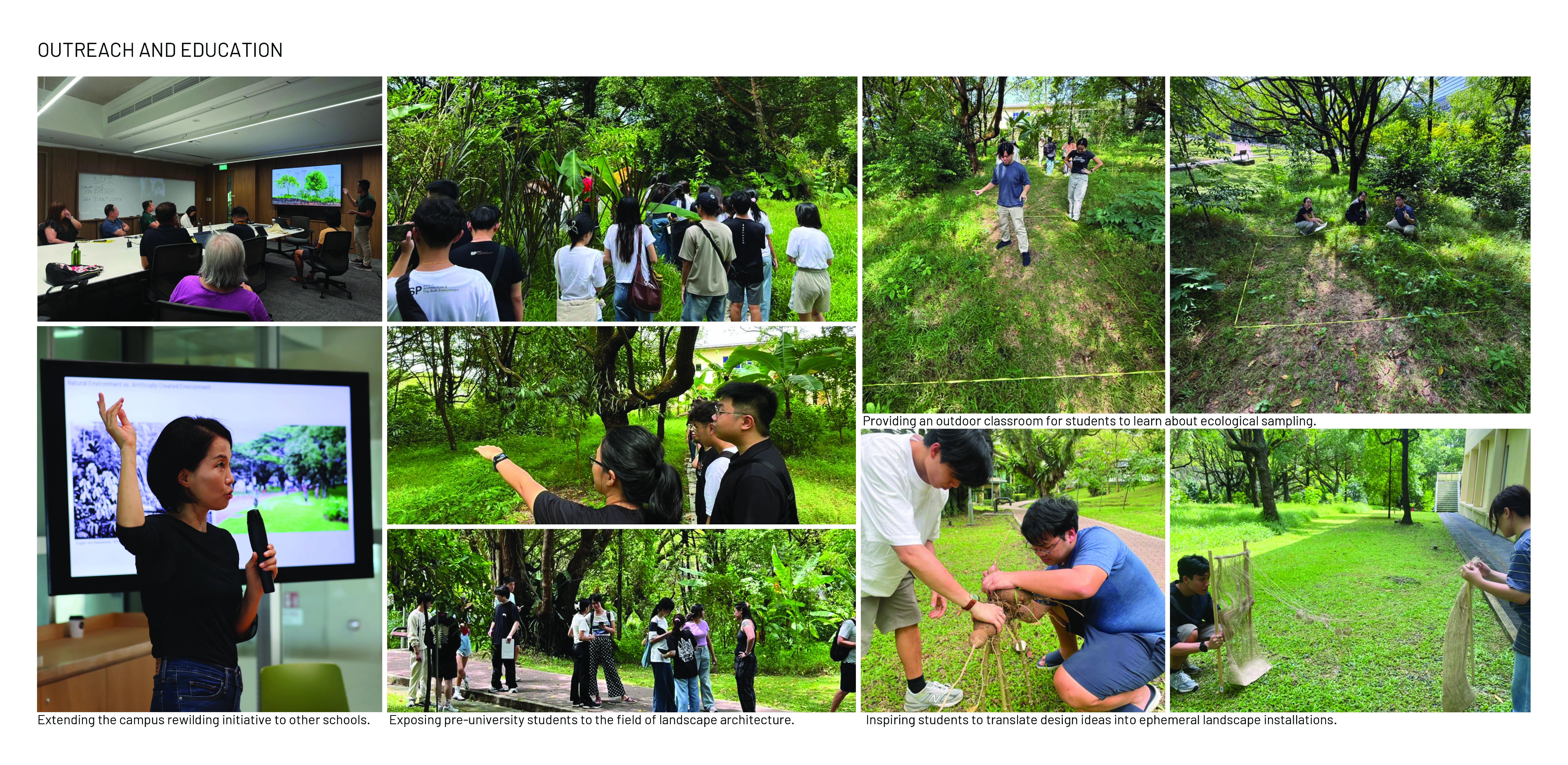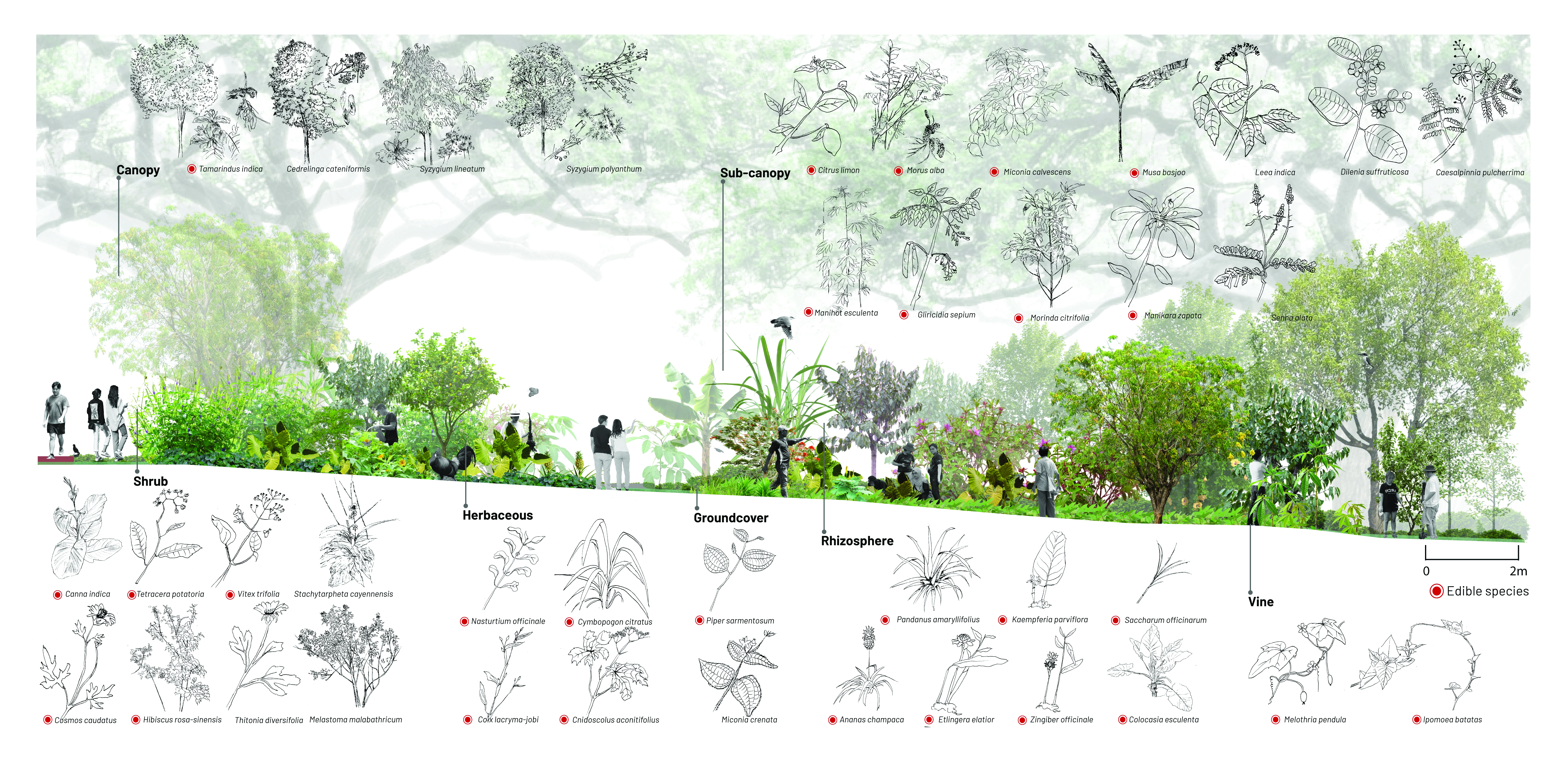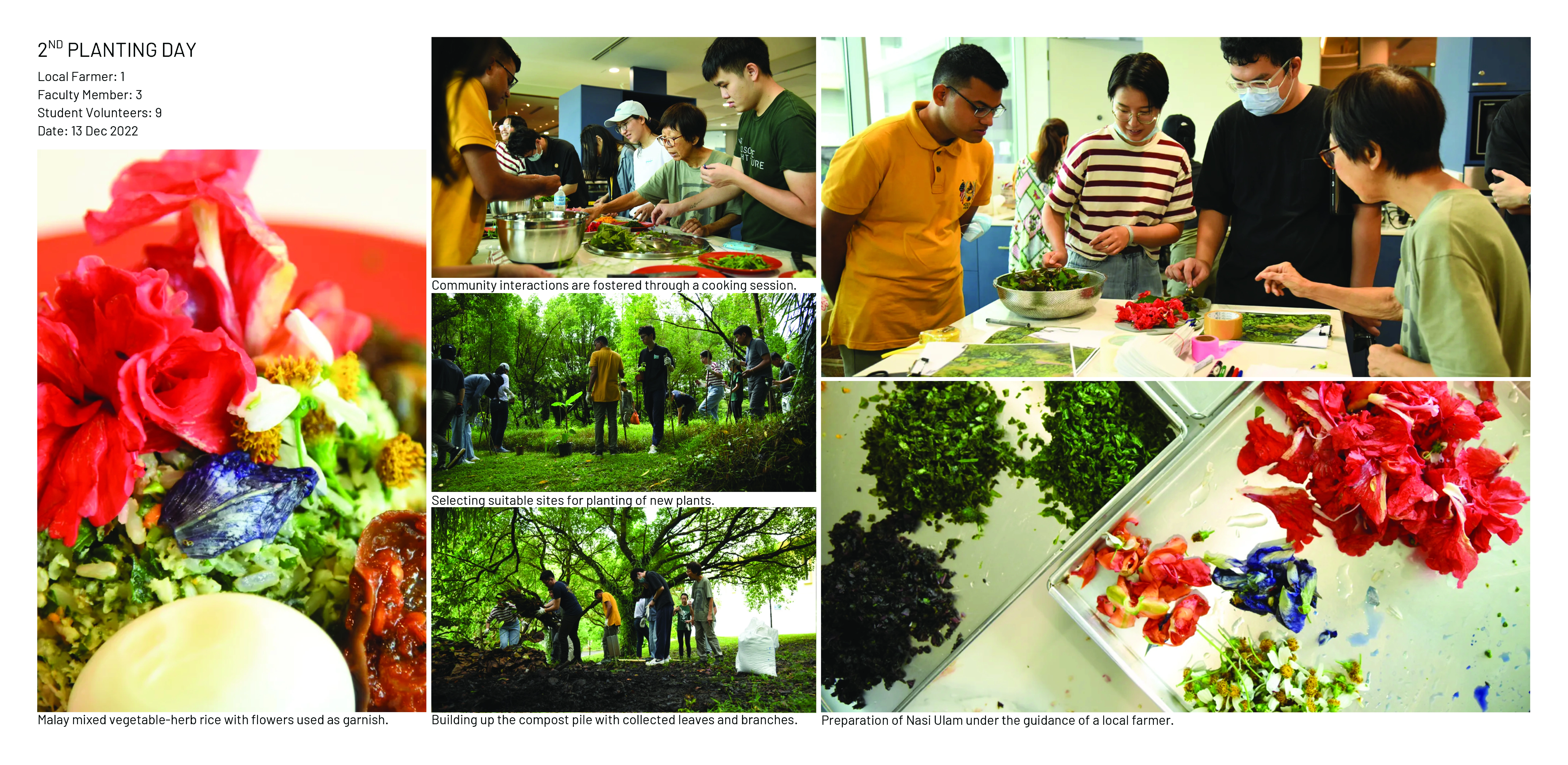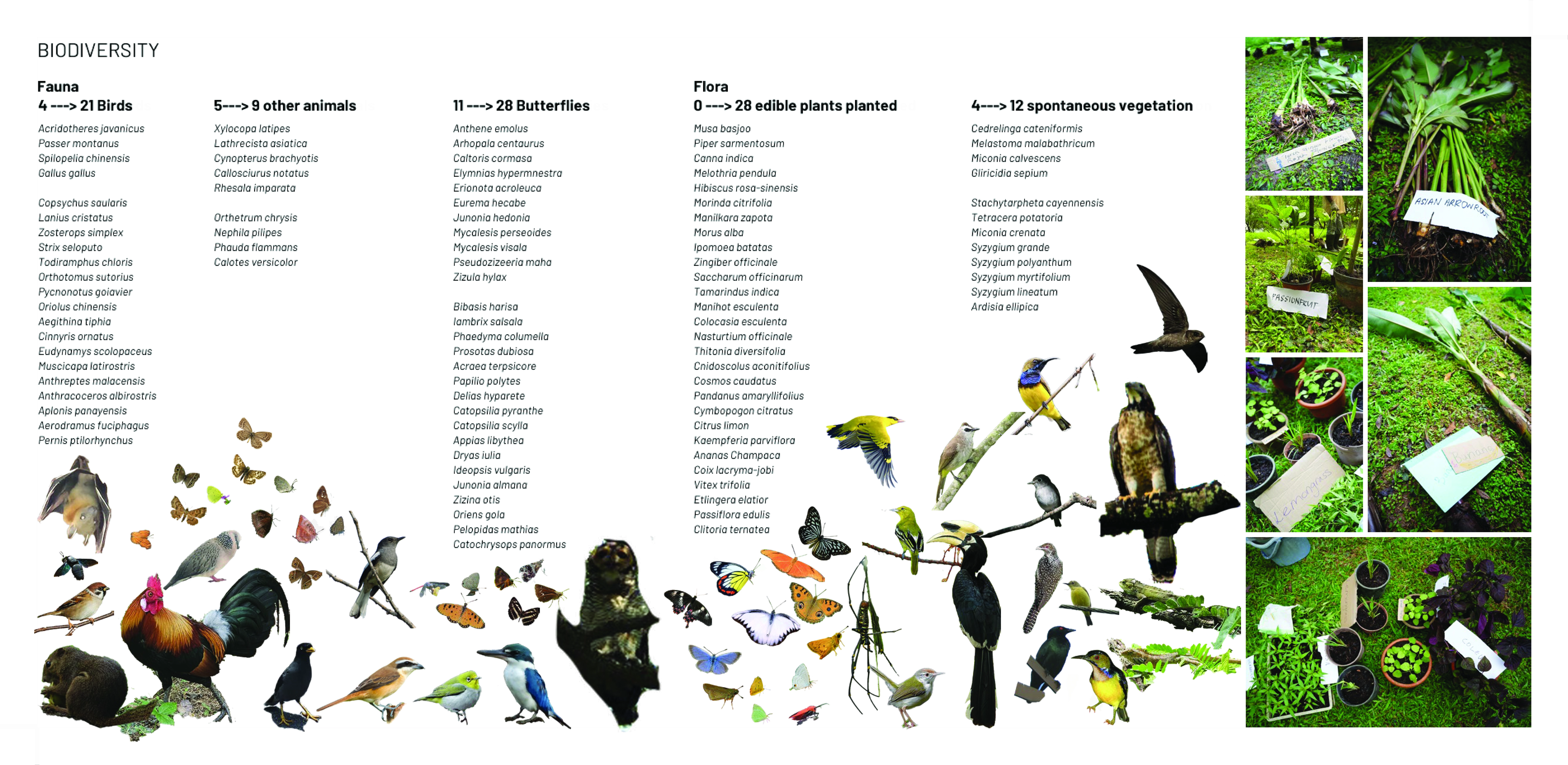 Nasi Ulam Forest Garden is an alternative green space in a university campus composed of edible and spontaneous plants that flourish together under selective maintenance. It features around 30 edible species that form the ingredients of Nasi Ulam (Malay mixed-salad rice), including fruit trees, vegetables, and herbs, layered with naturally grown tree saplings and wildflowers. Organic compost, edible plants, tree saplings, and vegetable seeds were transferred to the garden from one of the last surviving local permaculture farms running on an expiring land lease. It provides an opportunity for students to learn about multifunctional values of rewilding green spaces and local kampung perennials, while developing storytelling tools to build and sustain academic-community alliances. A student-led organization from the bachelor’s of landscape architecture programme known as the Landscape Architecture Collective (LAC), serves as the conduit that inherits from pioneering local farmers their knowledge on maintaining a forest garden, and disseminates this information to the school community through organising planting activities. This ensures that the sustainable ethos that balances agriculture with the preservation of the wild, continues to be practiced in the current generation. These planting activities have been held twice a semester since 2022, inviting volunteers to partake in a day of planting, where they are engaged in transplanting, weeding, composting and survey activities that contribute to the upkeep of the garden. In addition, herbs are occasionally harvested from the garden and used to make Nasi Ulam, allowing participants to understand the value of ‘farm-to-table’ tied to indigenous food culture. Halting regular grass-cutting in the originally manicured campus lawn allowed for the spontaneous growth of vegetation from seeds brought to site by wind and birds. The selective removal of invasive climbers and fast growing trees helped to maintain the diversity and health of slow-growing native flora. Planting of edible species in clusters of varying heights and forms under the preserved canopy, creates a multi-layered vegetation structure that harbours a range of wildlife. Planting of edible species in clusters of varying heights and forms under the preserved canopy, creates a multi-layered vegetation structure that harbours a range of wildlife. After 4 years, the garden hosts 28 planted edible and over 12 spontaneous flora species, many of which are native to the tropical rainforest.The garden has also become a habitat for 28 butterfly and 21 bird species, including hornbills that play a crucial role in seed dispersal for numerous native flora.This symbolic landscape evokes the character of the country’s early tropical rainforests, plantations and scrublands. At the same time, selective maintenance, following Nassauer’s Cue to Care concept, ensures public acceptance and safety. Paved paths made from recycled concrete, and neat edges provide pleasant walking experiences, balancing tamed and untamed elements, while facilitating ease of access to maintain the garden.The project's ecological aesthetics enhance public appreciation for dynamic vegetation growth. By involving diverse groups in monitoring biodiversity and participating in hands-on activities on a regular basis, the garden serves as a living laboratory offering educational opportunities that foster environmental stewardship and ecological knowledge.