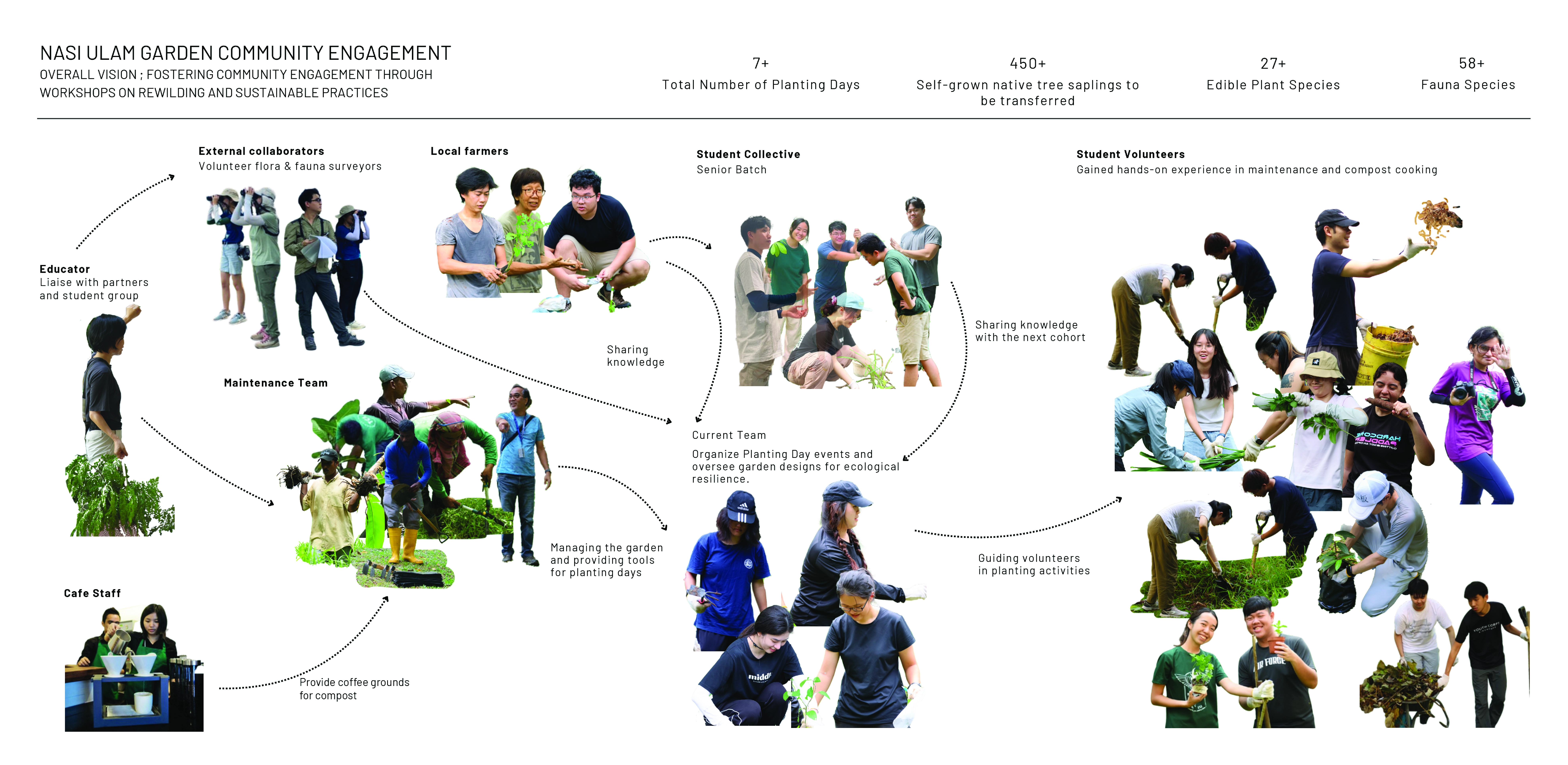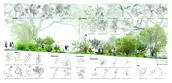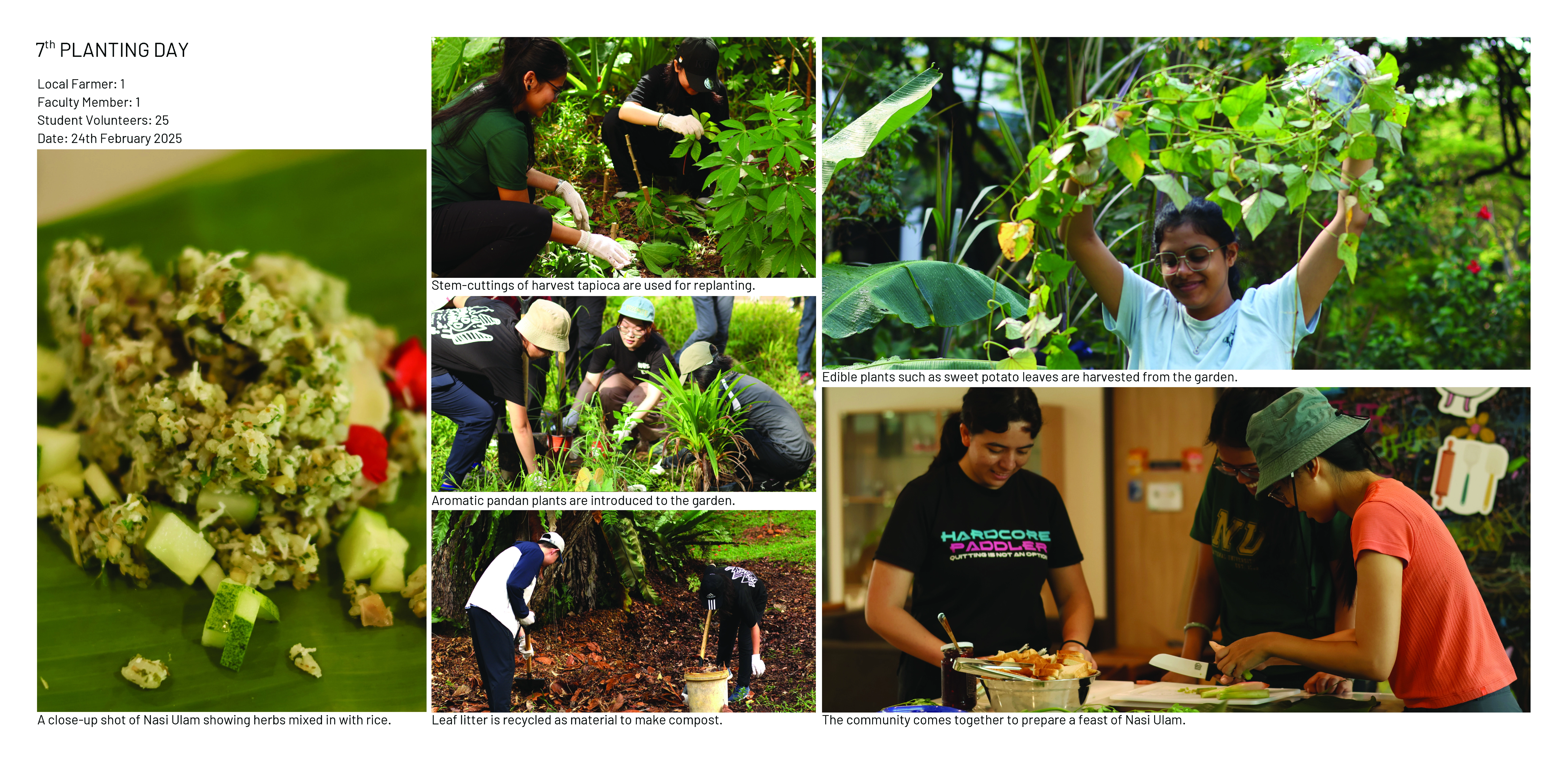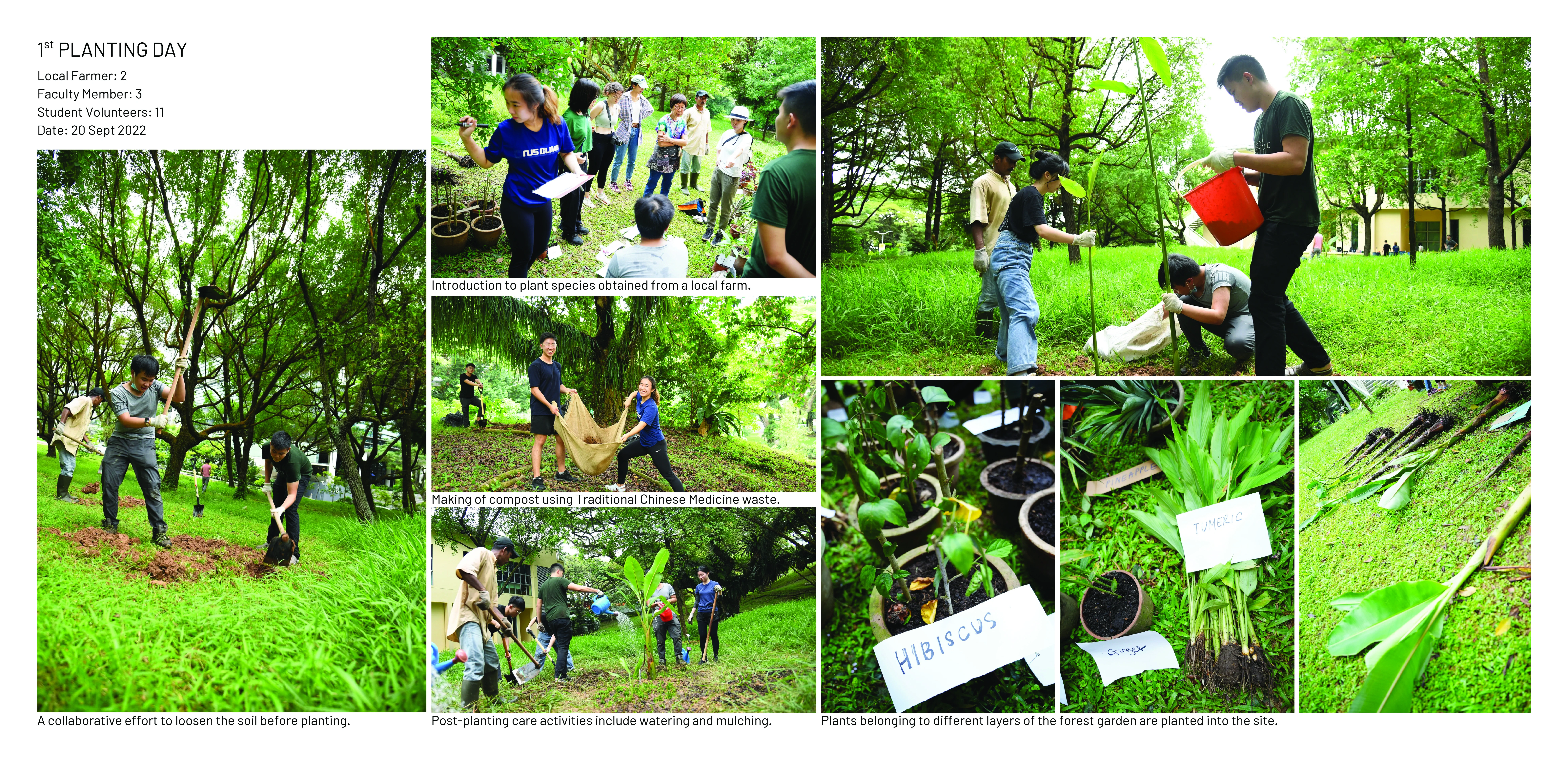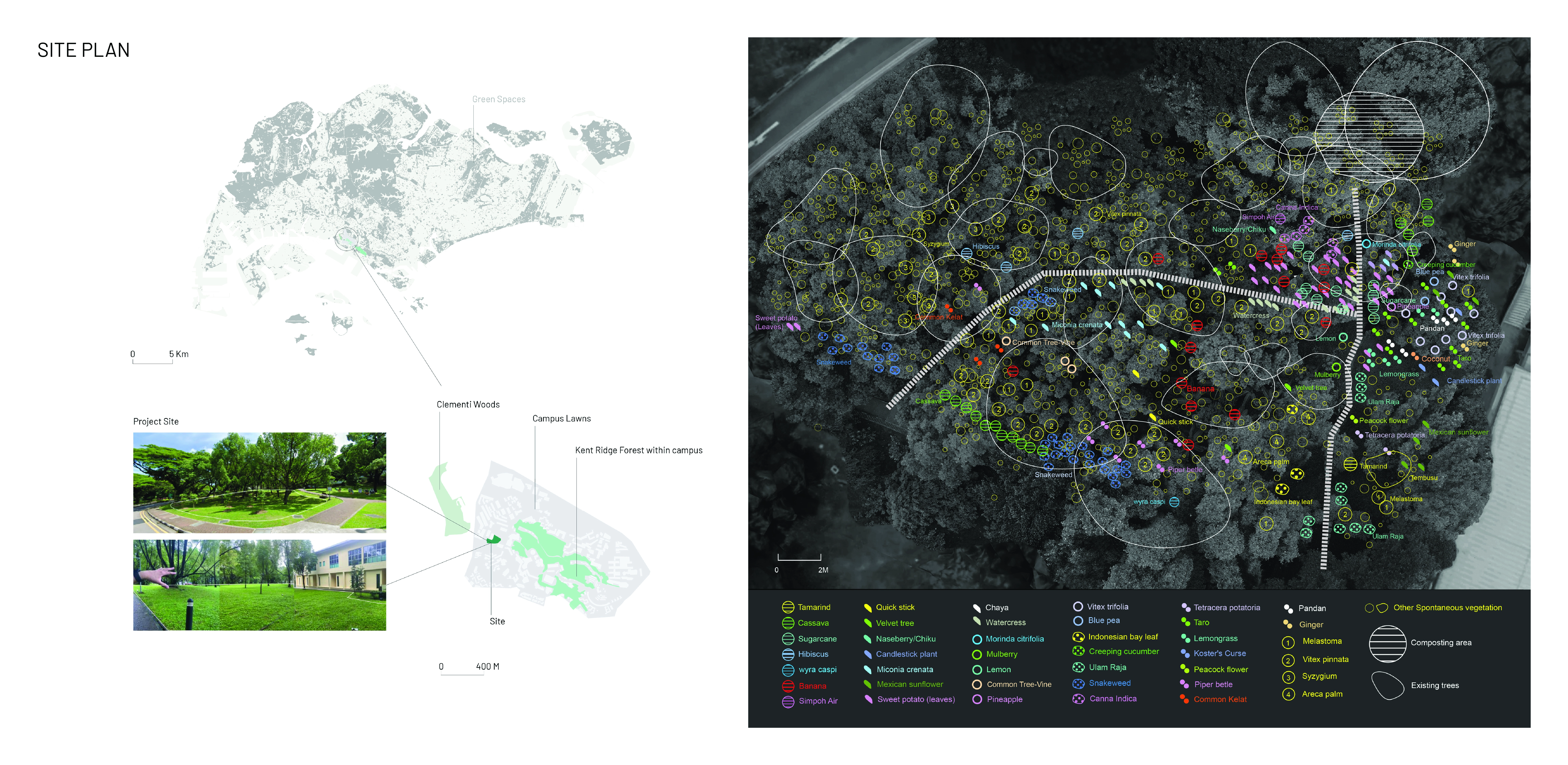 Nasi Ulam Forest Garden is an alternative green space in a university campus composed of edible and spontaneous plants that flourish together under selective maintenance. It features around 30 edible species that form the ingredients of Nasi Ulam (Malay mixed-salad rice), including fruit trees, vegetables, and herbs, layered with naturally grown tree saplings and wildflowers. Organic compost, edible plants, tree saplings, and vegetable seeds were transferred to the garden from one of the last surviving local permaculture farms running on an expiring land lease. It provides an opportunity for students to learn about multifunctional values of rewilding green spaces and local kampung perennials, while developing storytelling tools to build and sustain academic-community alliances. A student-led organization from the bachelor’s of landscape architecture programme known as the Landscape Architecture Collective (LAC), serves as the conduit that inherits from pioneering local farmers their knowledge on maintaining a forest garden, and disseminates this information to the school community through organising planting activities. This ensures that the sustainable ethos that balances agriculture with the preservation of the wild, continues to be practiced in the current generation. These planting activities have been held twice a semester since 2022, inviting volunteers to partake in a day of planting, where they are engaged in transplanting, weeding, composting and survey activities that contribute to the upkeep of the garden. In addition, herbs are occasionally harvested from the garden and used to make Nasi Ulam, allowing participants to understand the value of ‘farm-to-table’ tied to indigenous food culture. Halting regular grass-cutting in the originally manicured campus lawn allowed for the spontaneous growth of vegetation from seeds brought to site by wind and birds. The selective removal of invasive climbers and fast growing trees helped to maintain the diversity and health of slow-growing native flora. Planting of edible species in clusters of varying heights and forms under the preserved canopy, creates a multi-layered vegetation structure that harbours a range of wildlife. Planting of edible species in clusters of varying heights and forms under the preserved canopy, creates a multi-layered vegetation structure that harbours a range of wildlife. After 4 years, the garden hosts 28 planted edible and over 12 spontaneous flora species, many of which are native to the tropical rainforest.The garden has also become a habitat for 28 butterfly and 21 bird species, including hornbills that play a crucial role in seed dispersal for numerous native flora.This symbolic landscape evokes the character of the country’s early tropical rainforests, plantations and scrublands. At the same time, selective maintenance, following Nassauer’s Cue to Care concept, ensures public acceptance and safety. Paved paths made from recycled concrete, and neat edges provide pleasant walking experiences, balancing tamed and untamed elements, while facilitating ease of access to maintain the garden.The project's ecological aesthetics enhance public appreciation for dynamic vegetation growth. By involving diverse groups in monitoring biodiversity and participating in hands-on activities on a regular basis, the garden serves as a living laboratory offering educational opportunities that foster environmental stewardship and ecological knowledge.