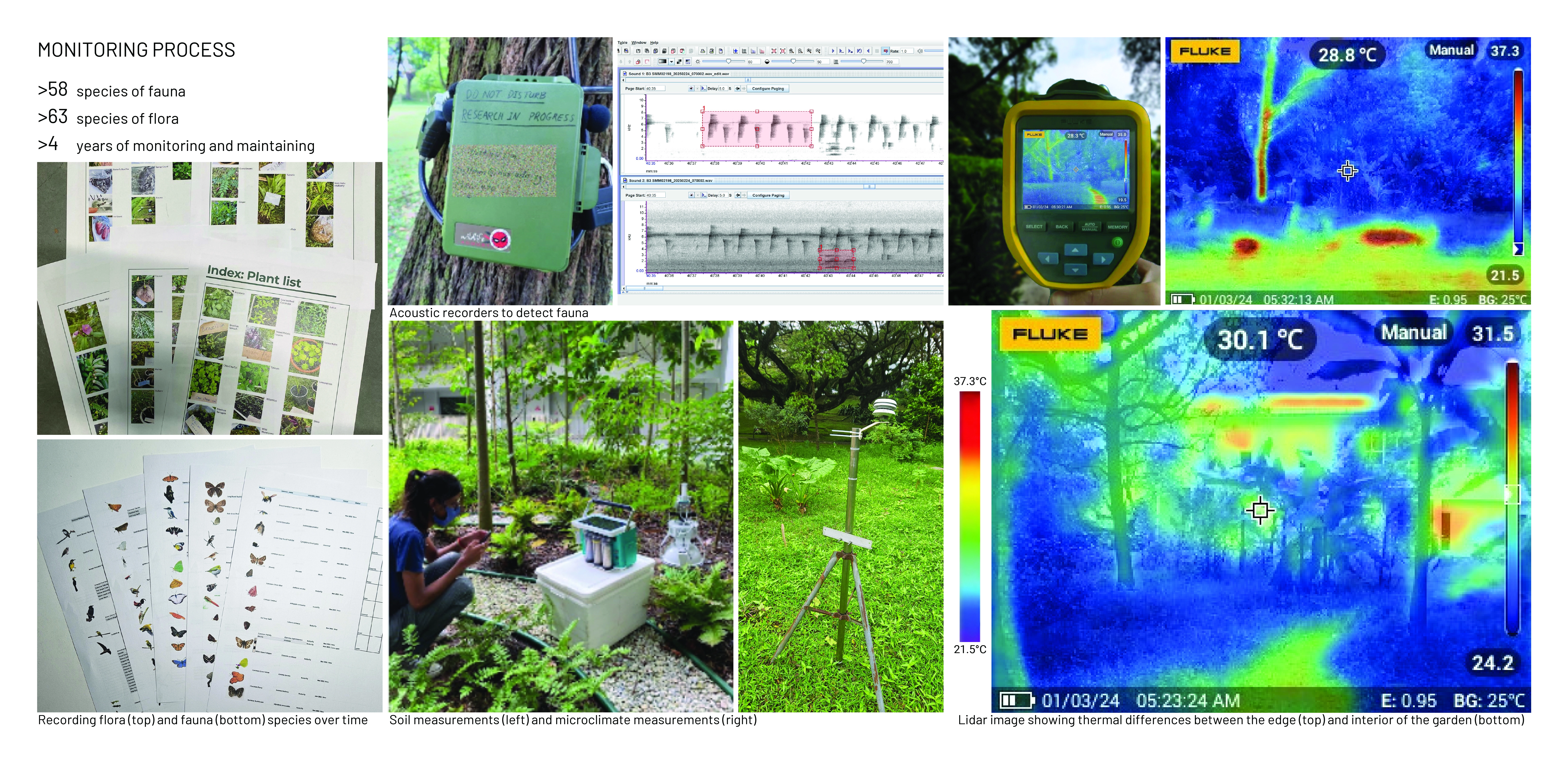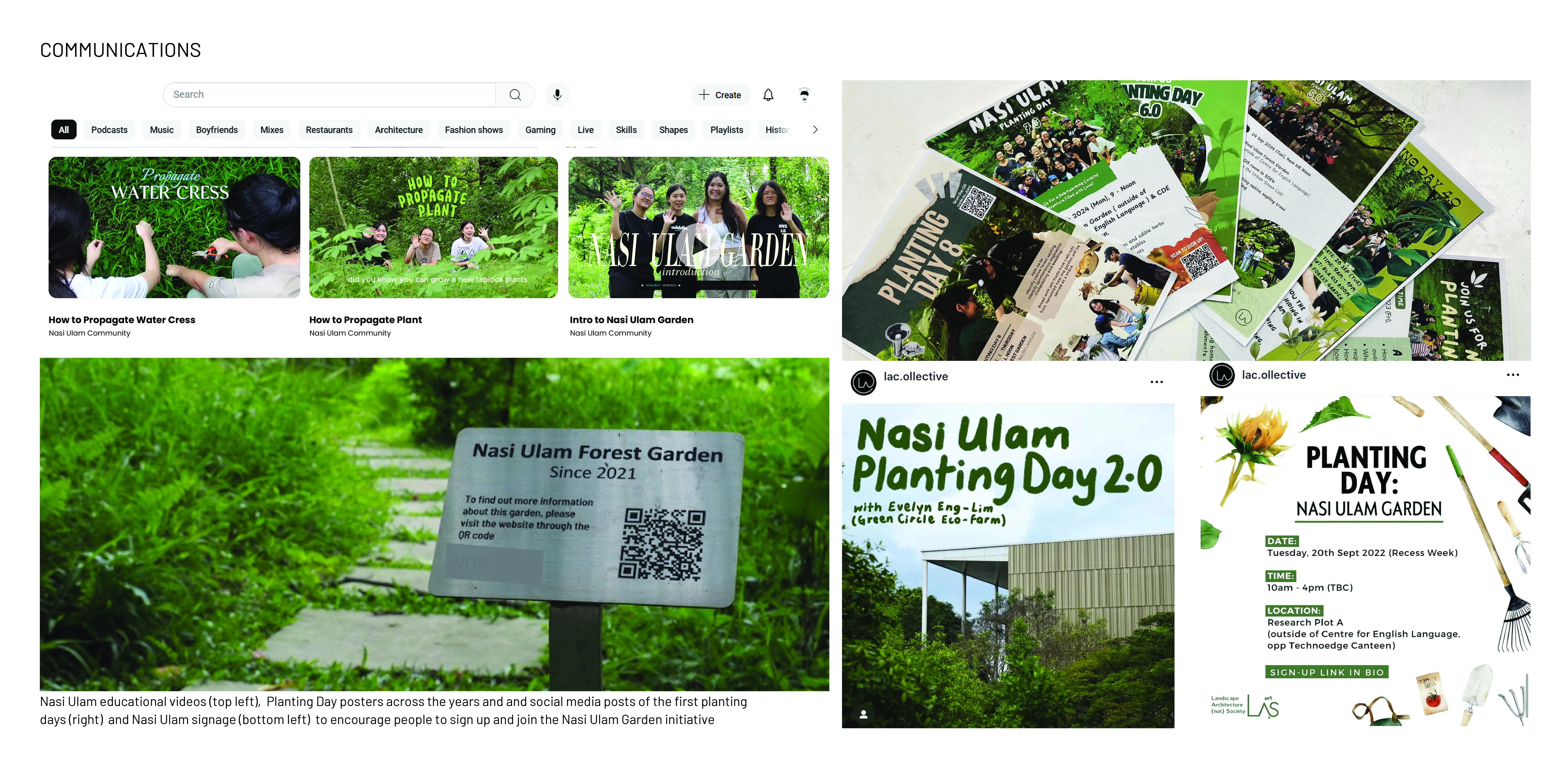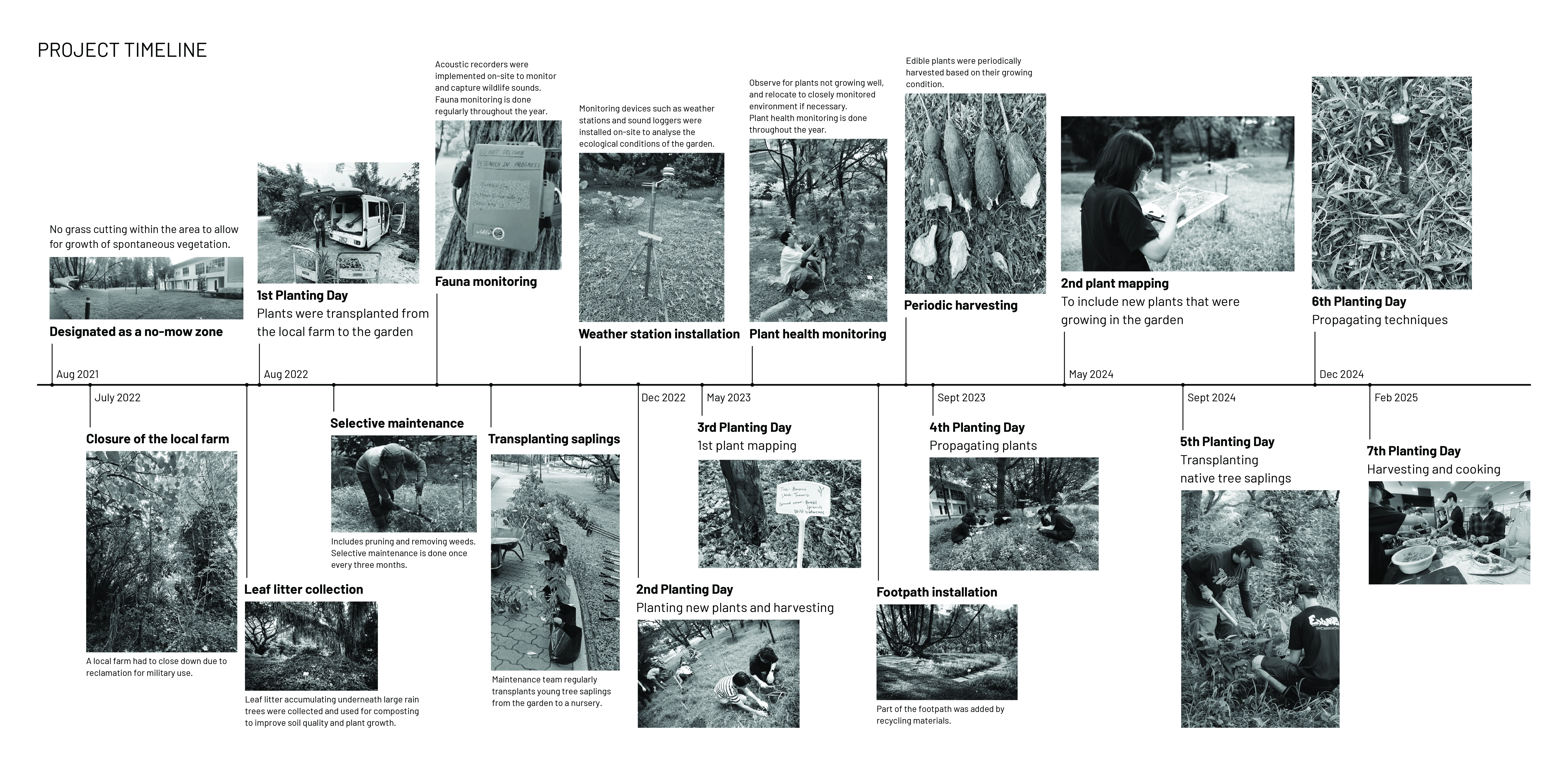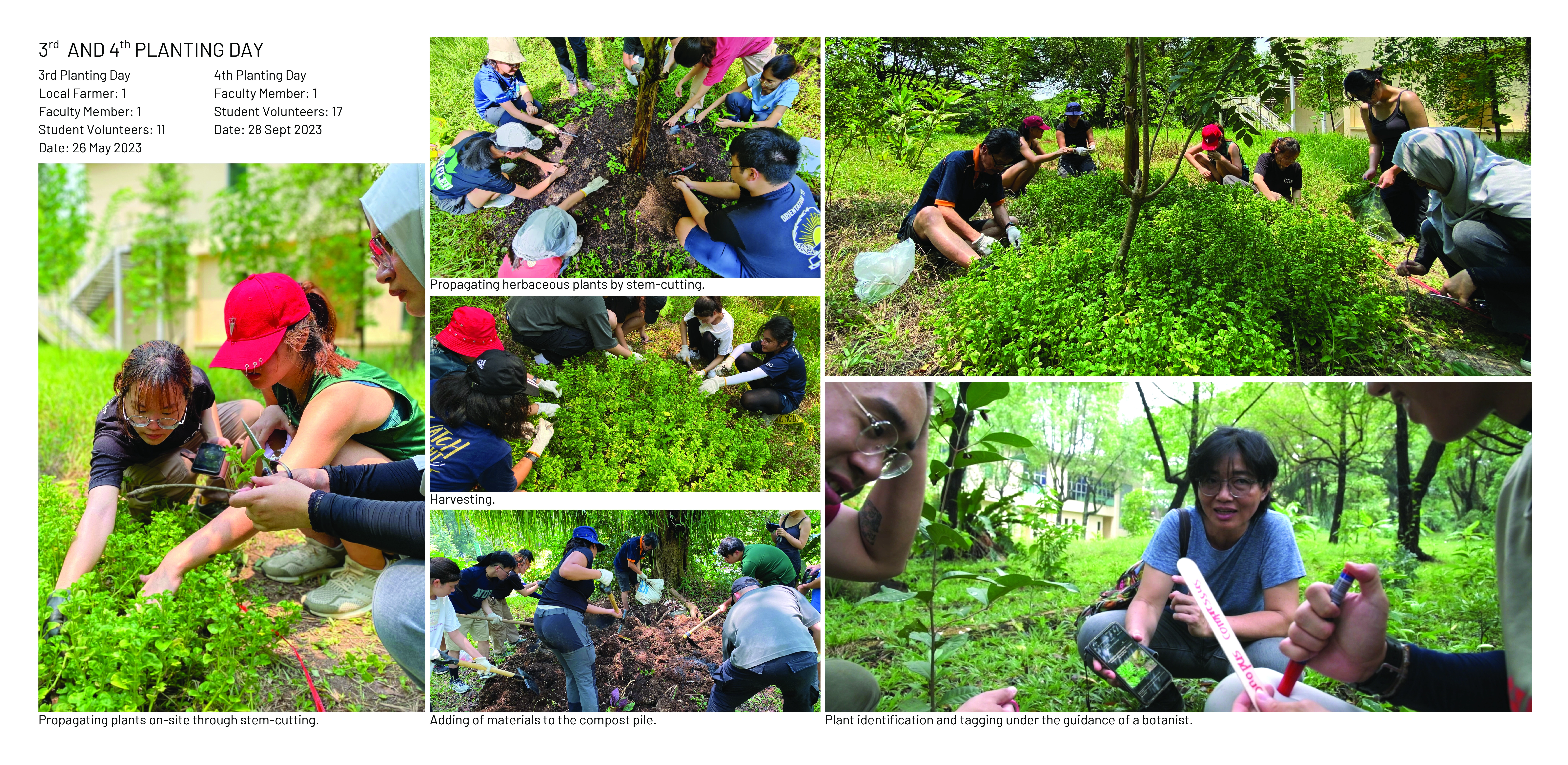 Nasi Ulam Forest Garden is an alternative green space in a university campus composed of edible and spontaneous plants that flourish together under selective maintenance. It features around 30 edible species that form the ingredients of Nasi Ulam (Malay mixed-salad rice), including fruit trees, vegetables, and herbs, layered with naturally grown tree saplings and wildflowers. Organic compost, edible plants, tree saplings, and vegetable seeds were transferred to the garden from one of the last surviving local permaculture farms running on an expiring land lease. It provides an opportunity for students to learn about multifunctional values of rewilding green spaces and local kampung perennials, while developing storytelling tools to build and sustain academic-community alliances. A student-led organization from the bachelor’s of landscape architecture programme known as the Landscape Architecture Collective (LAC), serves as the conduit that inherits from pioneering local farmers their knowledge on maintaining a forest garden, and disseminates this information to the school community through organising planting activities. This ensures that the sustainable ethos that balances agriculture with the preservation of the wild, continues to be practiced in the current generation. These planting activities have been held twice a semester since 2022, inviting volunteers to partake in a day of planting, where they are engaged in transplanting, weeding, composting and survey activities that contribute to the upkeep of the garden. In addition, herbs are occasionally harvested from the garden and used to make Nasi Ulam, allowing participants to understand the value of ‘farm-to-table’ tied to indigenous food culture. Halting regular grass-cutting in the originally manicured campus lawn allowed for the spontaneous growth of vegetation from seeds brought to site by wind and birds. The selective removal of invasive climbers and fast growing trees helped to maintain the diversity and health of slow-growing native flora. Planting of edible species in clusters of varying heights and forms under the preserved canopy, creates a multi-layered vegetation structure that harbours a range of wildlife. Planting of edible species in clusters of varying heights and forms under the preserved canopy, creates a multi-layered vegetation structure that harbours a range of wildlife. After 4 years, the garden hosts 28 planted edible and over 12 spontaneous flora species, many of which are native to the tropical rainforest.The garden has also become a habitat for 28 butterfly and 21 bird species, including hornbills that play a crucial role in seed dispersal for numerous native flora.This symbolic landscape evokes the character of the country’s early tropical rainforests, plantations and scrublands. At the same time, selective maintenance, following Nassauer’s Cue to Care concept, ensures public acceptance and safety. Paved paths made from recycled concrete, and neat edges provide pleasant walking experiences, balancing tamed and untamed elements, while facilitating ease of access to maintain the garden.The project's ecological aesthetics enhance public appreciation for dynamic vegetation growth. By involving diverse groups in monitoring biodiversity and participating in hands-on activities on a regular basis, the garden serves as a living laboratory offering educational opportunities that foster environmental stewardship and ecological knowledge.