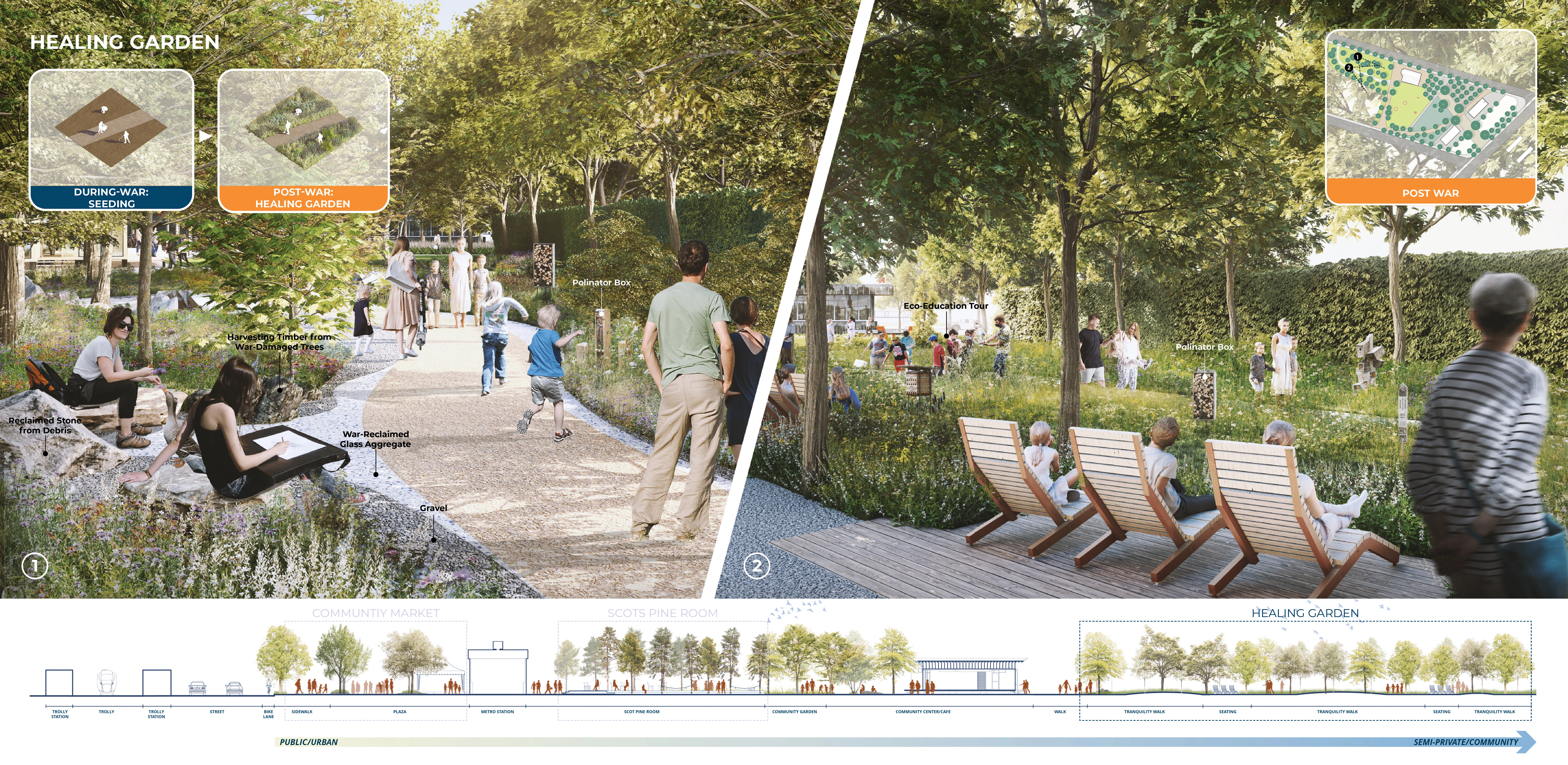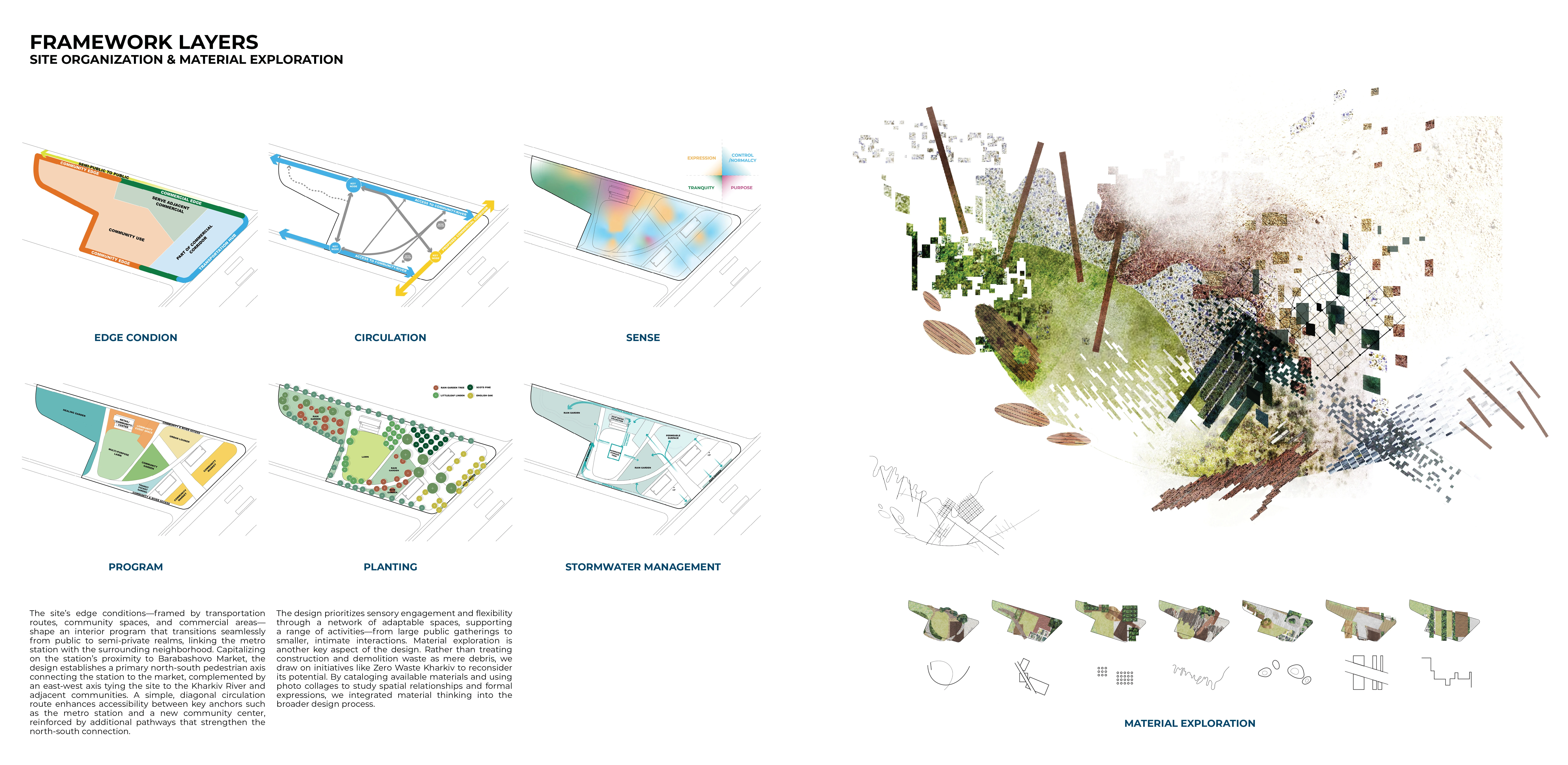 A clear circulation framework then organizes the site, linking public, semi-private, and private spaces. A north-south pedestrian axis connects the metro station to Barabashovo Market, while an east-west route links to the Kharkiv River—embedding the project into broader urban and ecological systems. Flexible spaces support a range of uses, from aid distribution to public celebrations. Features like a community lawn that doubles as a helicopter landing zone and a multipurpose center ensure long-term preparedness. A local seed bank, integrated into the community garden, supports both ecological restoration and food security.