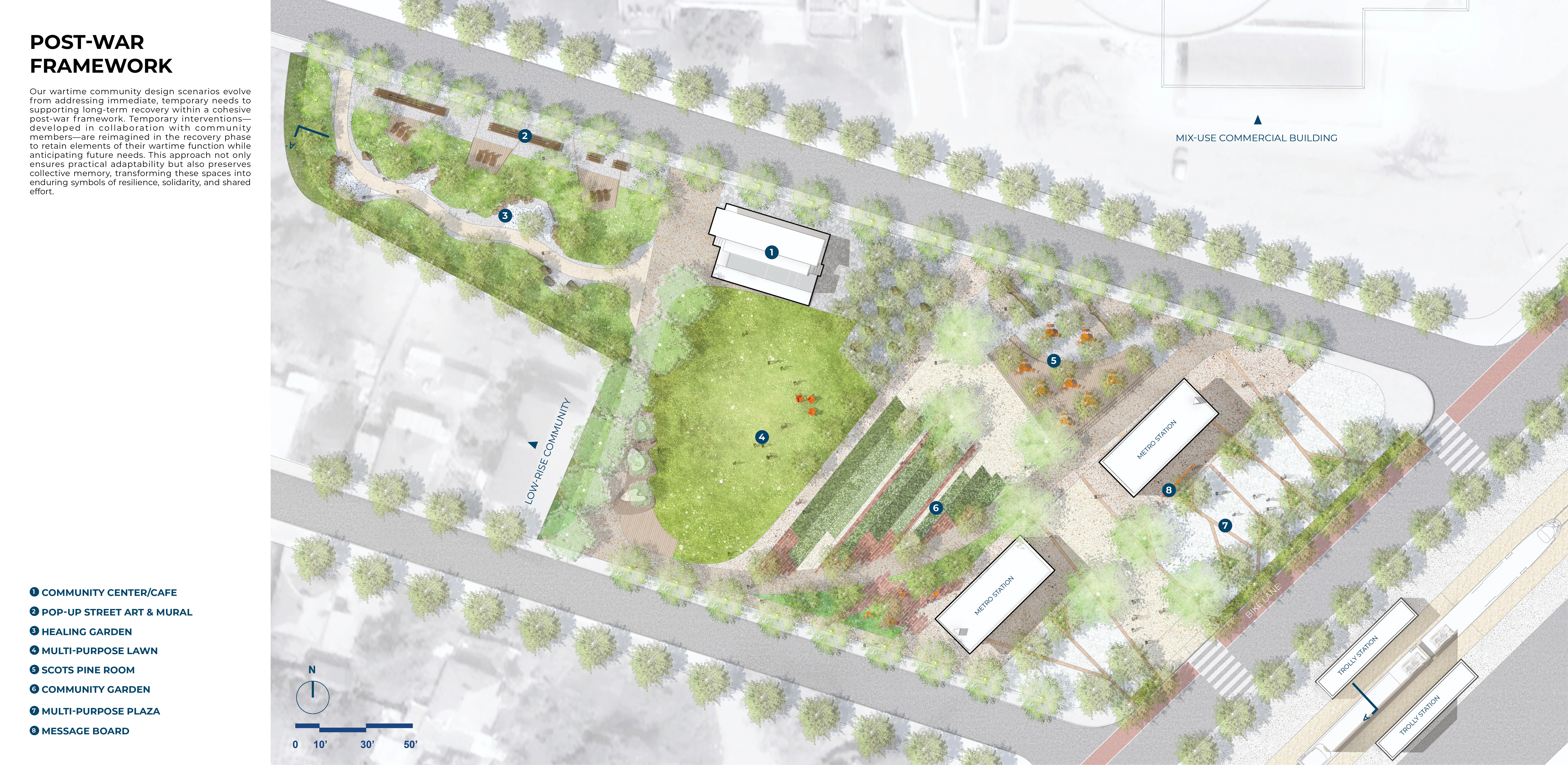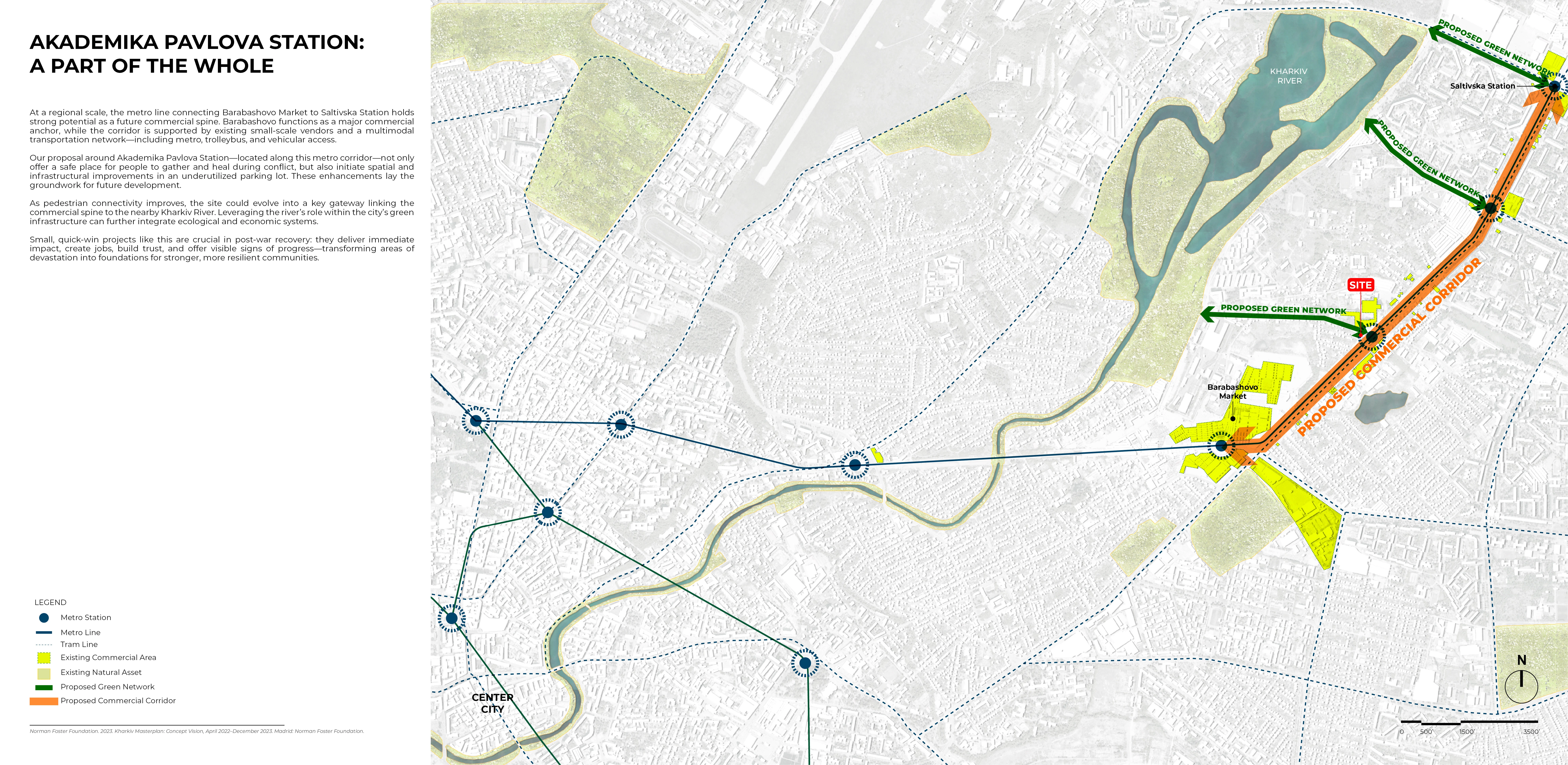 The vacant land around Akademika Pavlova Station—serving as both shelter and transit hub—can be reimagined as a flexible public space that addresses immediate needs while laying the groundwork for long-term recovery. It transforms war-induced devastation into an opportunity for more resilient community. At the regional scale, its position along a potential commercial spine and near the Kharkiv River allows it to link economic and ecological systems. Quick-win projects like this can catalyze broader development, delivering visible impact, creating jobs, and rebuilding trust over time.