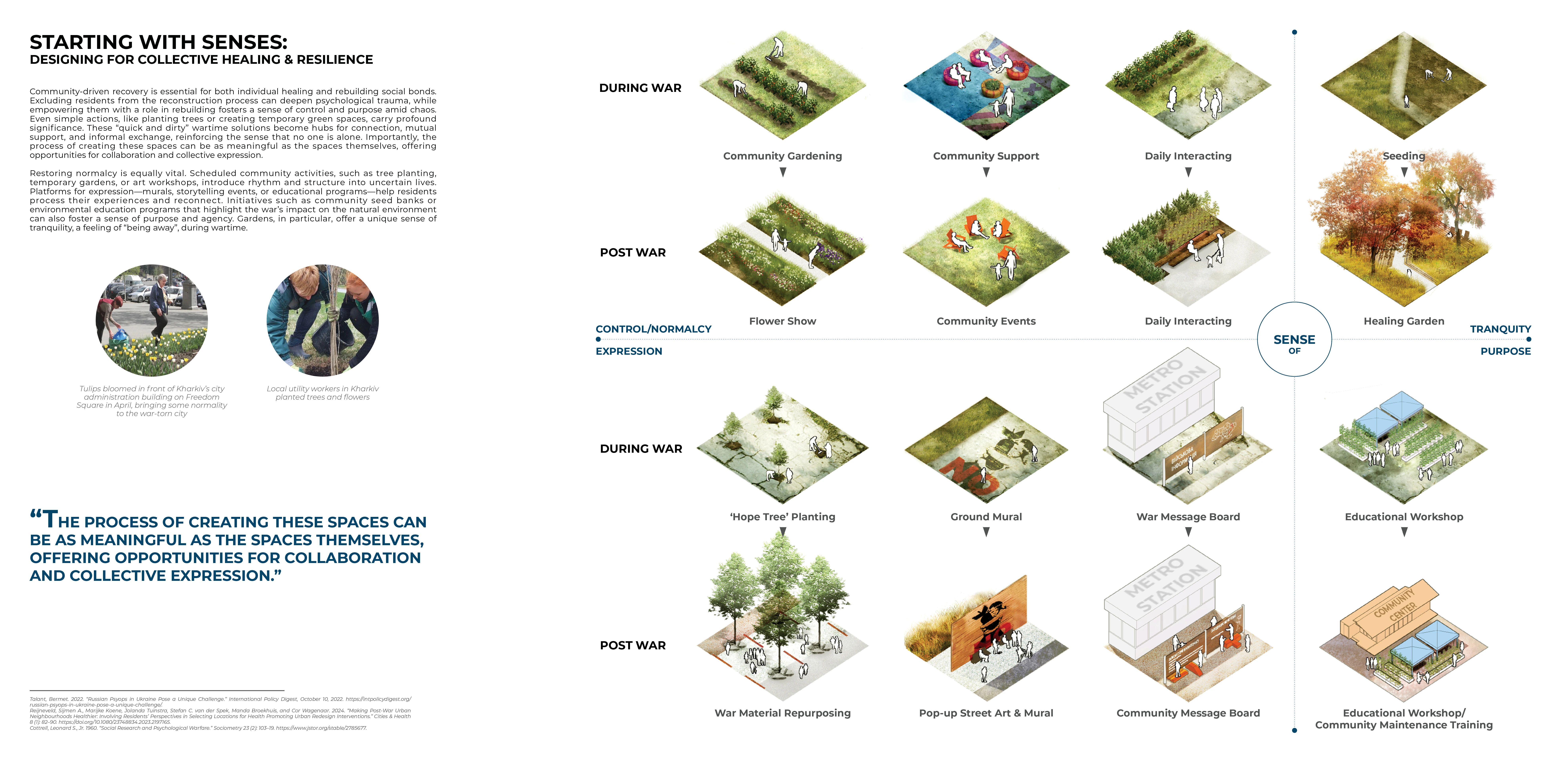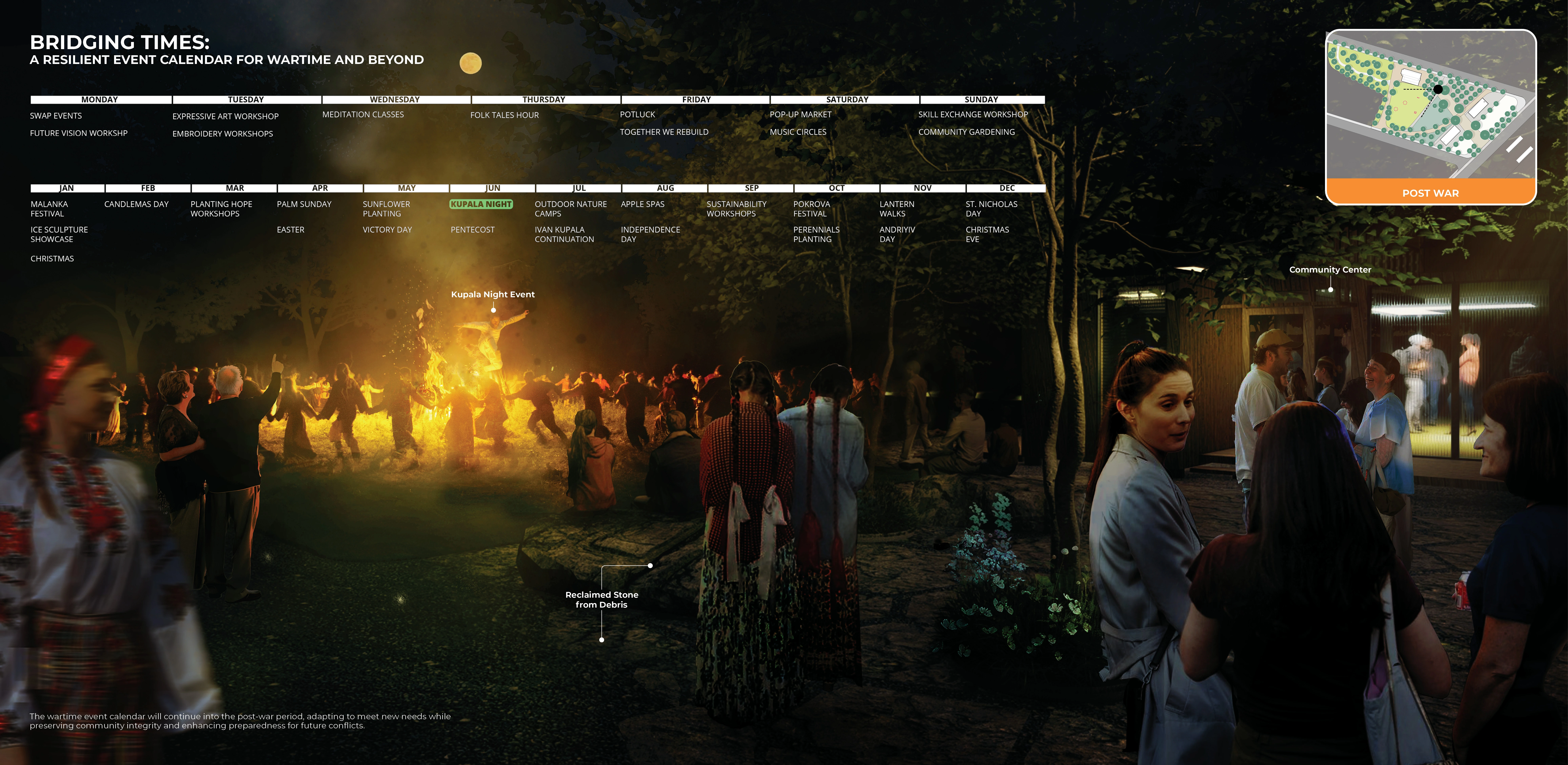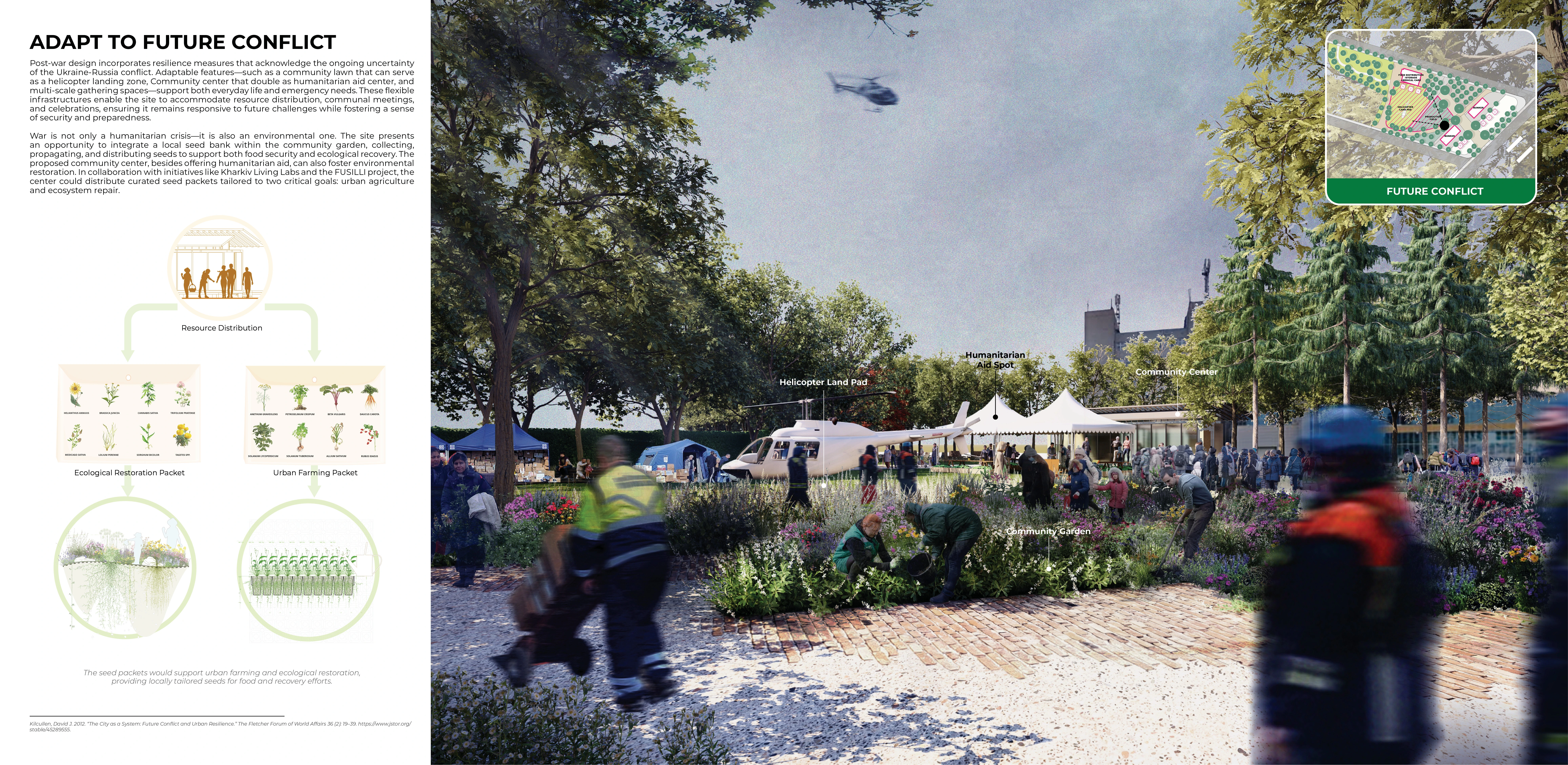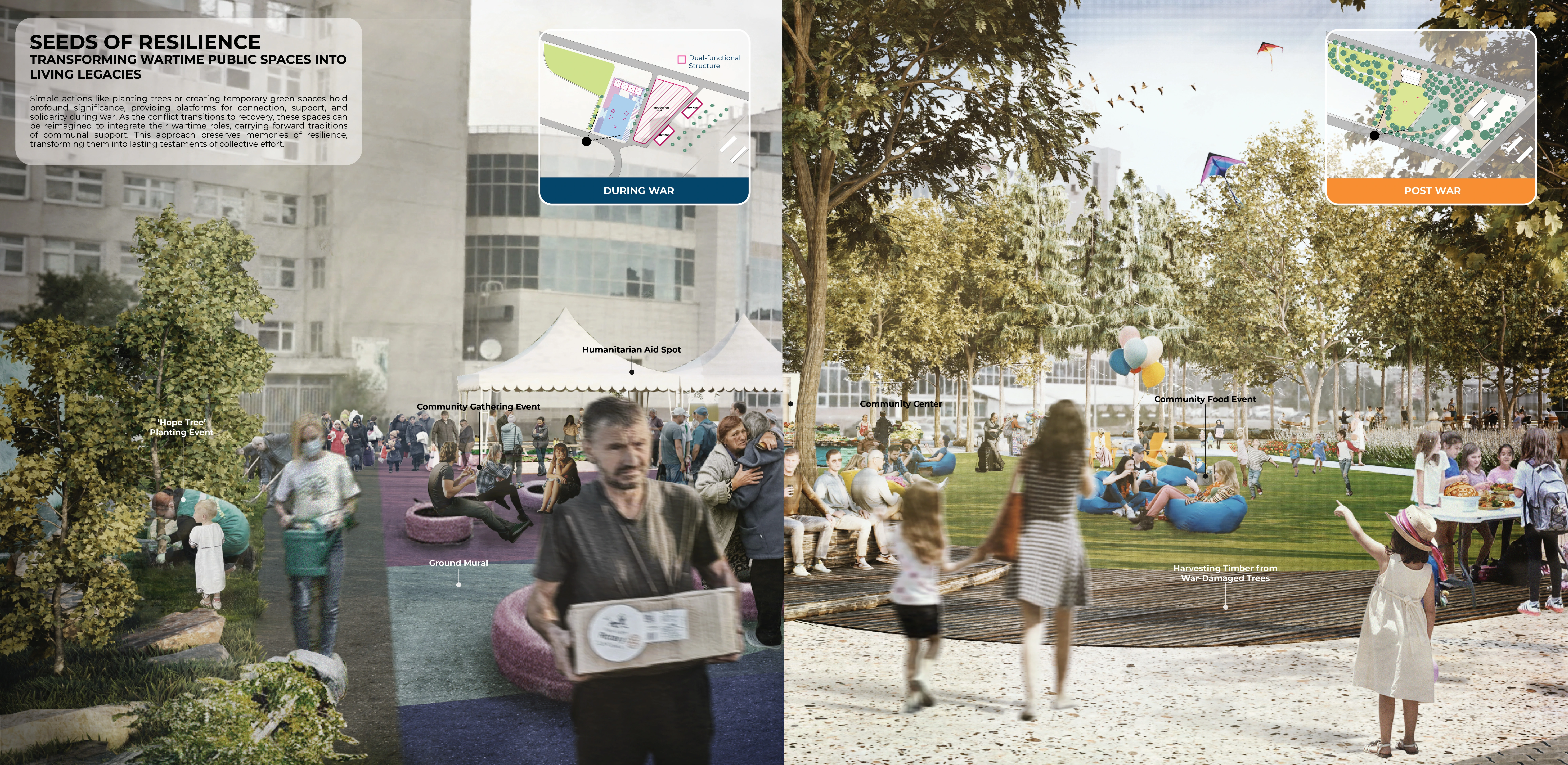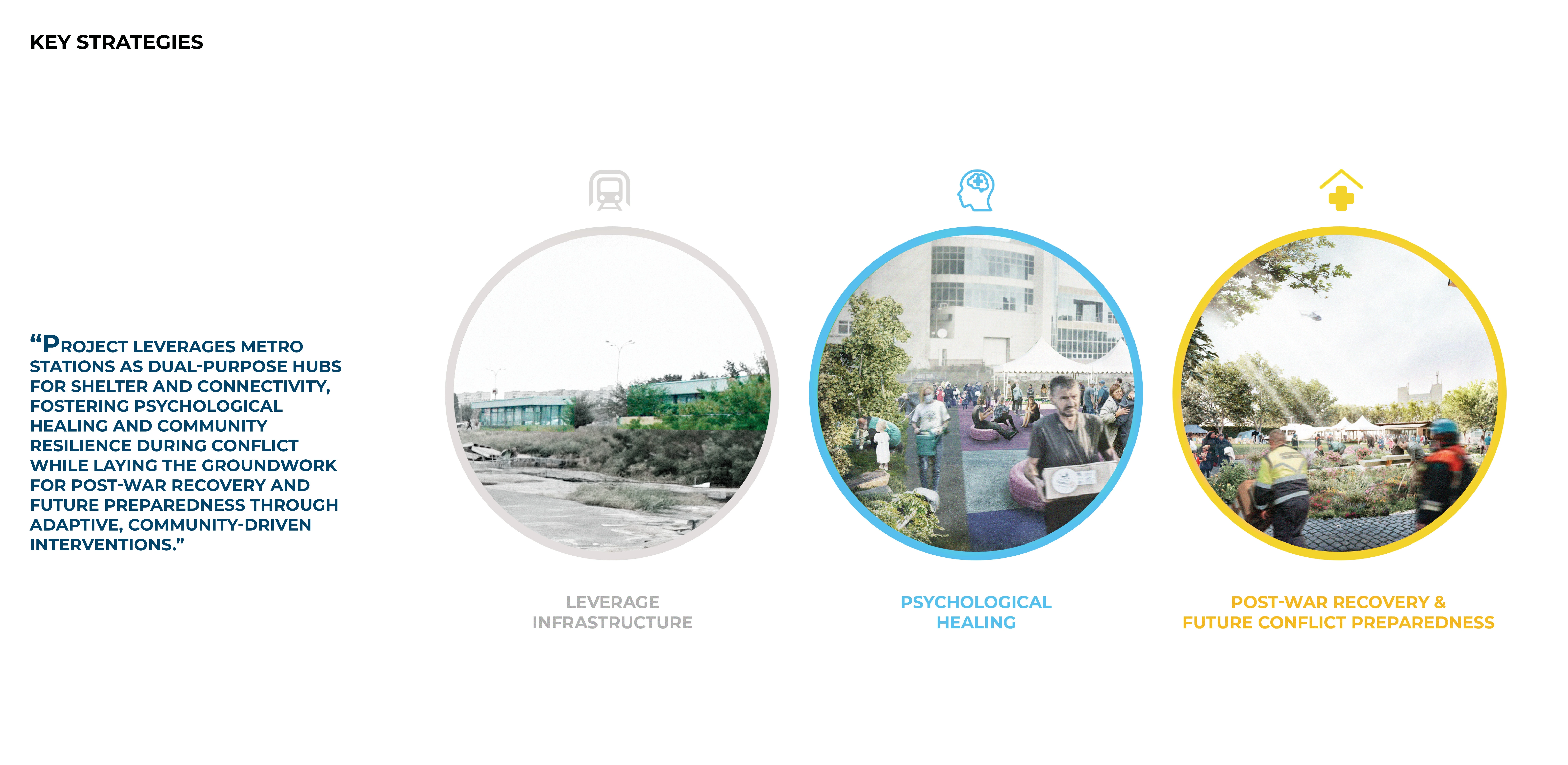 The Ukraine conflict has caused widespread devastation. Modern warfare goes beyond physical destruction, employing psychological tactics to erode trust and deepen social divides. While meeting basic needs is essential, restoring cohesion and resilience must advance in parallel. Landscape architects play a vital role in this effort. During Operation Enduring Freedom, U.S. initiatives like park upgrades and reforestation showed how design can rebuild social ties and stabilize communities. This project carries that idea forward—reimagining metro stations as dual-purpose hubs for shelter and connection, fostering community resilience during conflict, and laying the groundwork for post-war recovery through adaptive, community-led interventions.
