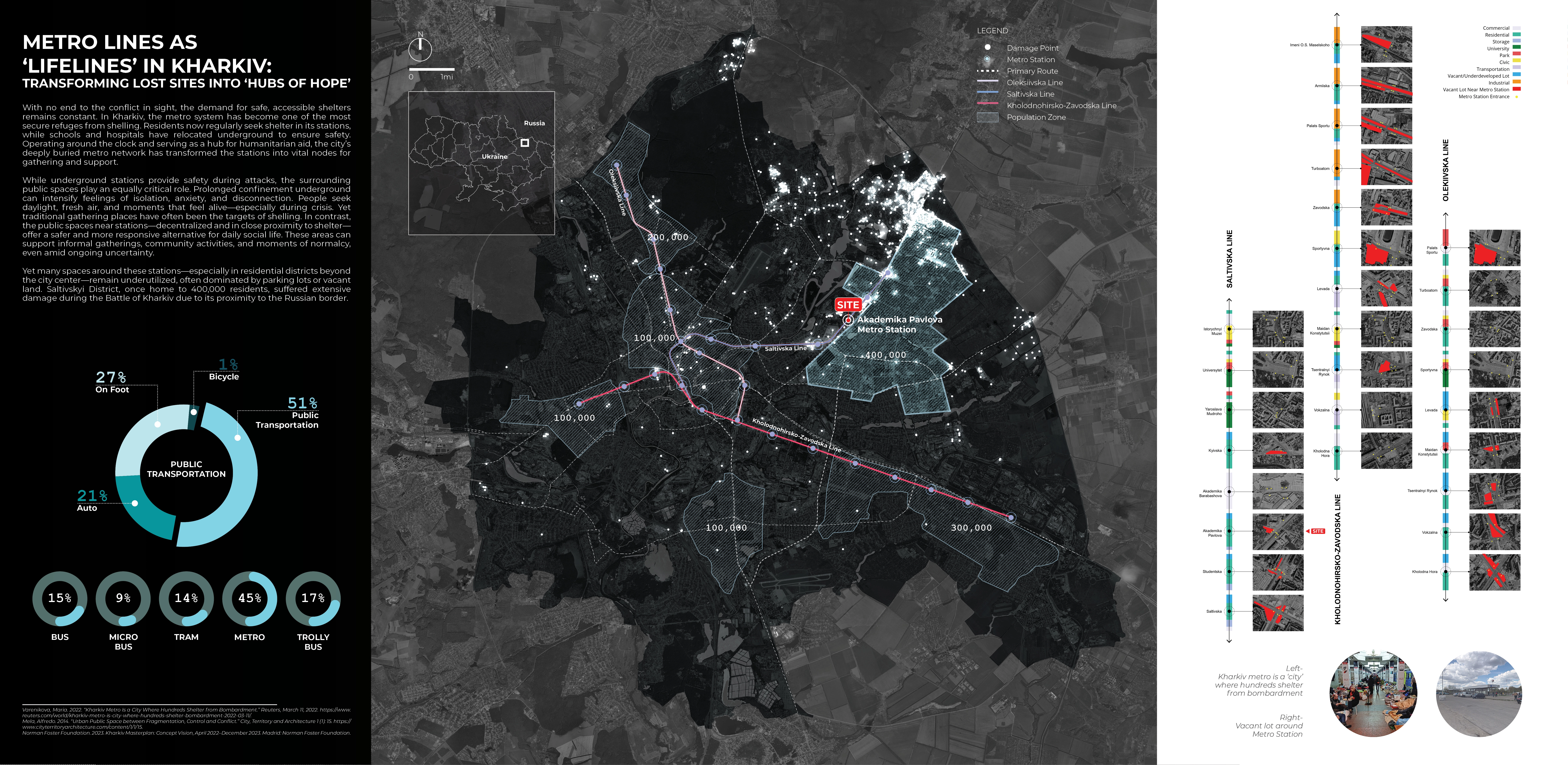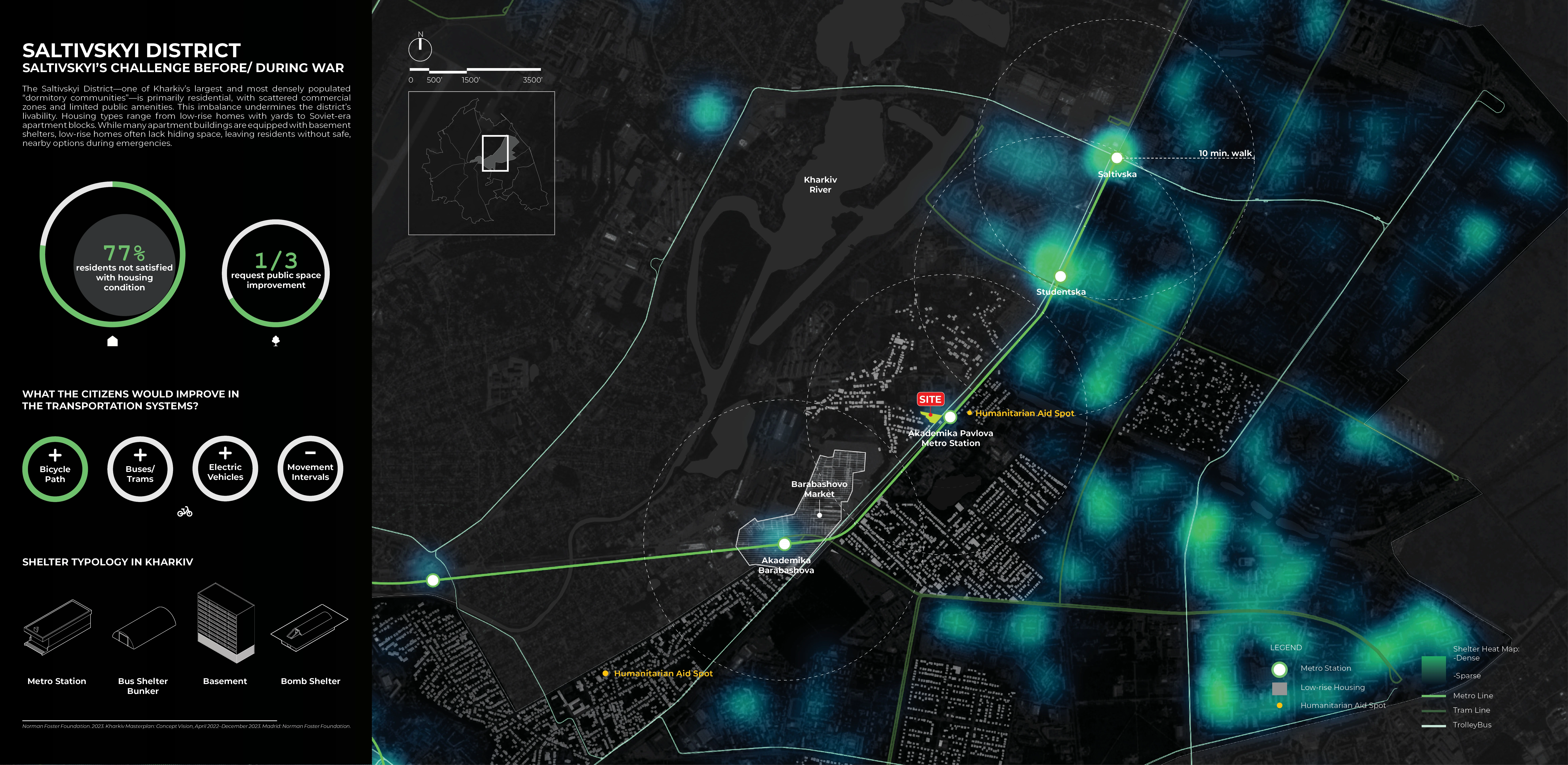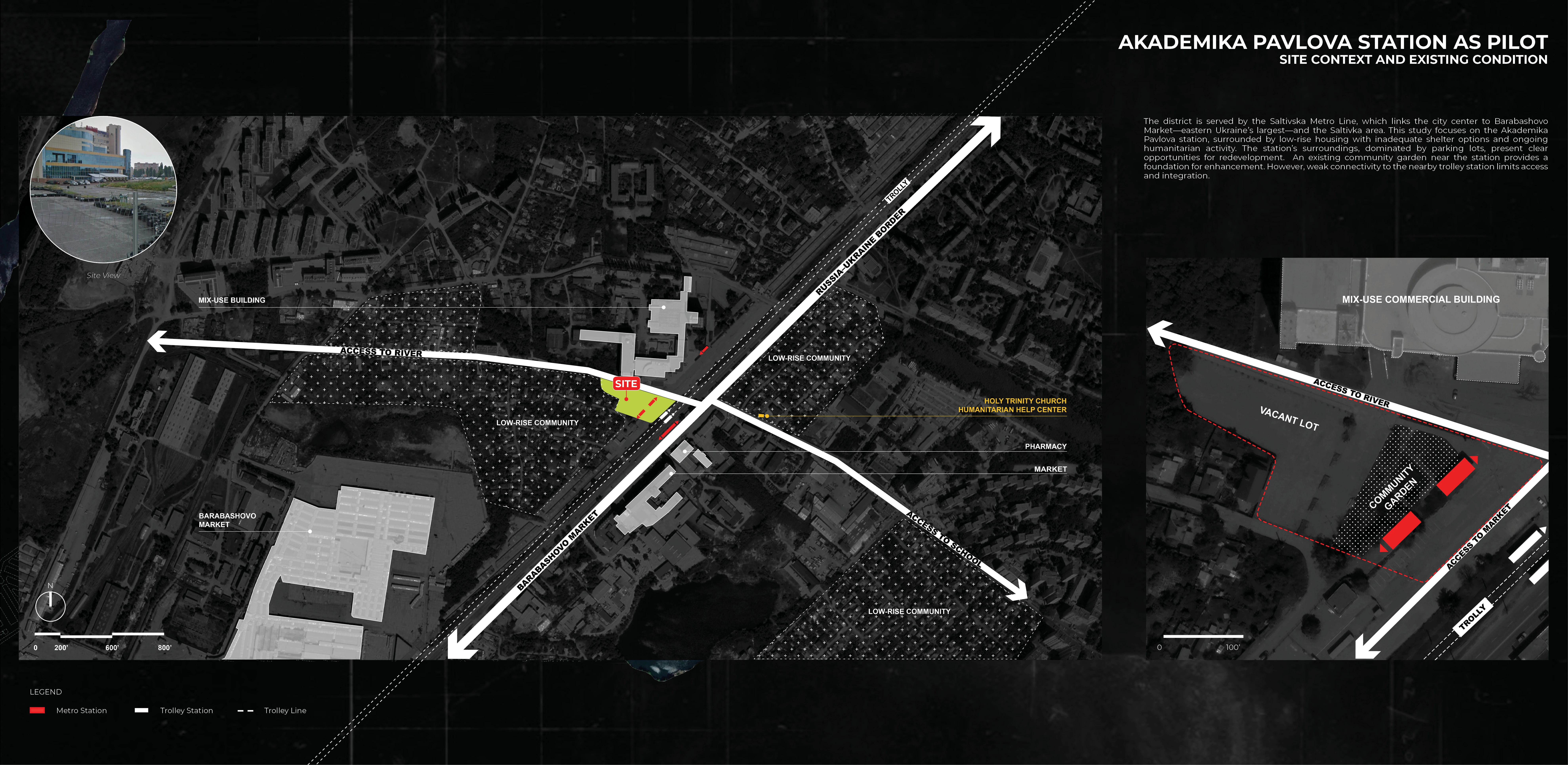 This project centers on Akademika Pavlova Station along the Saltivska Metro Line, located in Saltivskyi District—one of Kharkiv’s largest and most heavily damaged residential areas, marked by limited public space and fragmented commercial activity. The station lies near low-rise housing with insufficient access to shelter and ongoing humanitarian support. Its surroundings, dominated by expansive parking lots, present great potential for redevelopment.