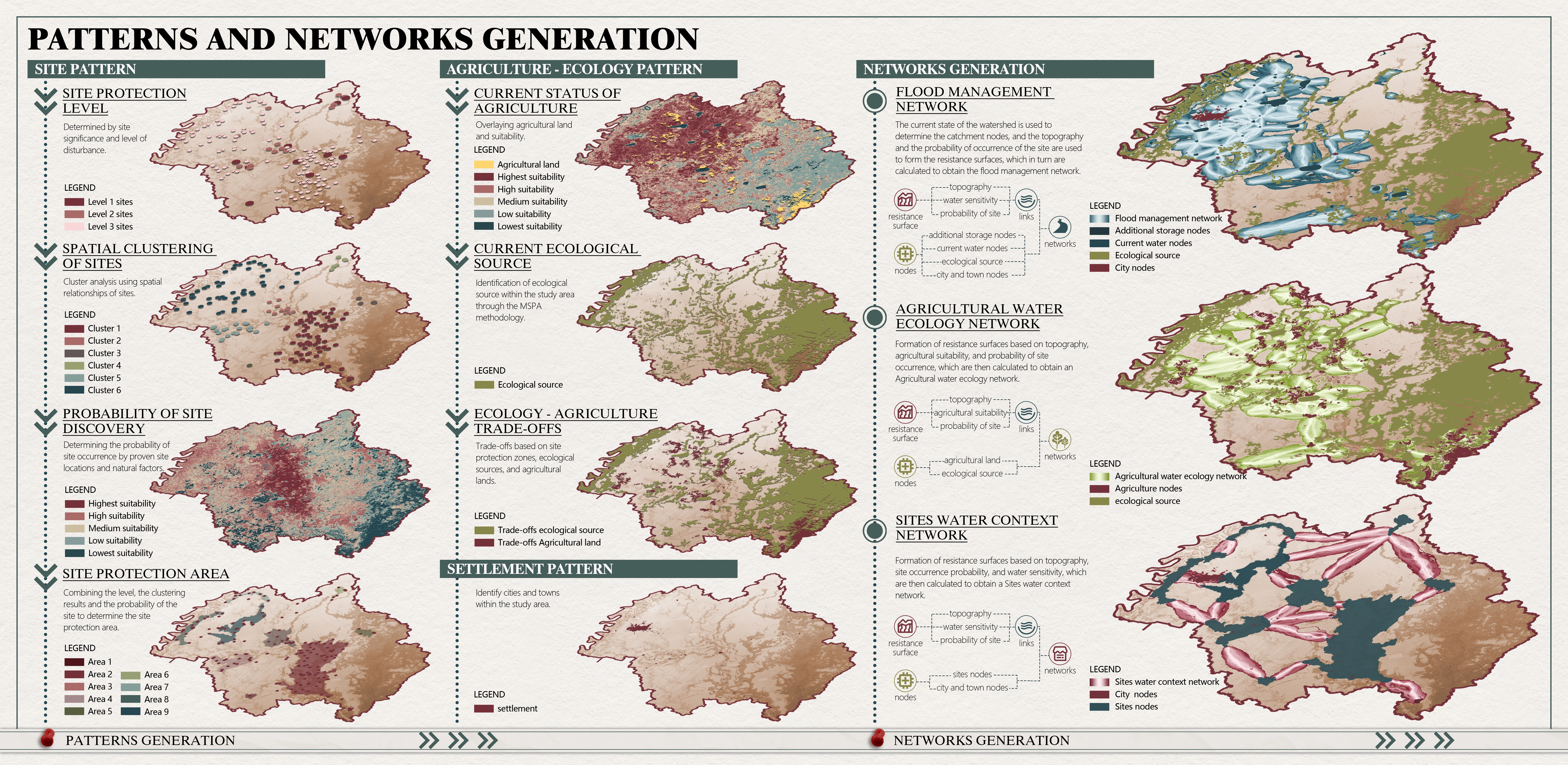 At the network level, we prioritize connectivity by integrating water risks, ecosystem service supply and demand relationships, land use, and sites distribution. At the node level, selected towns, farming communities, and archaeological sites become keystone points for targeted interventions with detailed water storage and drainage strategies.