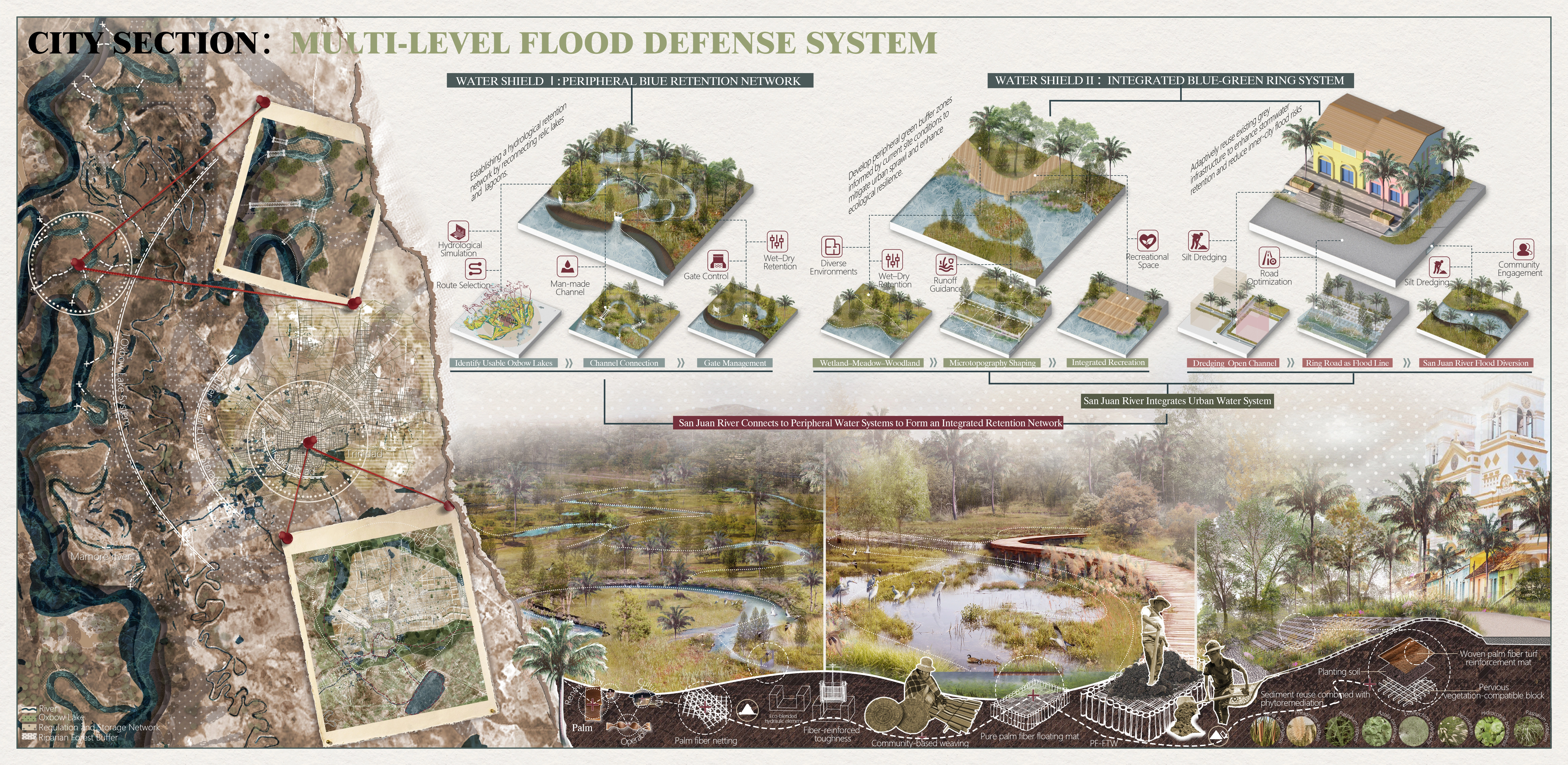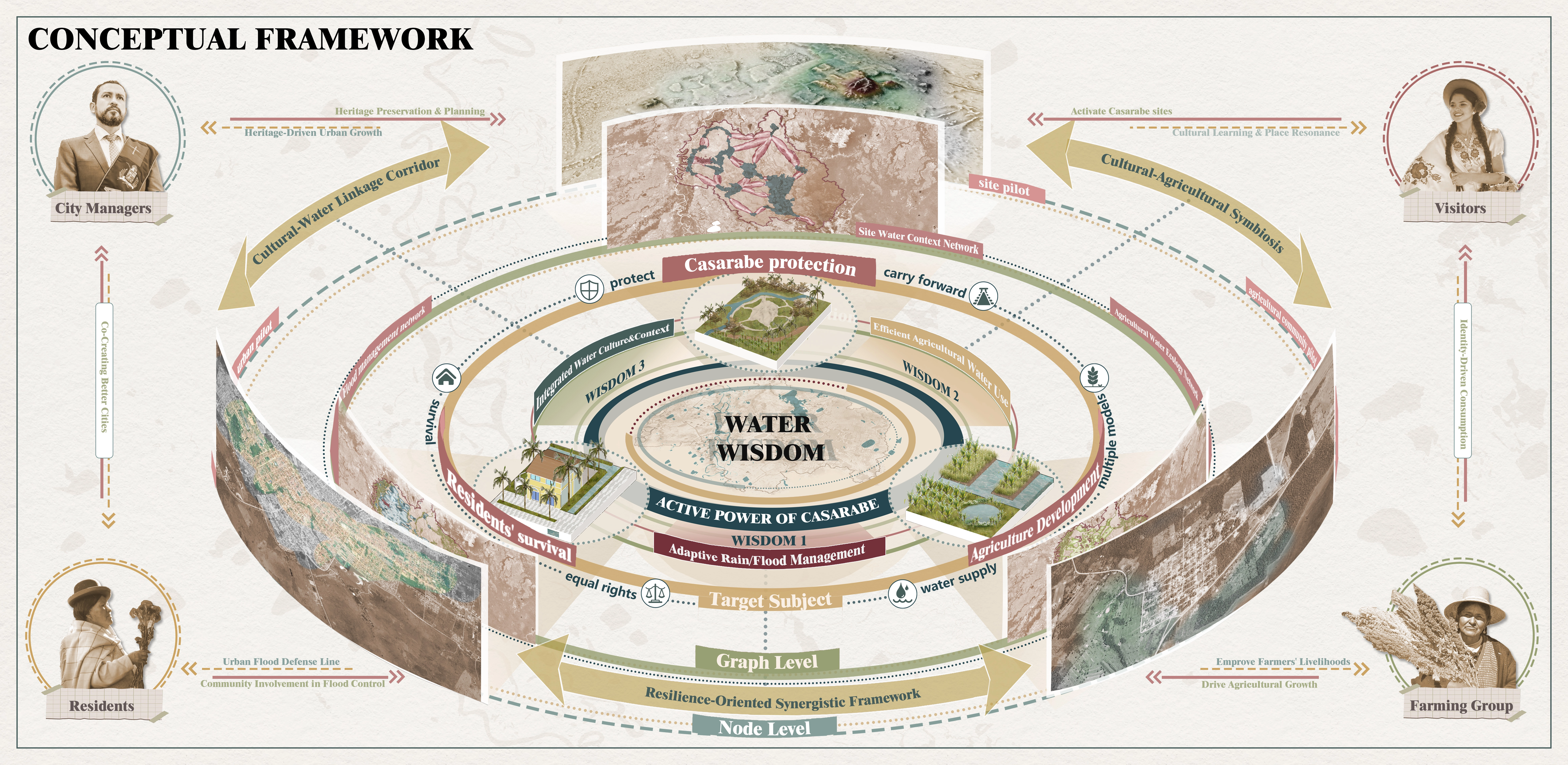 Drawing on ancestral water wisdom, our plan weaves three complementary network systems—Flood Management, Agricultural Water Ecology, and Sites Water Context—into a unified framework:
